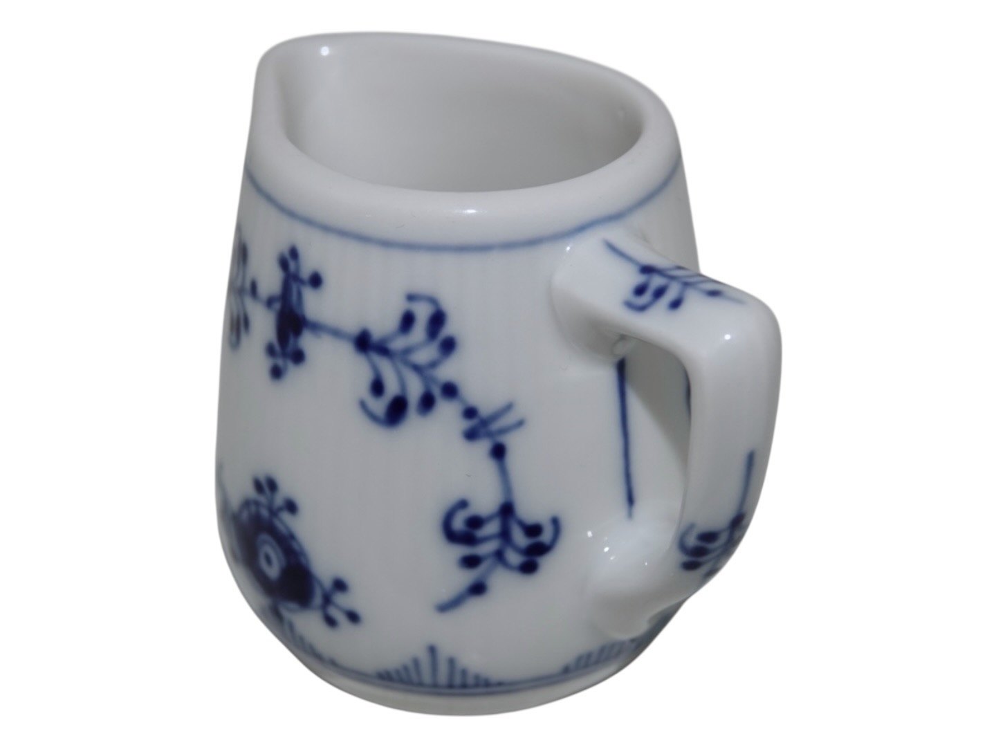 Beskrivelse: Royal Copenhagen Musselmalet Riflet i tykt jernporcelæn, miniature flødekande.