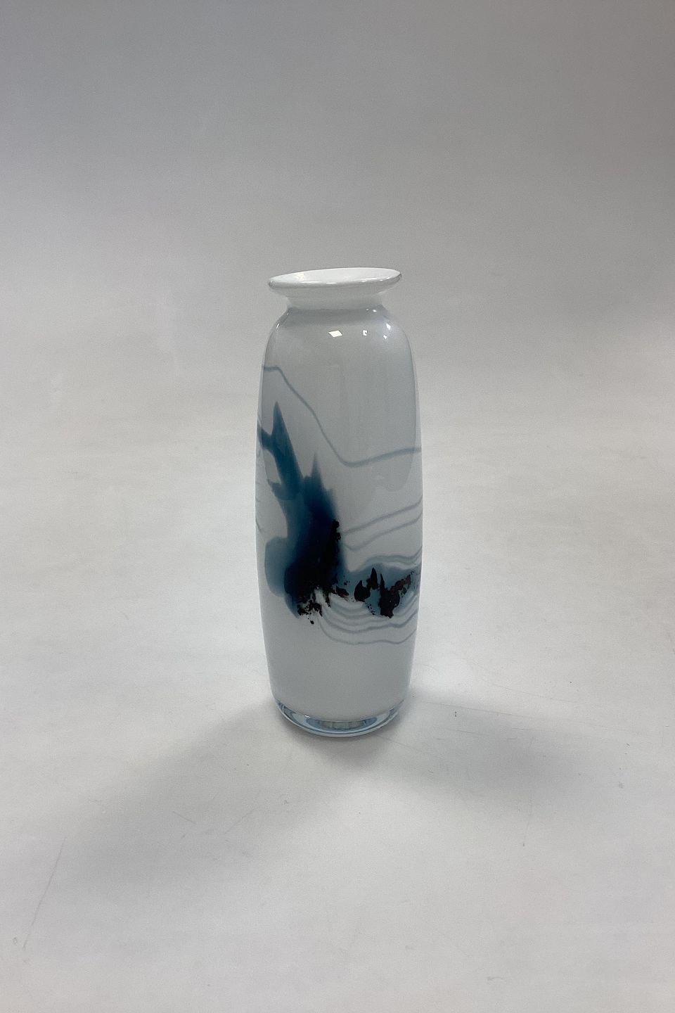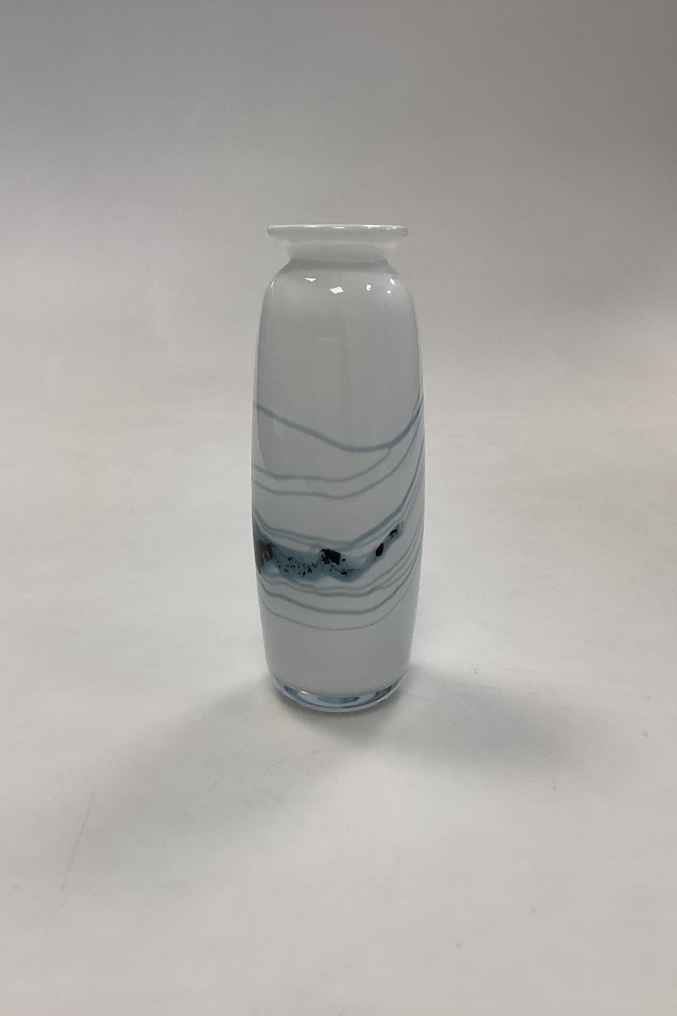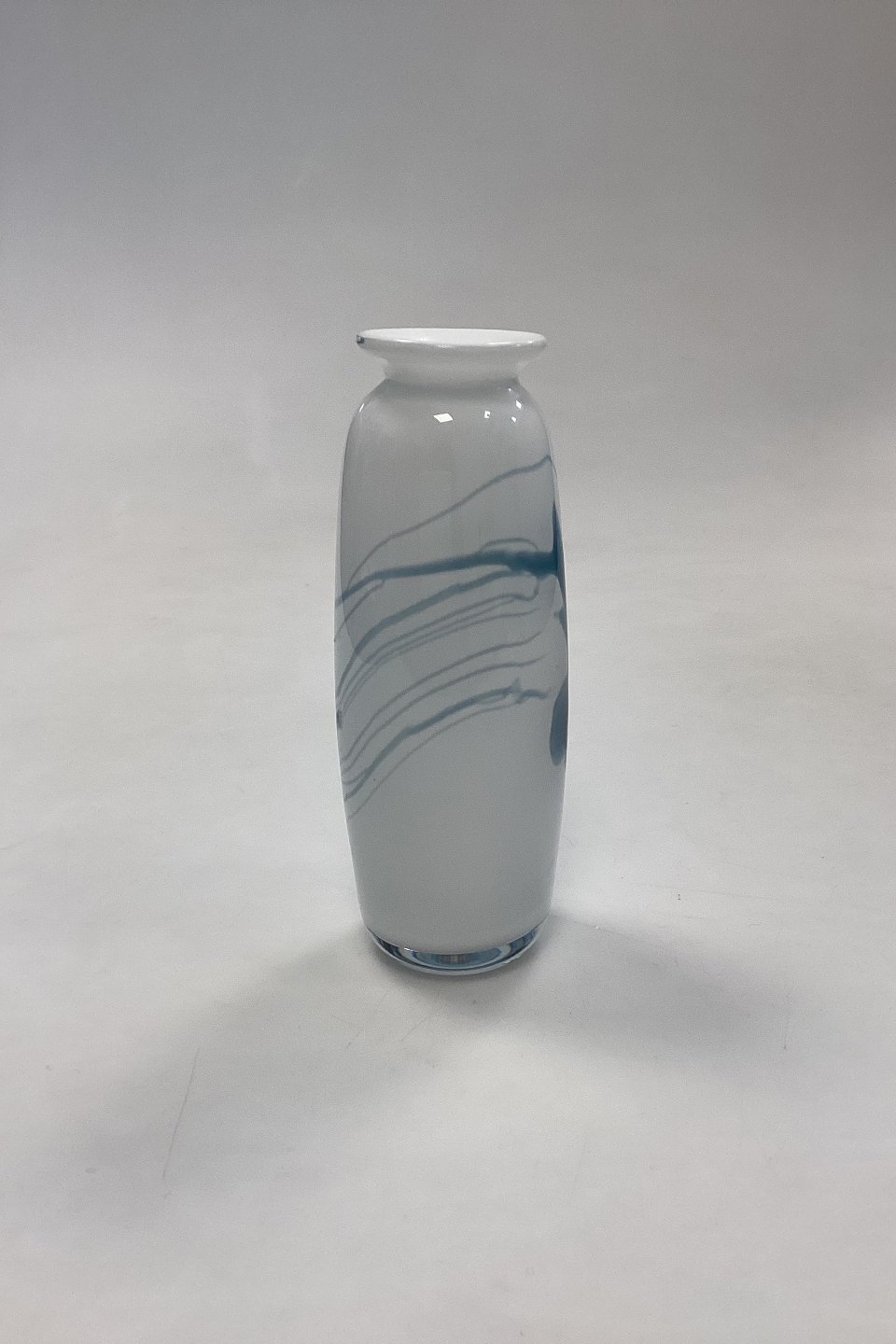 Beskrivelse: Holmegaard Atlantis Vase. Hvid med blå dekoration. Designet af Michael Bang.