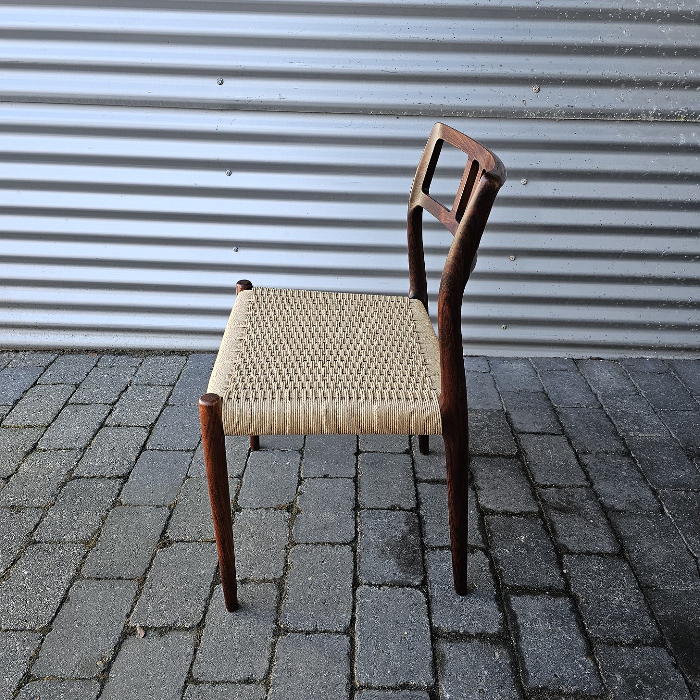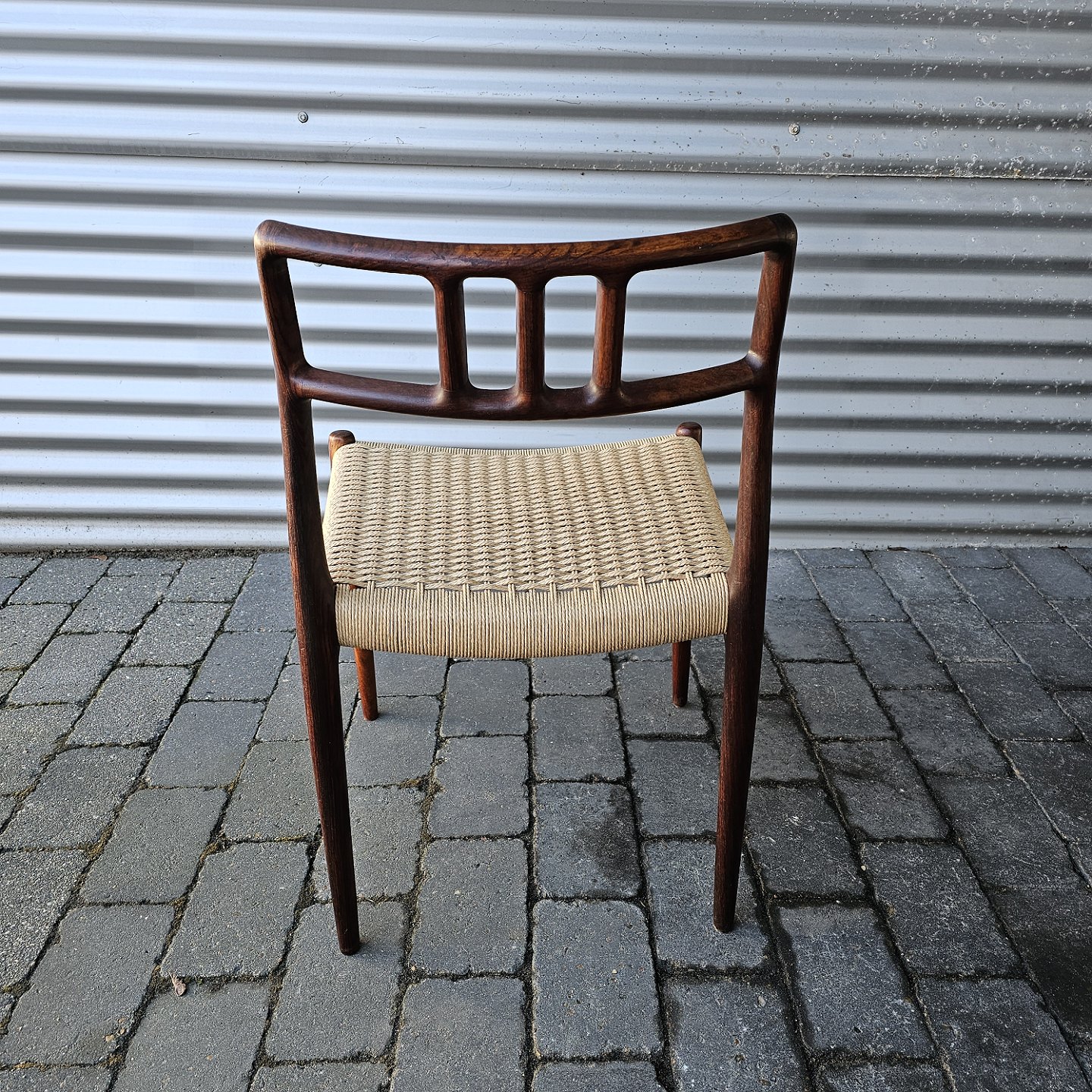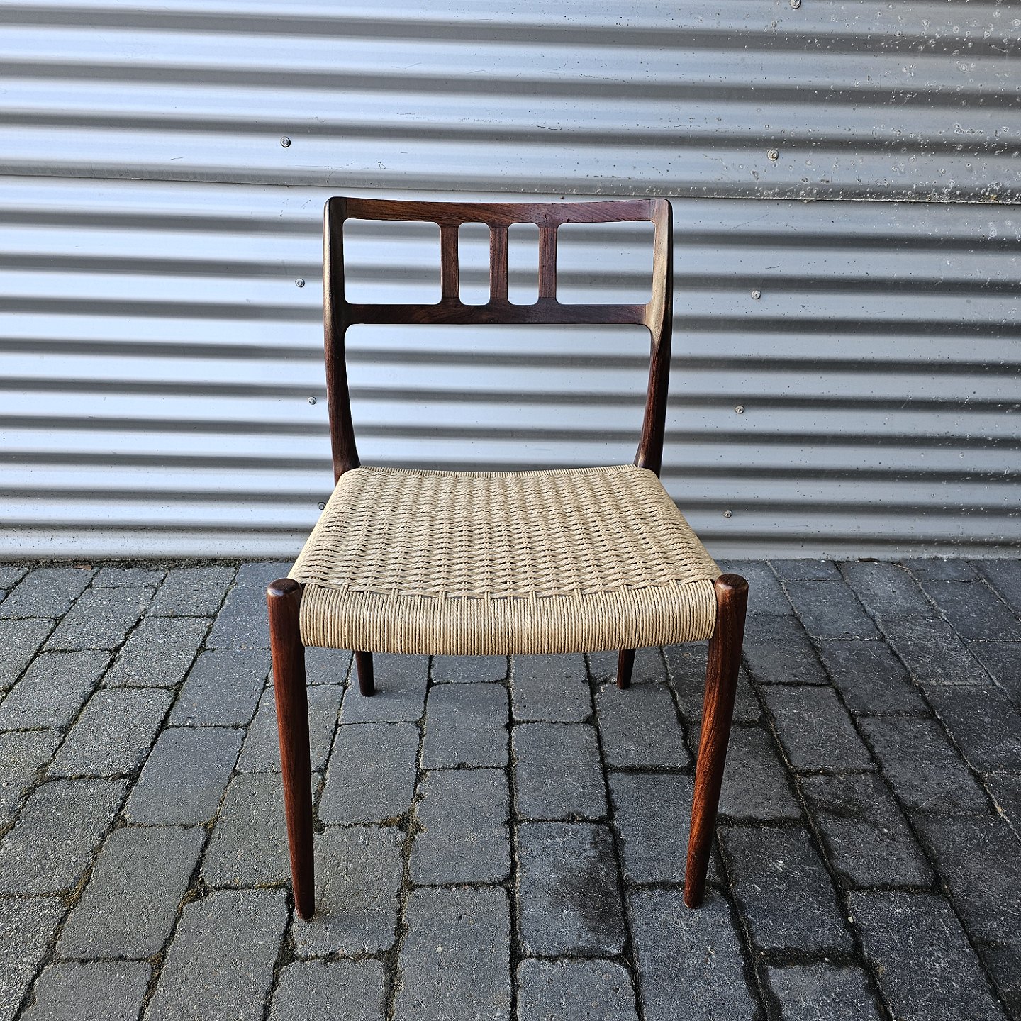 Beskrivelse: Sæt med fire styk spisebordsstole model 79 i palisander med ny flettede sæder