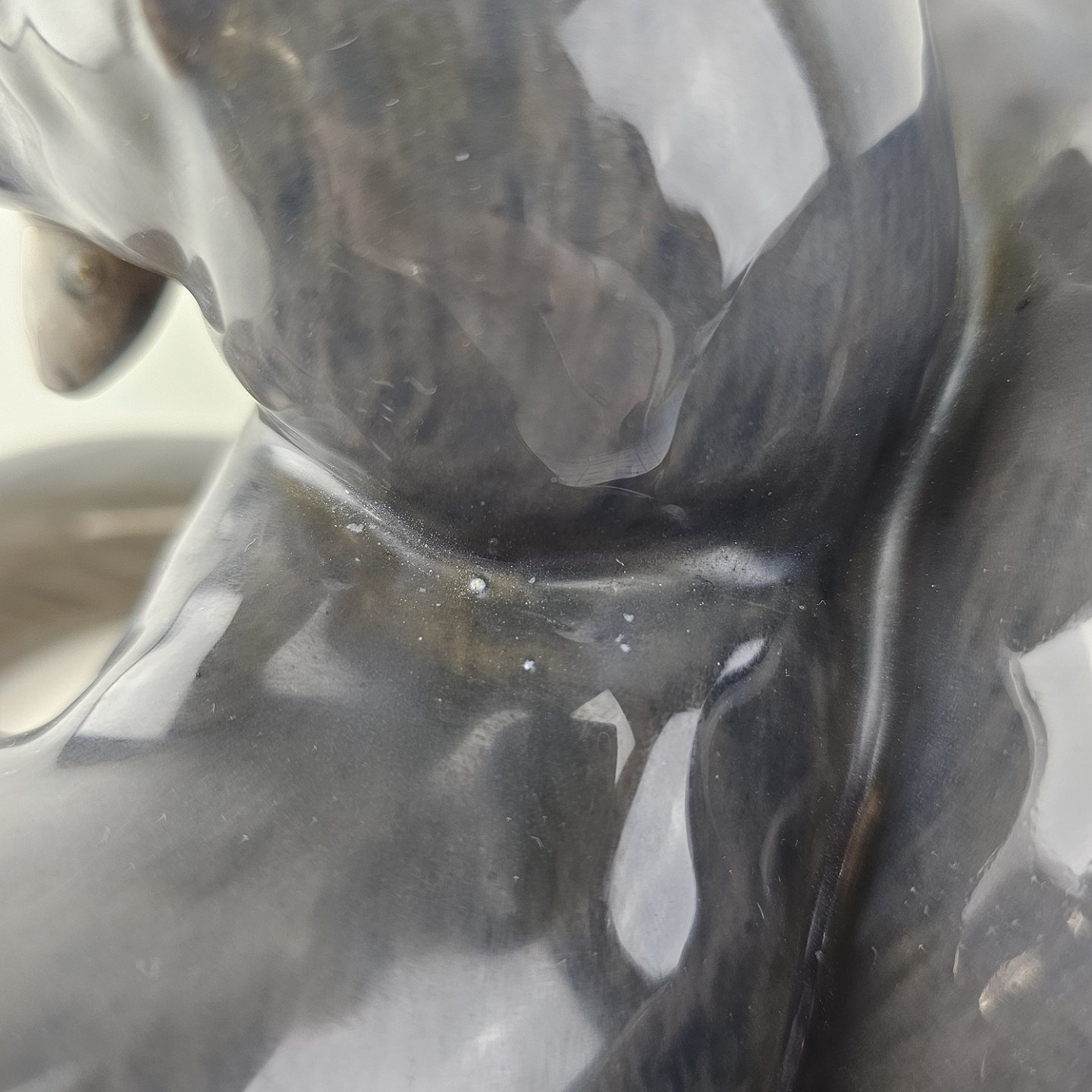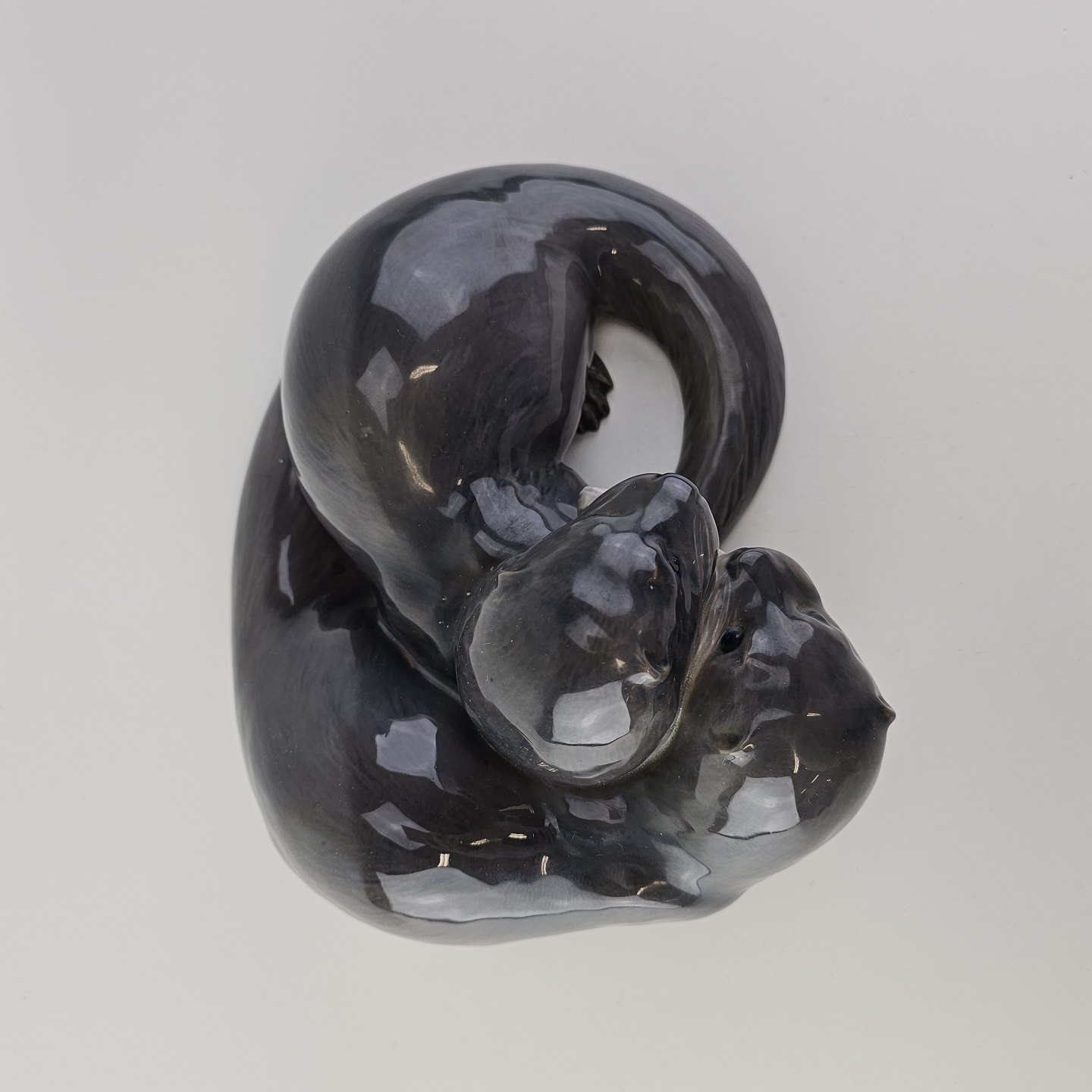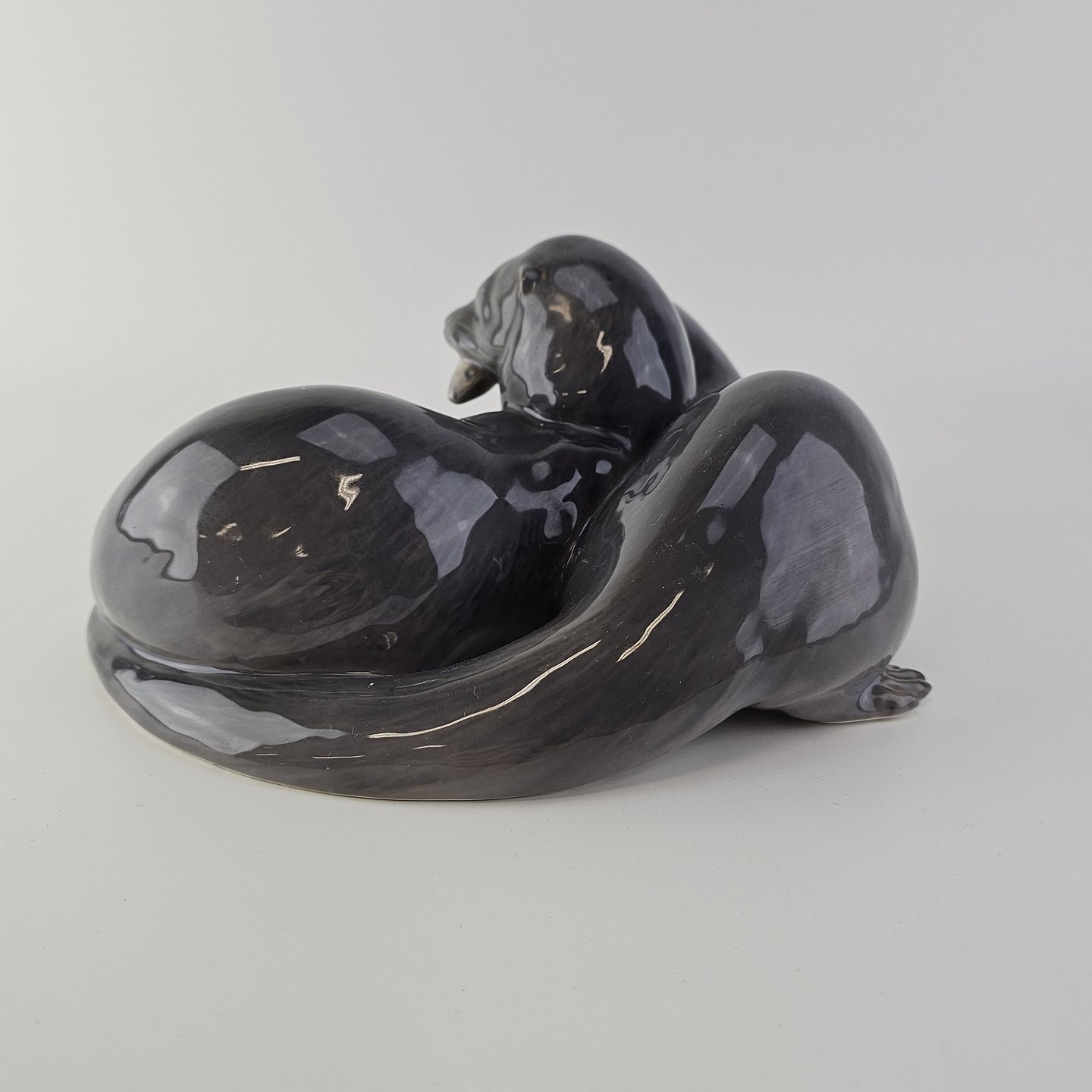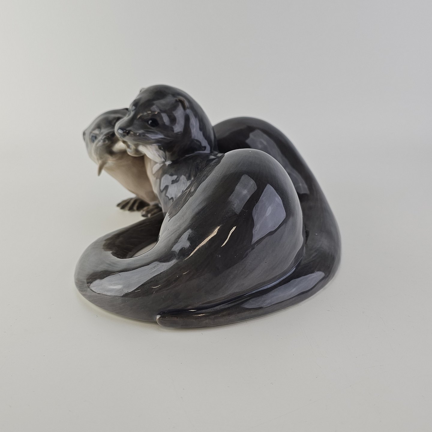 Beskrivelse: Sjælden figur i kongeligt porcelæn med motiv af to oddere og en fisk