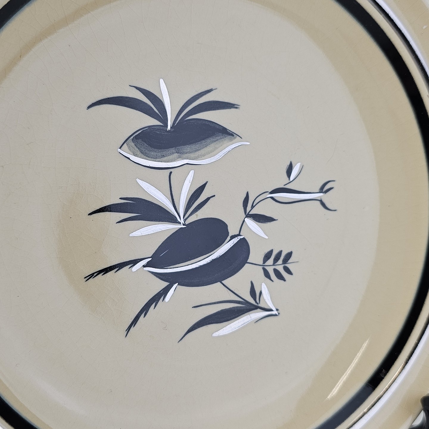 Råhvidt fajancestel i stelform E med dekoration af naturmotiver i sølv og sort farve.