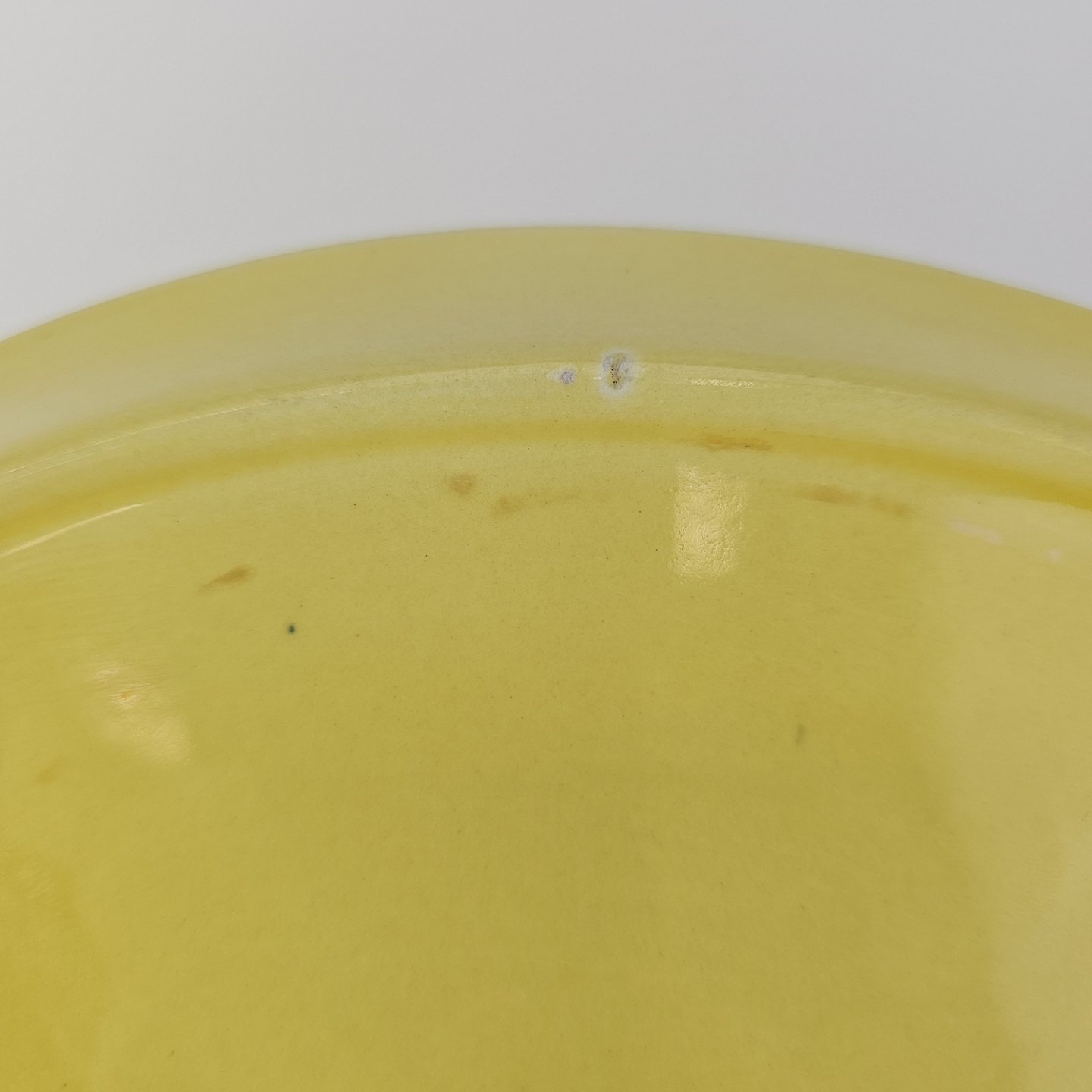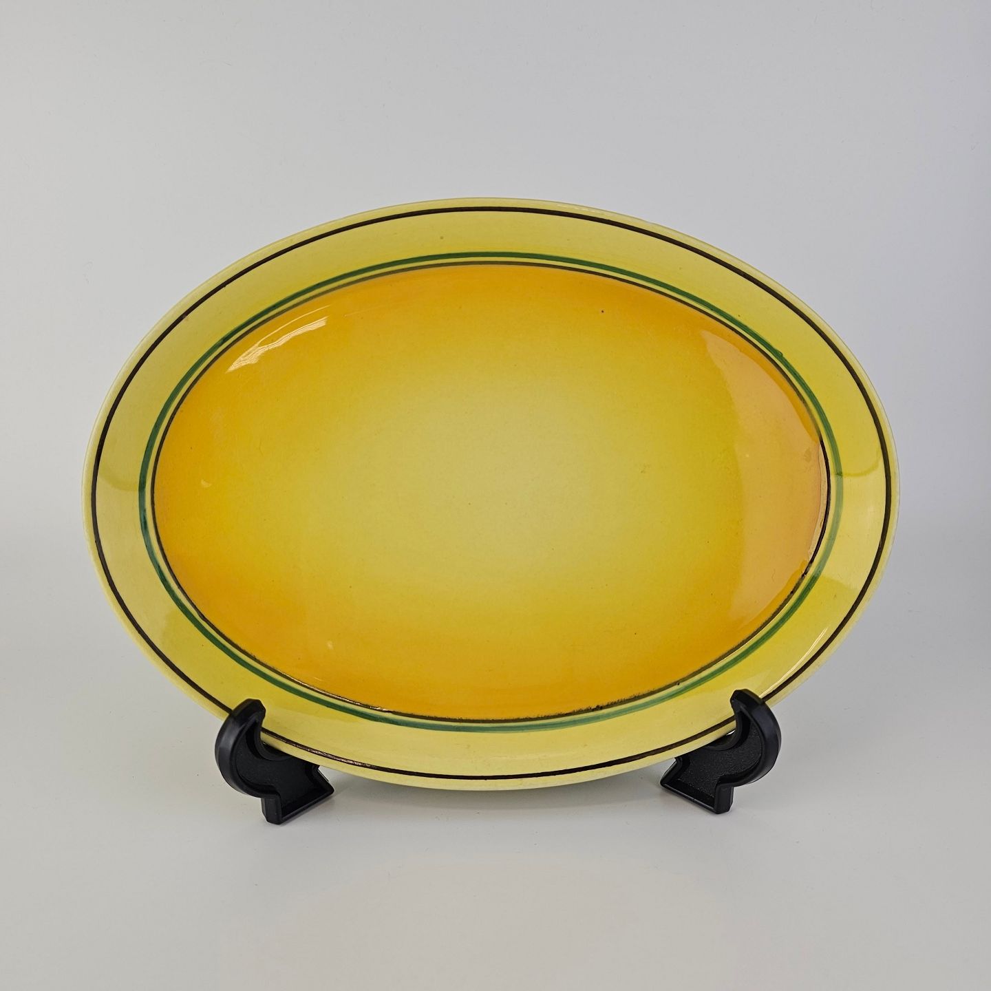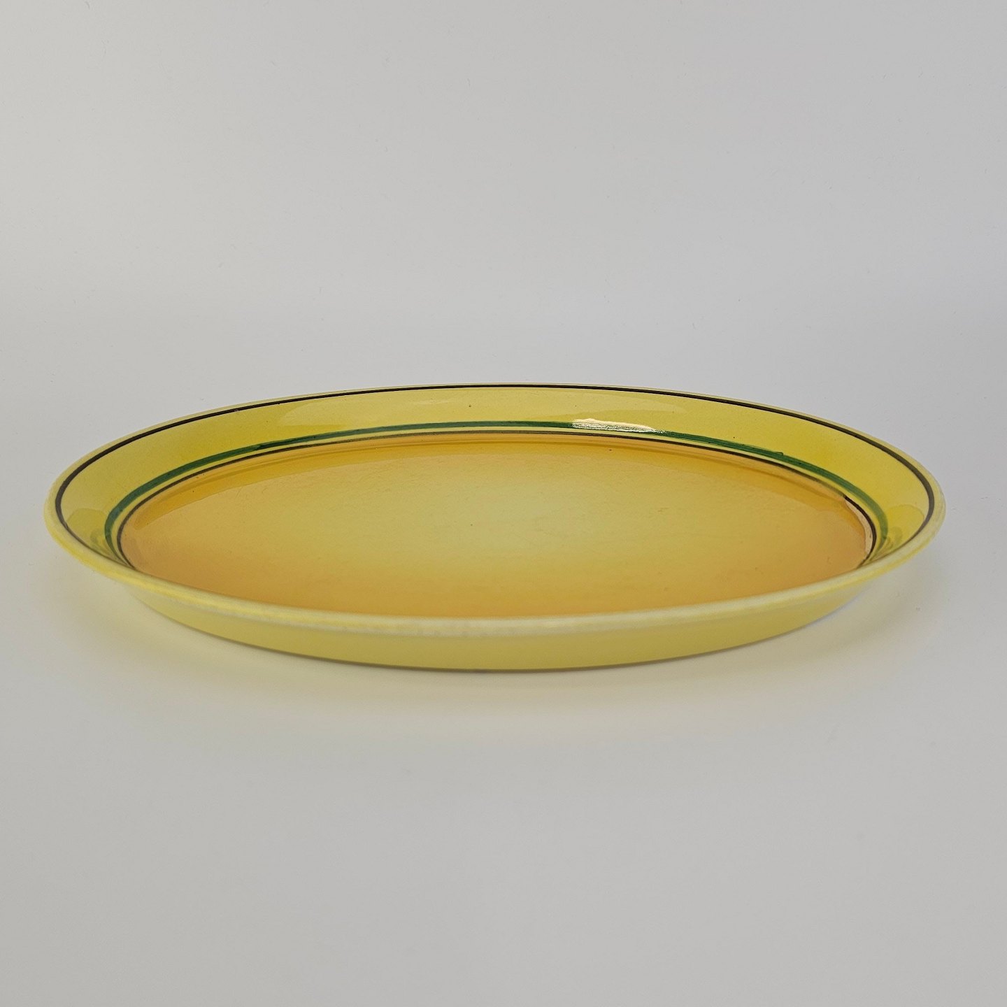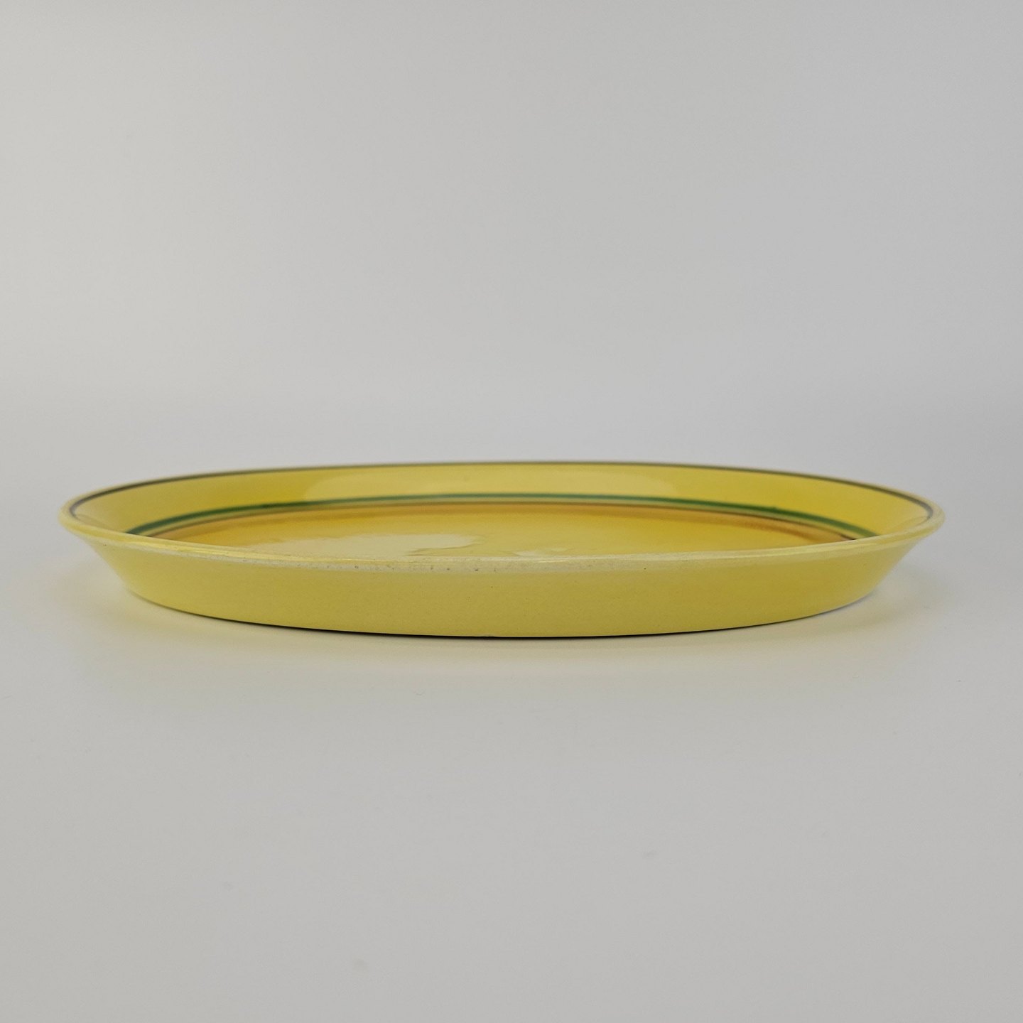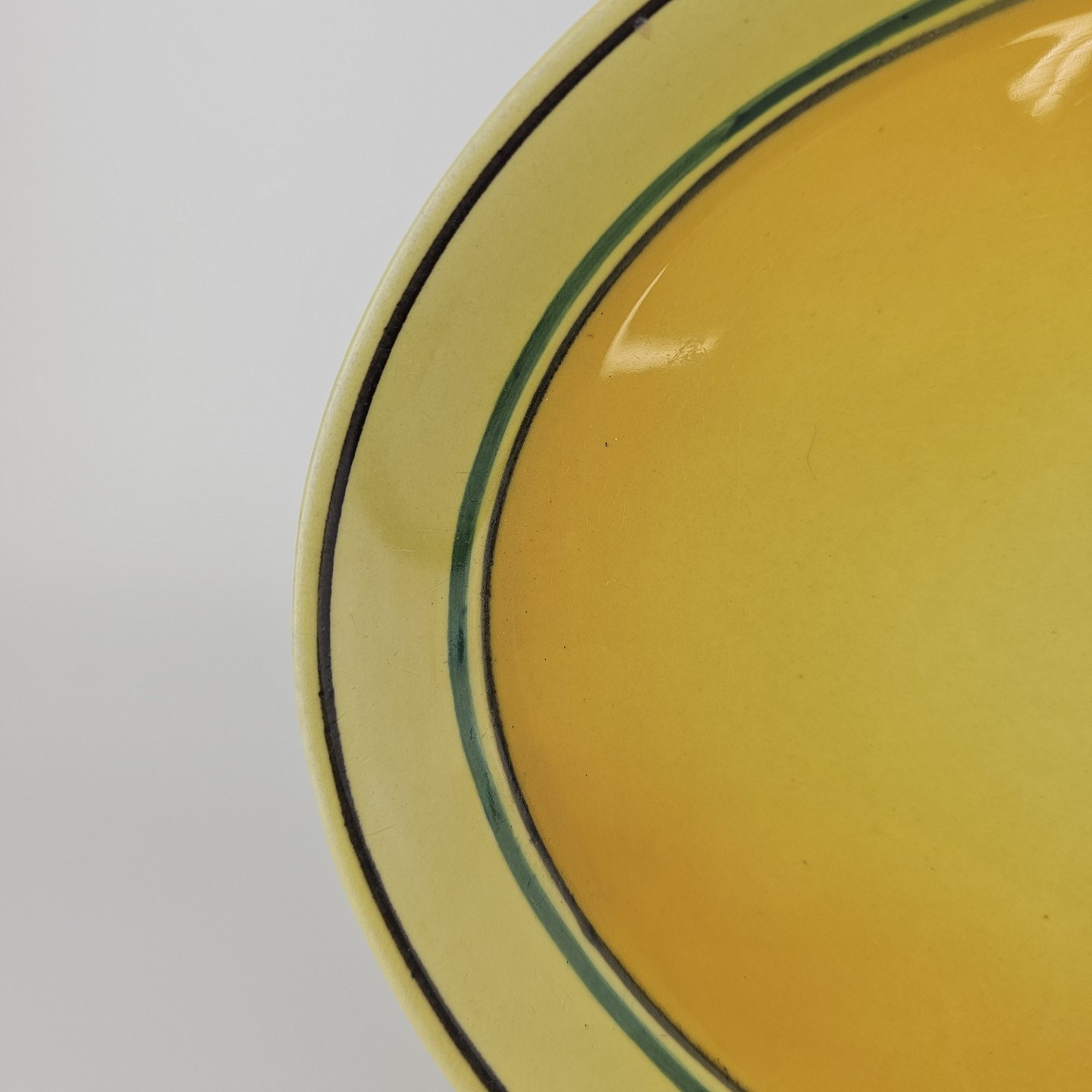 Fajancestel i stelform C med dekoration i gule nuancer med grøn stribe.
