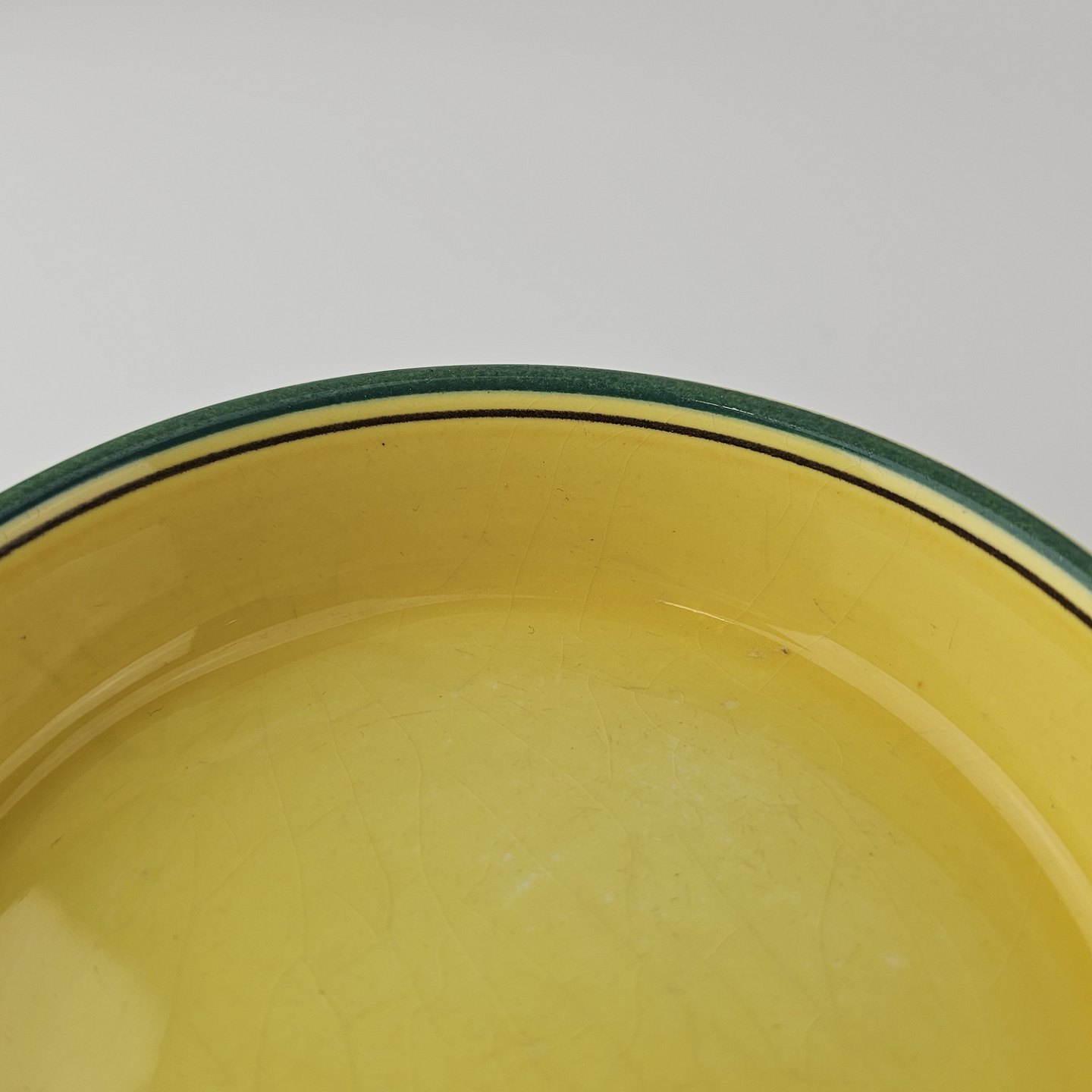 Fajancestel i stelform C med dekoration i gule nuancer med grøn stribe.