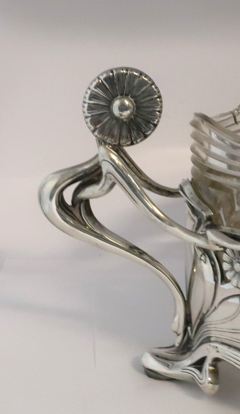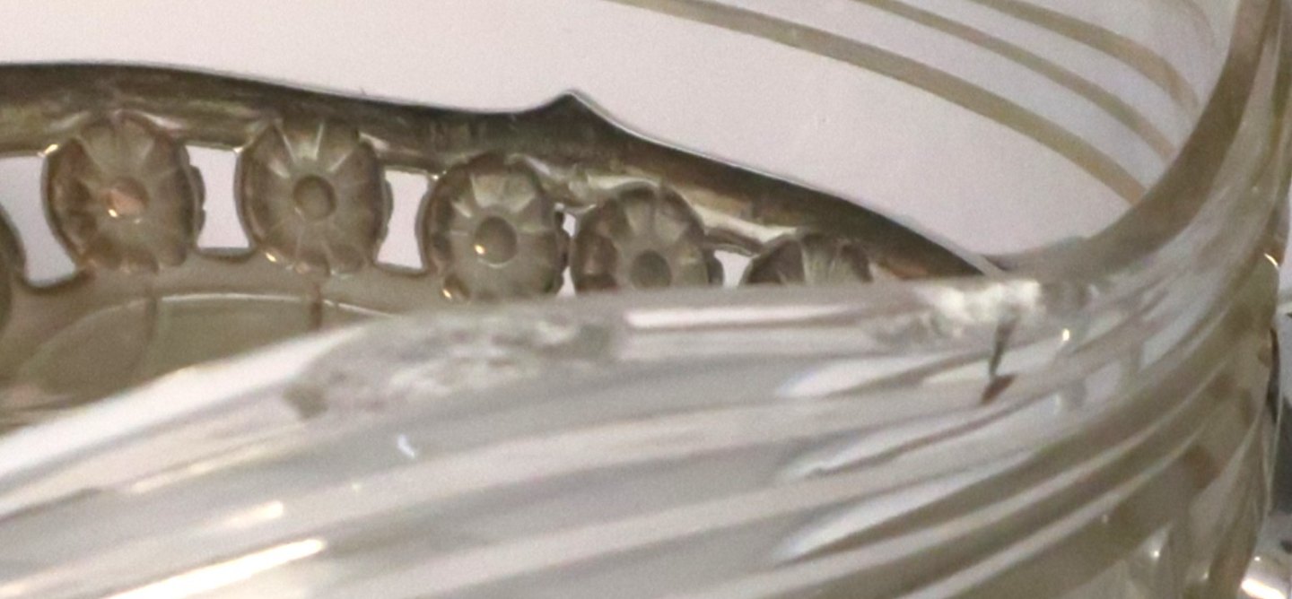 C.G.Hallberg, Sverige. Stor jardinere af sølv med glasinsats (830). Længde 46 cm. Produceret 1912 (K7). Der er 2 afslag på glas (se foto).