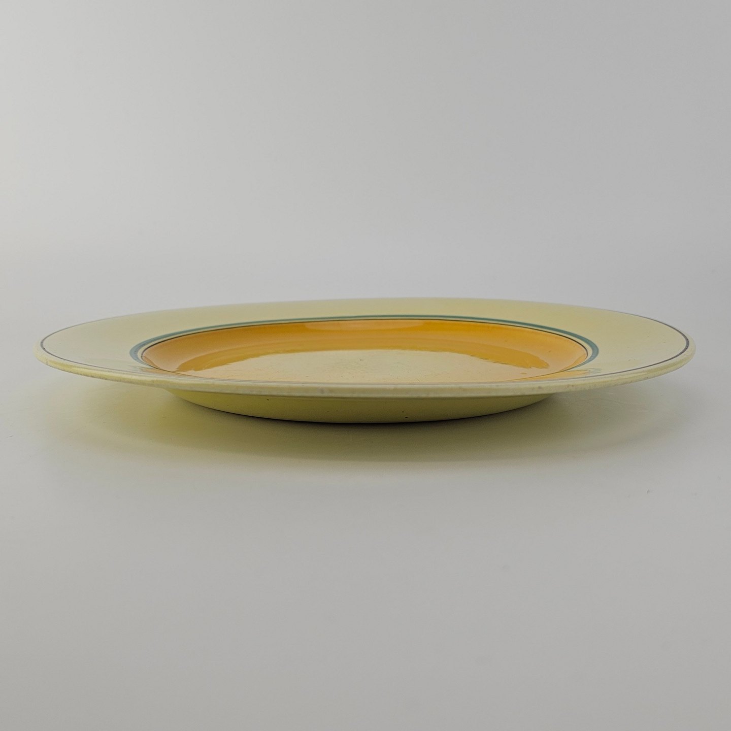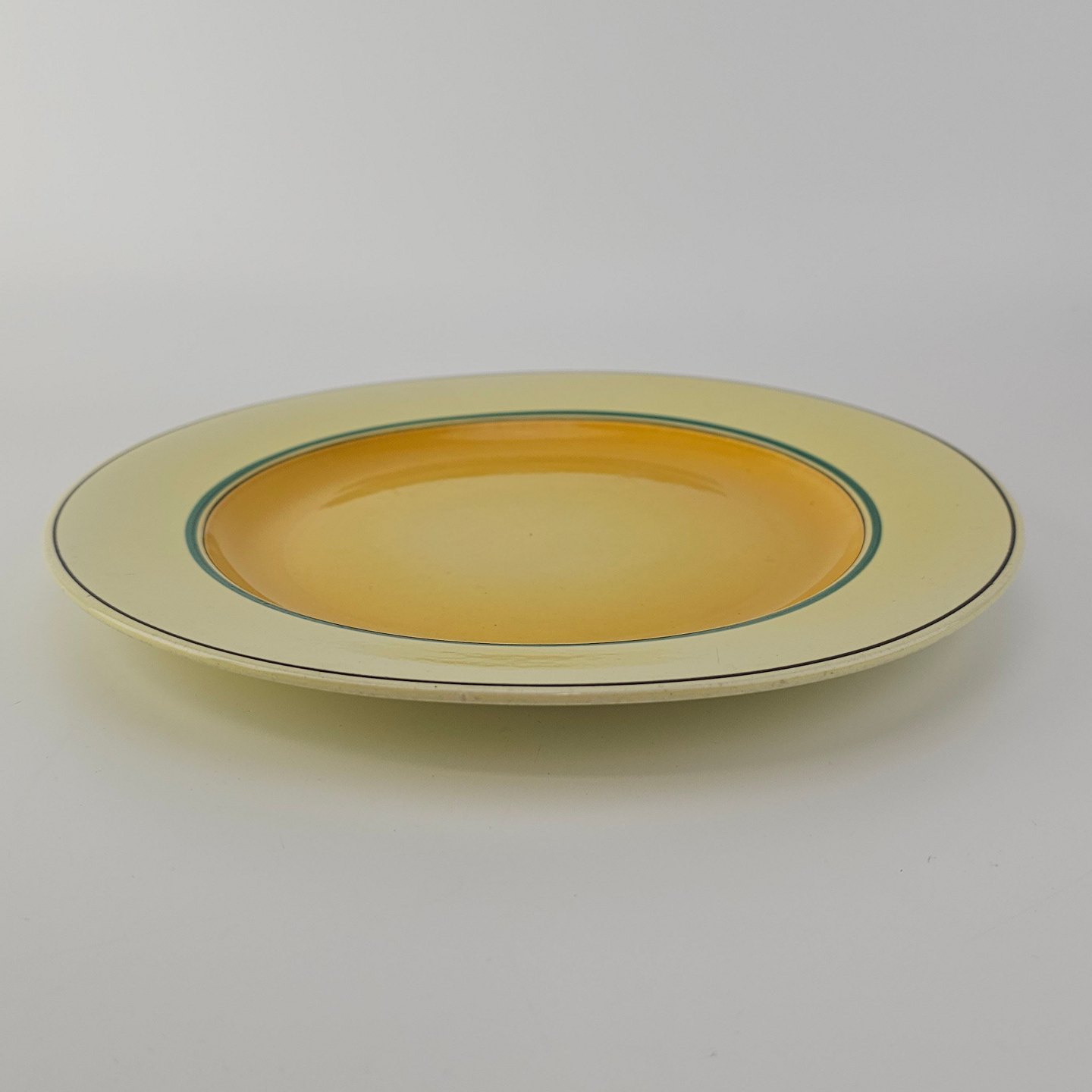 Fajancestel i stelform C med dekoration i gule nuancer med grøn stribe.