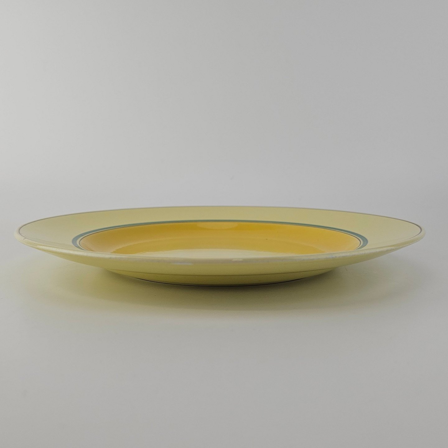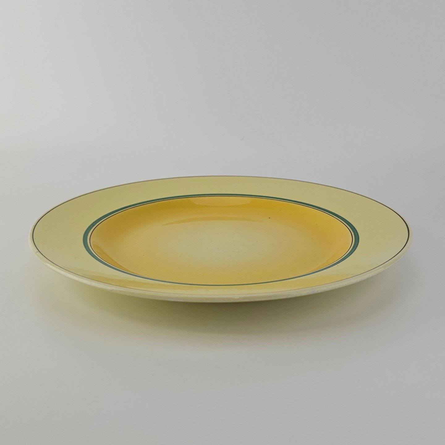 Fajancestel i stelform C med dekoration i gule nuancer med grøn stribe.