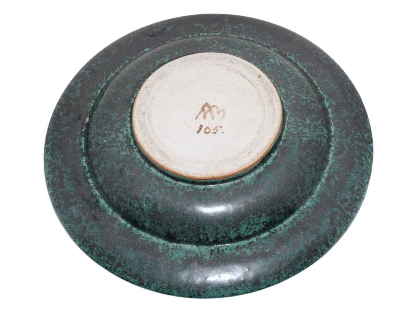 Beskrivelse: Arne Bang keramik, stort rundt fad med en mørkegrøn glasur.