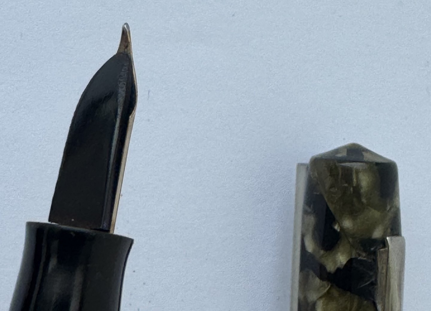 Beskrivelse: REN ART DECO STIL: 10 kantet og grøn marmoreret Miller nr. 697 fyldepen fra omkring 1940. I god stand uden skader eller reparationer. Alle dele originale til denne model inklusive en 14 karats guldspids (ca. 0,30 gram). Ny gummisæk skal indsættes før den igen kan optage blæk og skrive påny. Ny gummisæk kan indsættes for et tillæg på kr. 250,00. Fyldepennen er 12,3 cm lang.