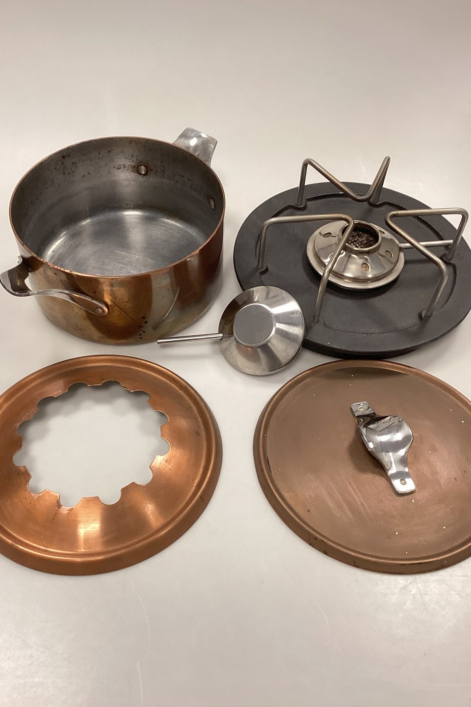 Beskrivelse: Georg Jensen fondue grydesæt i Kobber, bundfad i støbejern