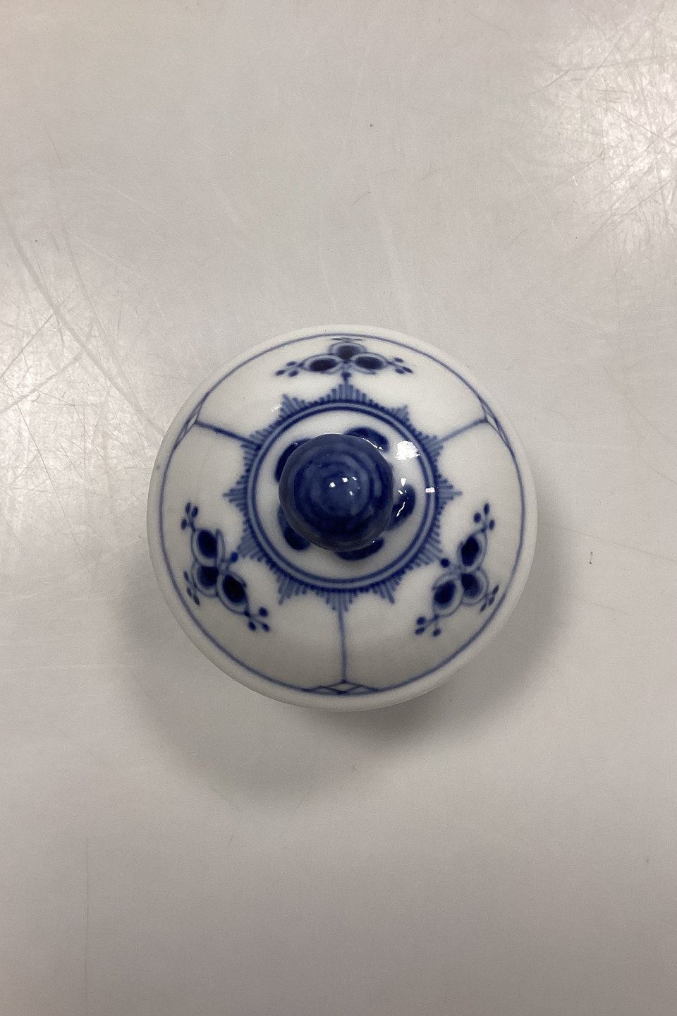 Beskrivelse: Royal Copenhagen Musselmalet Riflet Låg til Kaffekande No. 48. Indre diameter måler 4,9 cm / 1,93 in. 1. sortering med lille afslag på inderkanten.