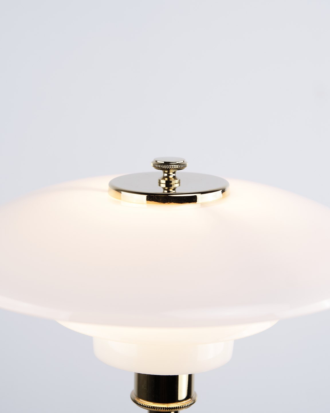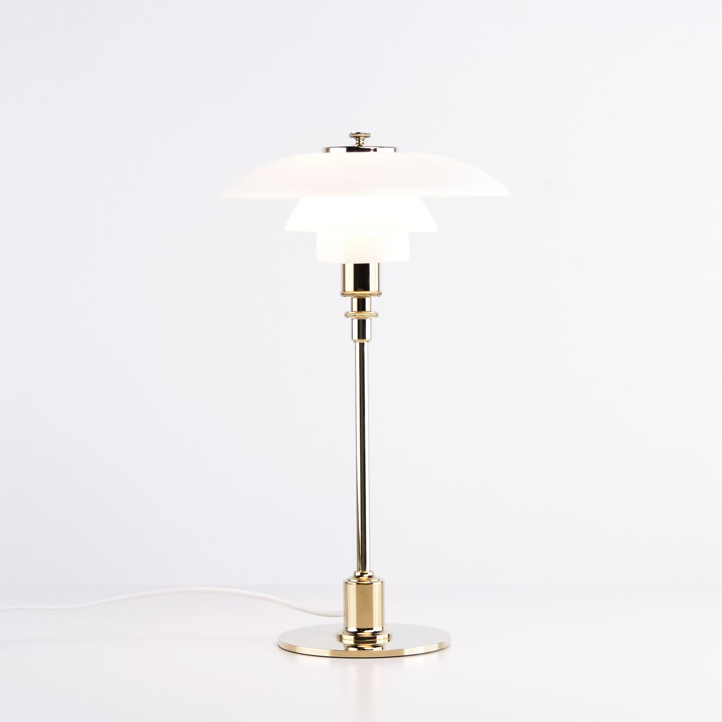Beskrivelse: PH 2/1 bordlampe designet af Poul Henningsen og introduceret i denne version af Louis Poulsen i 2019. Lampen er udført med fod i messing og skærme i hvidt opalglas, som giver et blødt og behageligt lys. Det ikoniske treskærmssystem er udviklet til at sikre optimal lysfordeling og minimere blænding.