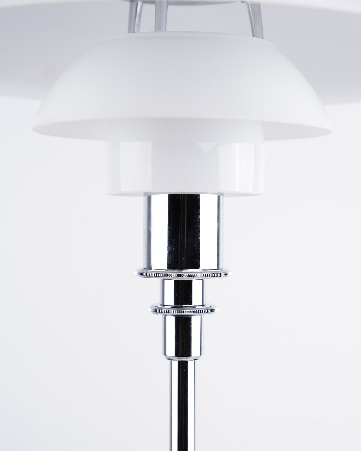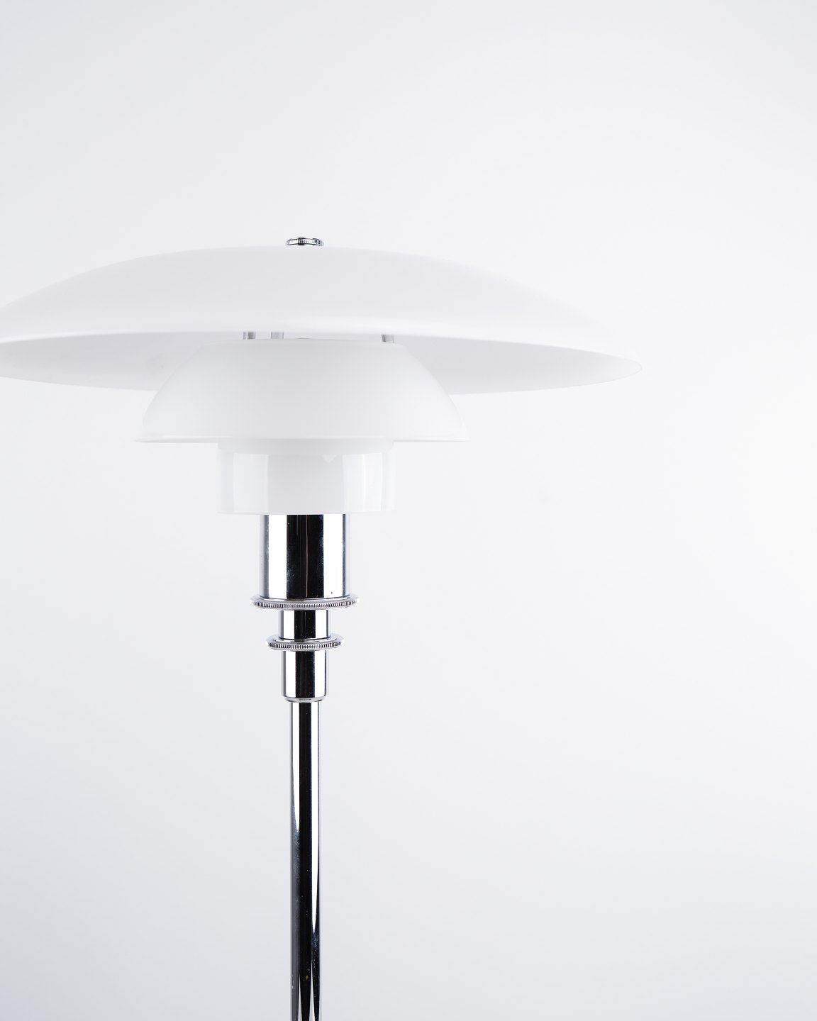 Beskrivelse: PH 3/2 bordlampe designet af Poul Henningsen og fremstillet af Louis Poulsen. Lampen er udført med skærme i hvidt opalglas, som sikrer et blødt og blændfrit lys. Det ikoniske treskærmssystem er udviklet for optimal lysfordeling og er et centralt element i Henningsens designfilosofi.