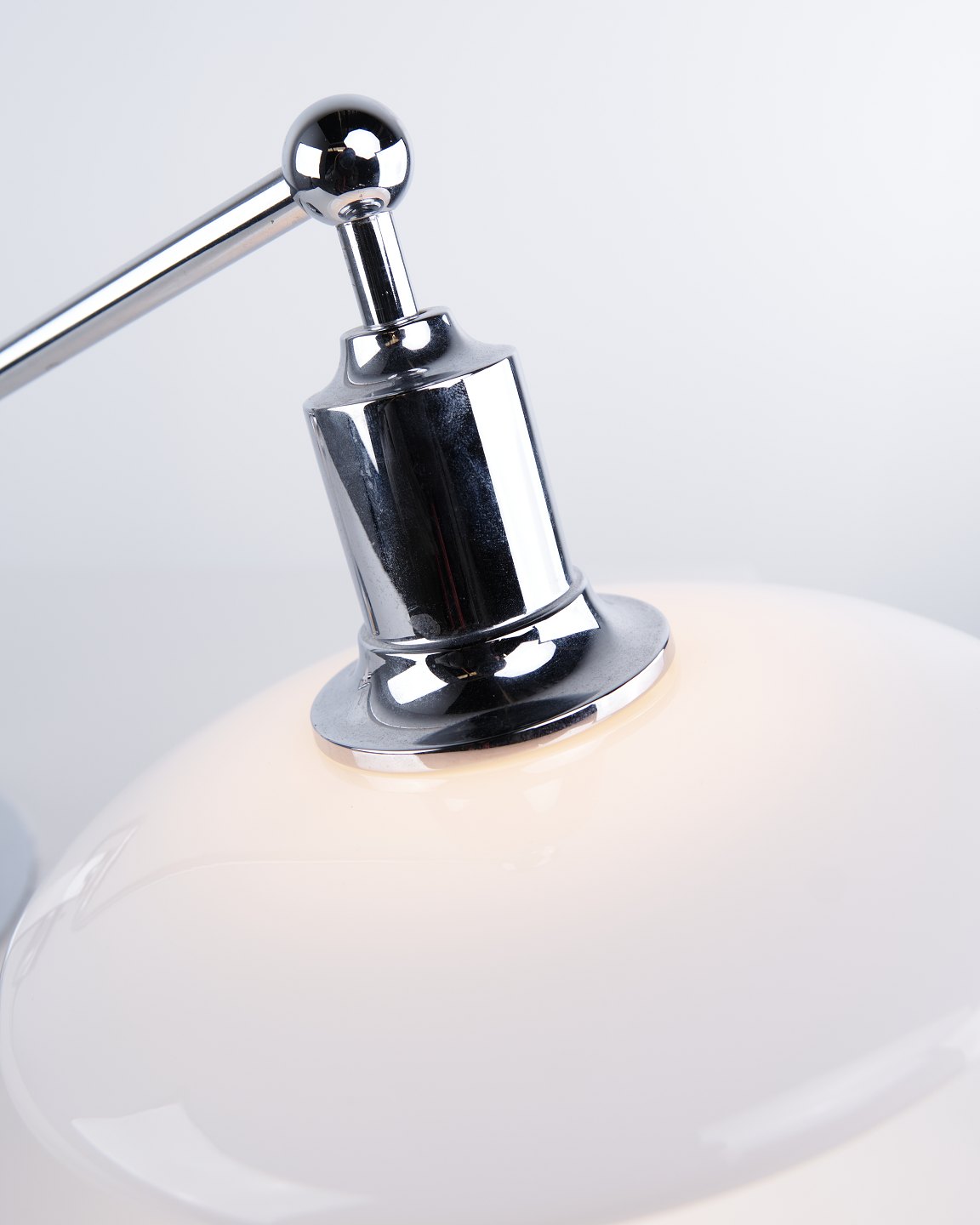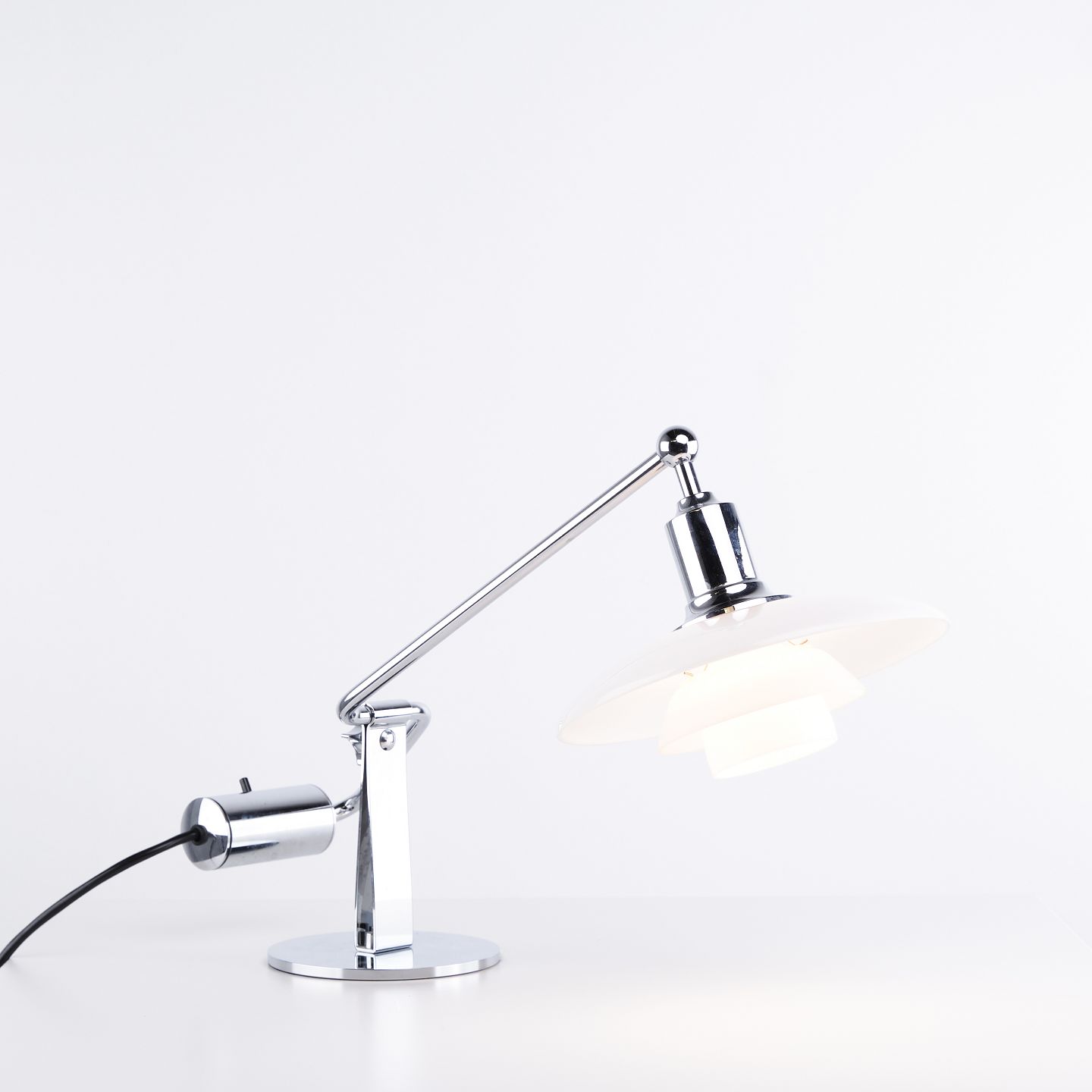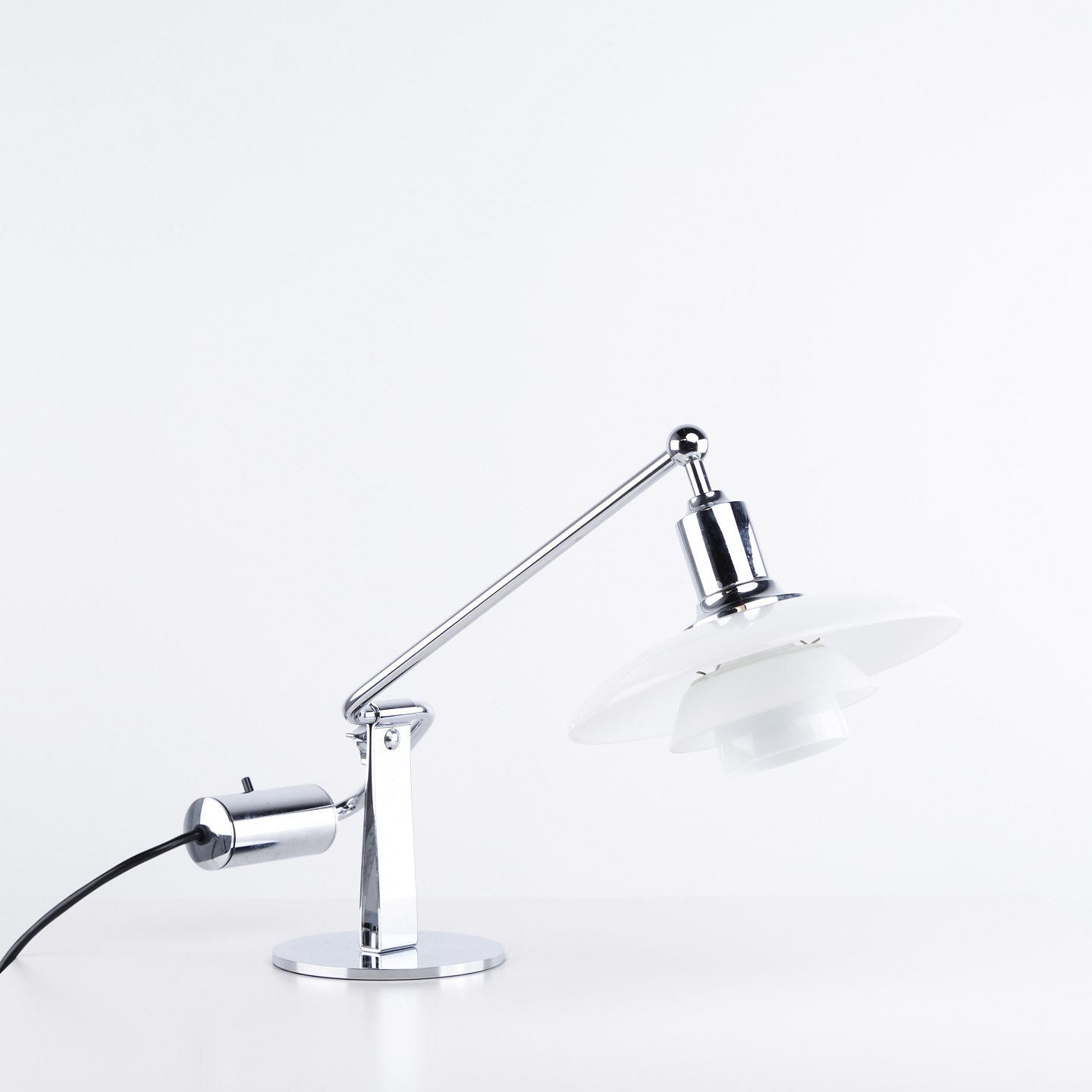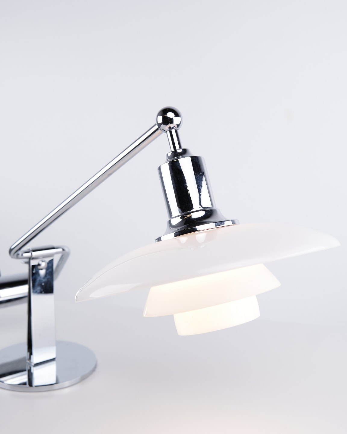 Beskrivelse: PH 2/1 klaver/kiplampe designet af Poul Henningsen og fremstillet af Louis Poulsen. Lampen er udført med skærme i hvidt opalglas og justerbar arm, hvilket giver fleksibel lysretning og et blødt, blændfrit lys.