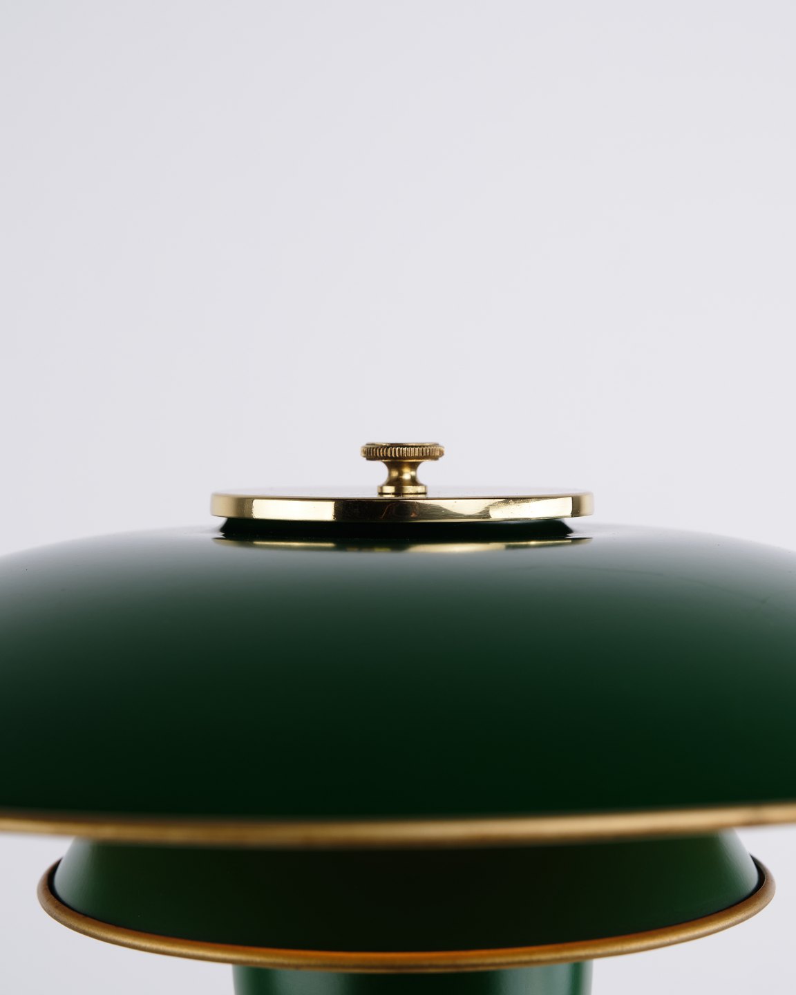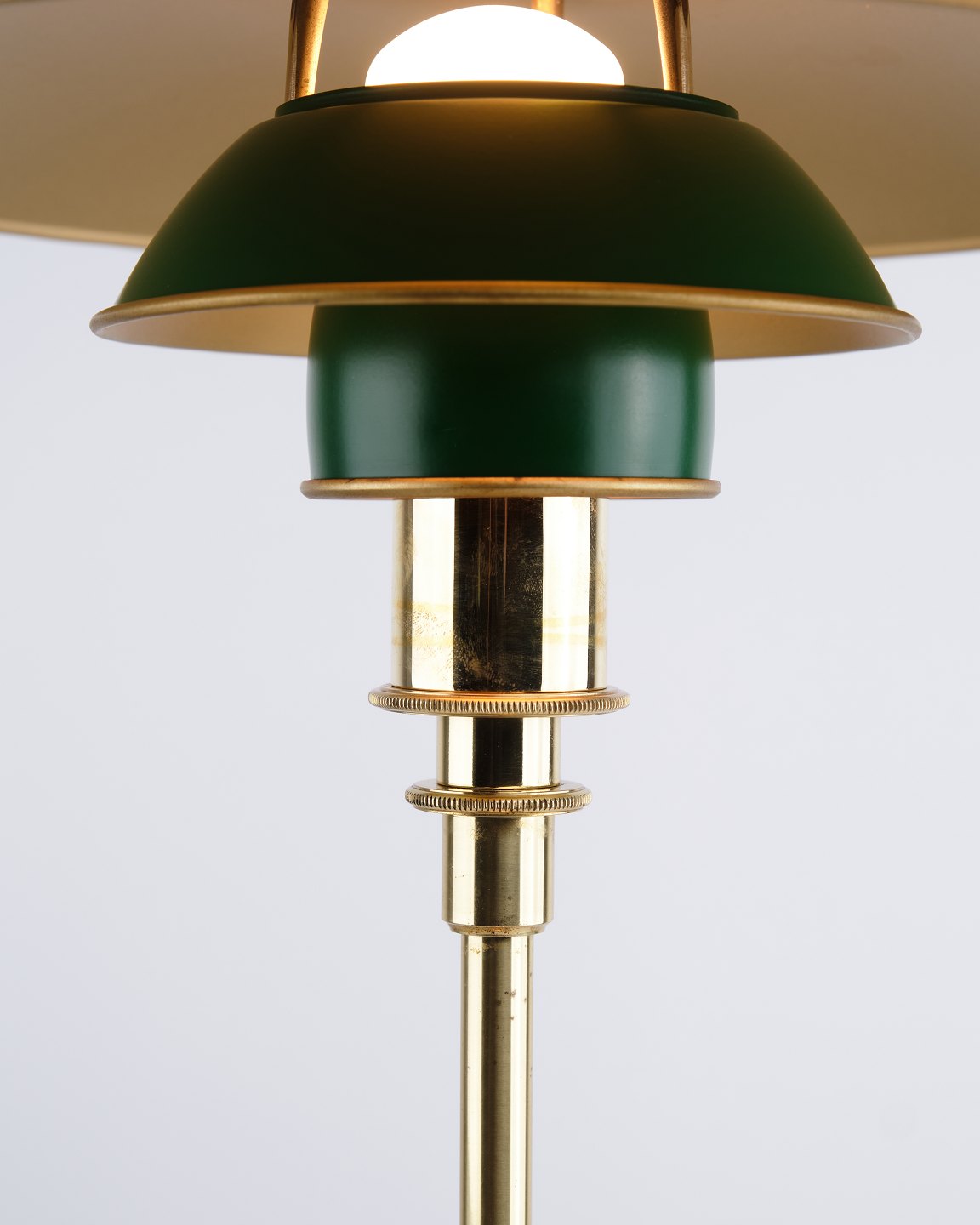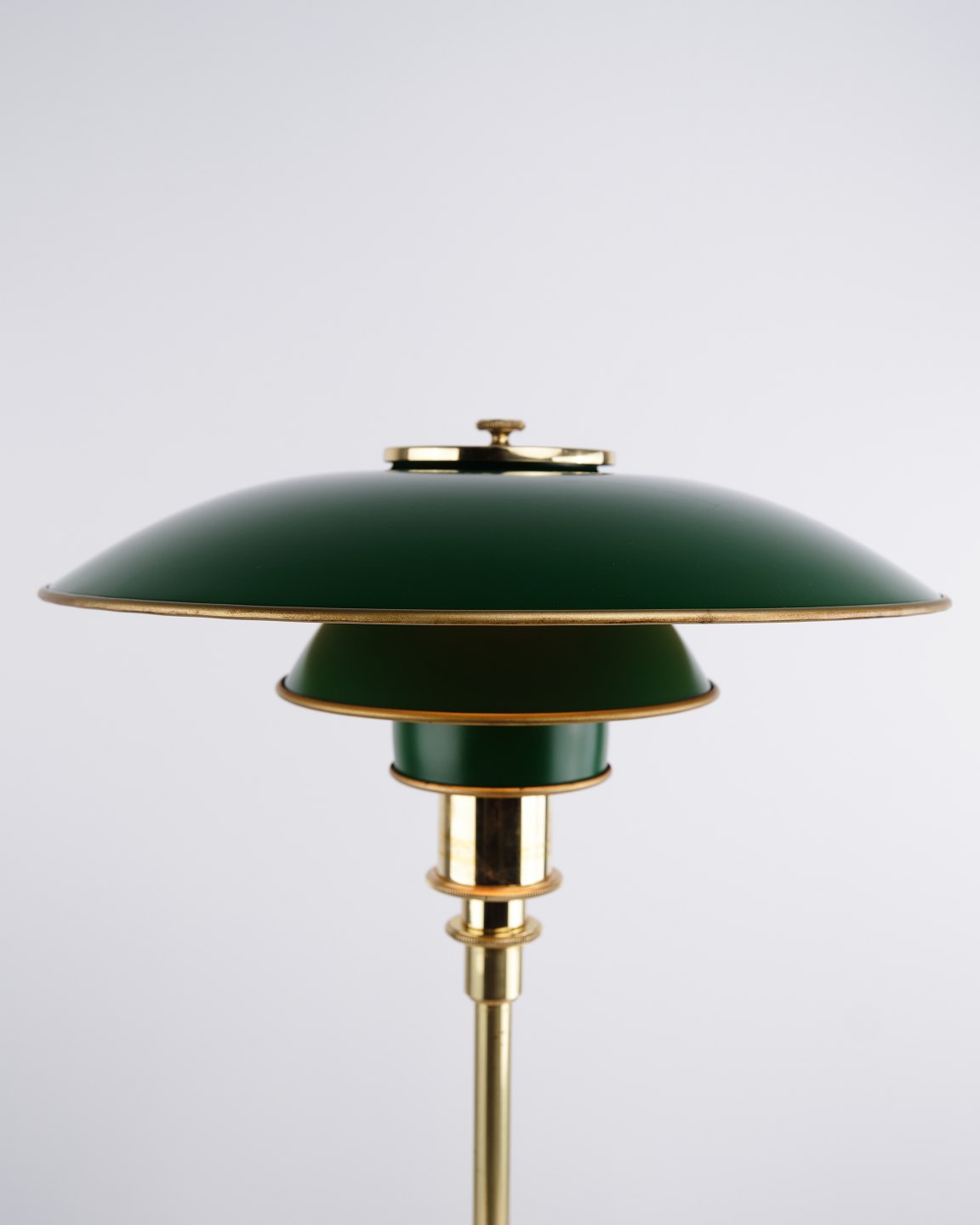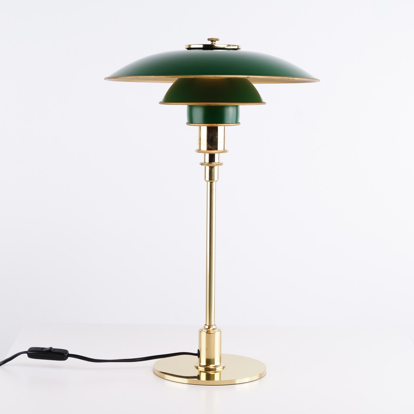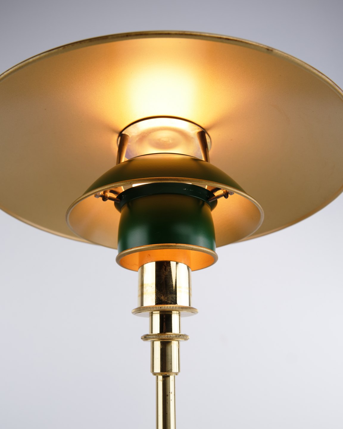 Poul Henningsen Bordlampe Model PH 3/2 Jubilæumsudgave i messing med grønne metalskærme for Louis Poulsen