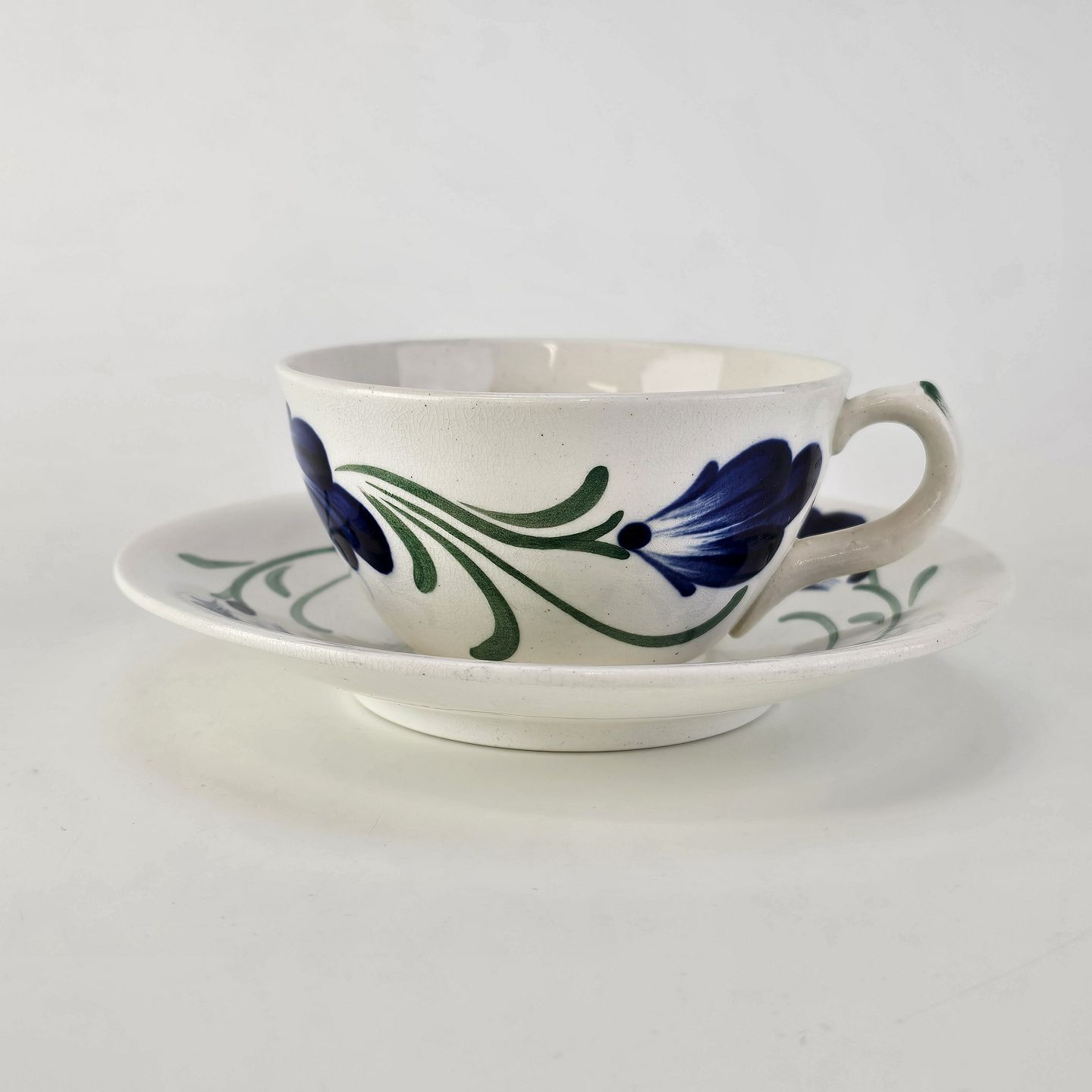 Beskrivelse: Kop med underkop i hvid fajance fra stellet Blå Cenerarier