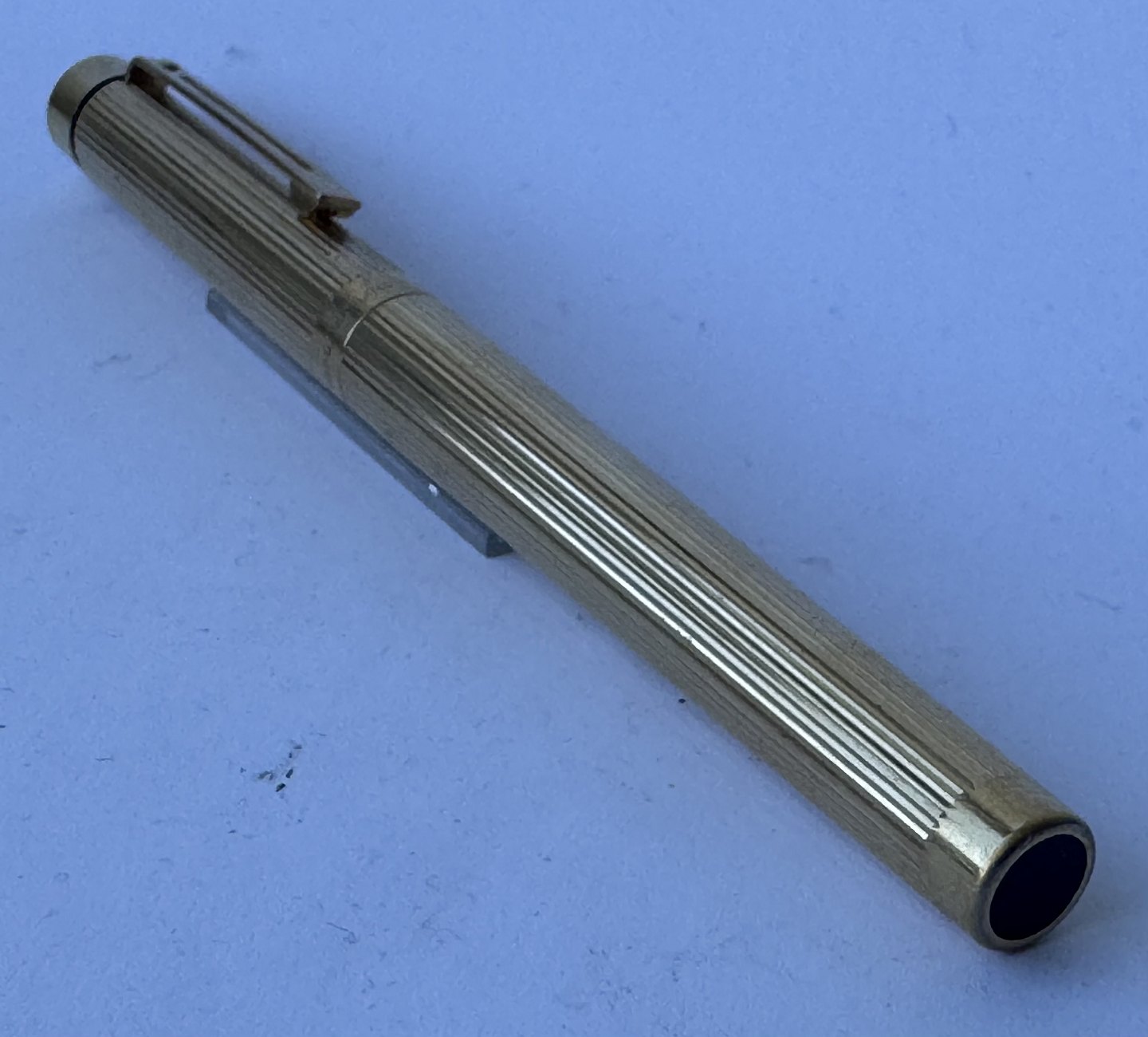 Beskrivelse: Sheaffer Targa fyldepen i forgyldt metal - “Gold Electeoplated”. 585 14 karat guldspids. Fremstillet i 1980’erne. Ny blæk-pateon skal indsættes før den igen kan skrive. Fremstår i god stand. Ingen skader eller reparationer. L. 14 cm