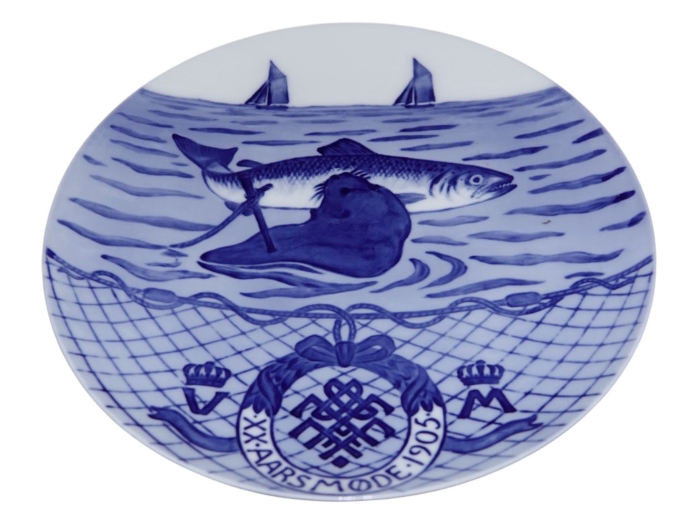 Beskrivelse: Royal Copenhagen Mindeplatte fra 1905 dekoreret med en sæl med en laks i munden i anledning af Årsmøde i Fiskeriforeningen.
