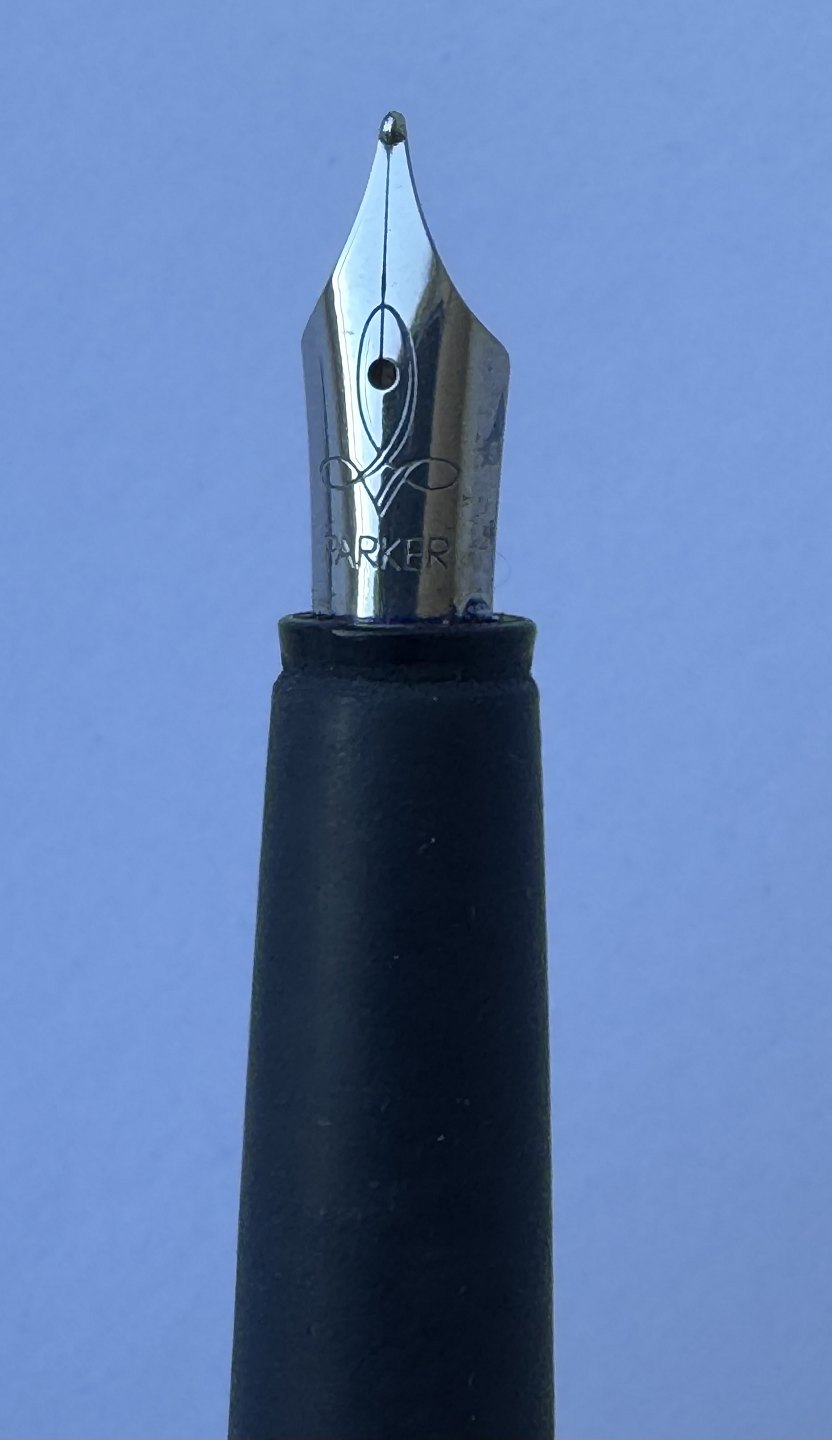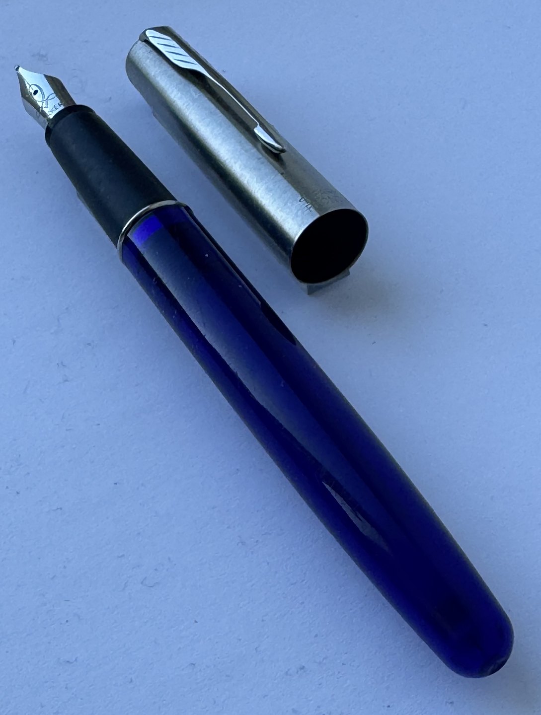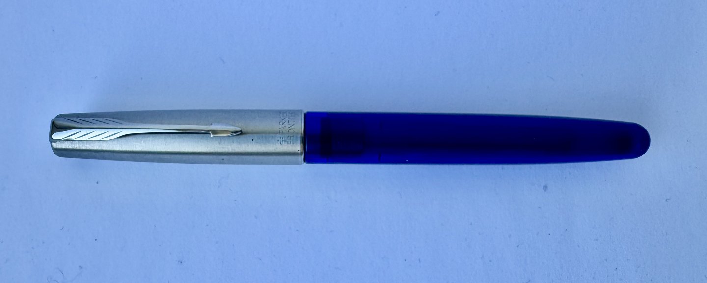 Beskrivelse: Blå Parker Frontier fyldepen med stål hætte. Fremstillet fra midt i 1990’erne. Klar til at blive brugt når der bliver indsat en ny blæk-patron. L. 13,3 cm