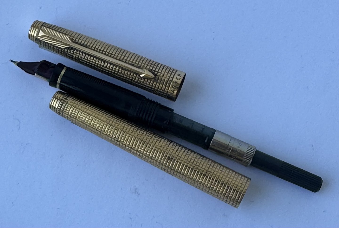 Beskrivelse: Parker 75 Cicelé fyldepen med ternet mønster på overflade i guld-double. Fremstillet i U.S.A. i 1970’erne. Fuldt funktionsduelig. Fin overflade uden stød eller andre overflade brugsspor. Har dog brug for at blive pudset. For enden en 14 karat 585 guldspids fremstillet i Frankrig. L. 13 cm.
