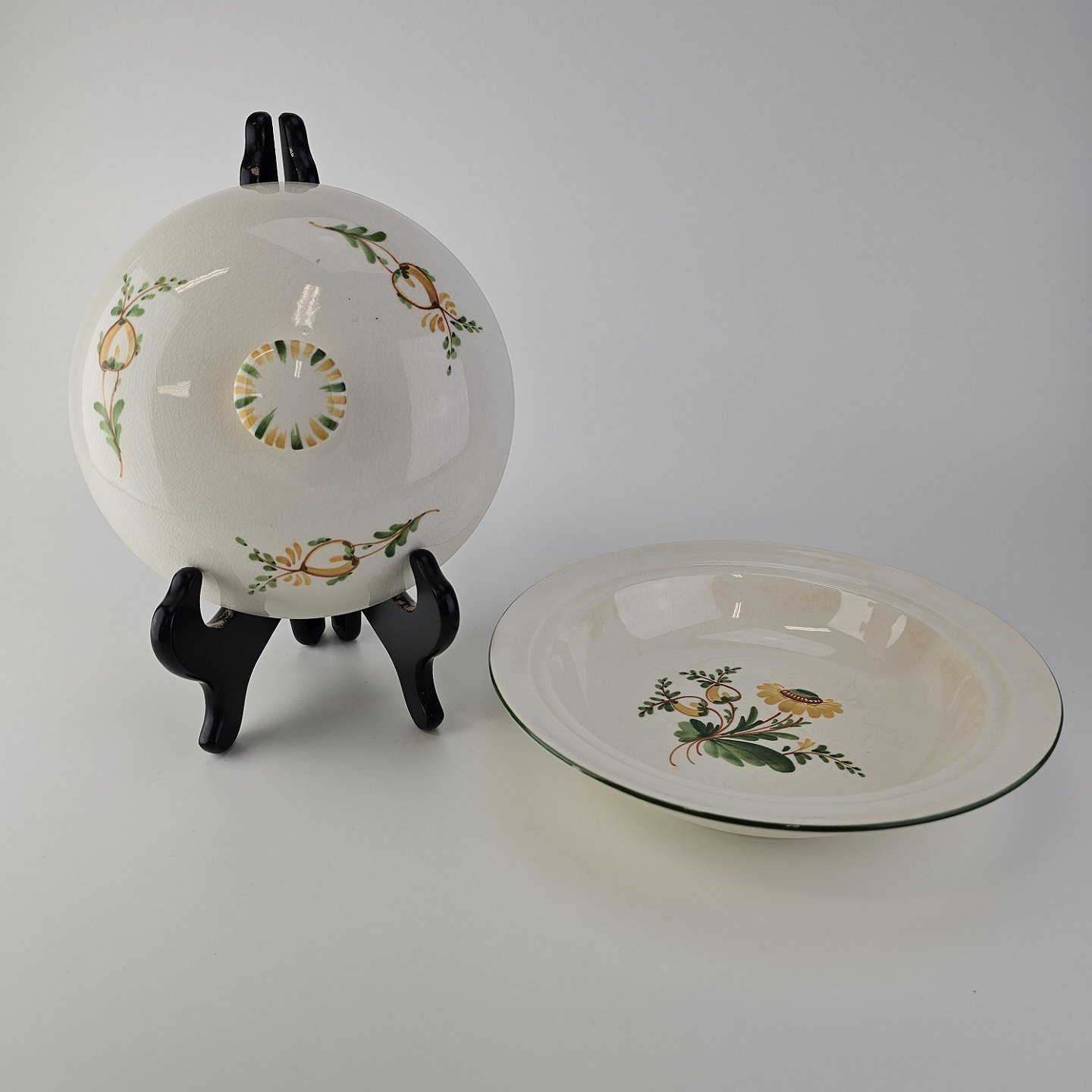 Hvidt fajancestel i stelform Feston/Alma med motiv af gule blomster og grønne blade.