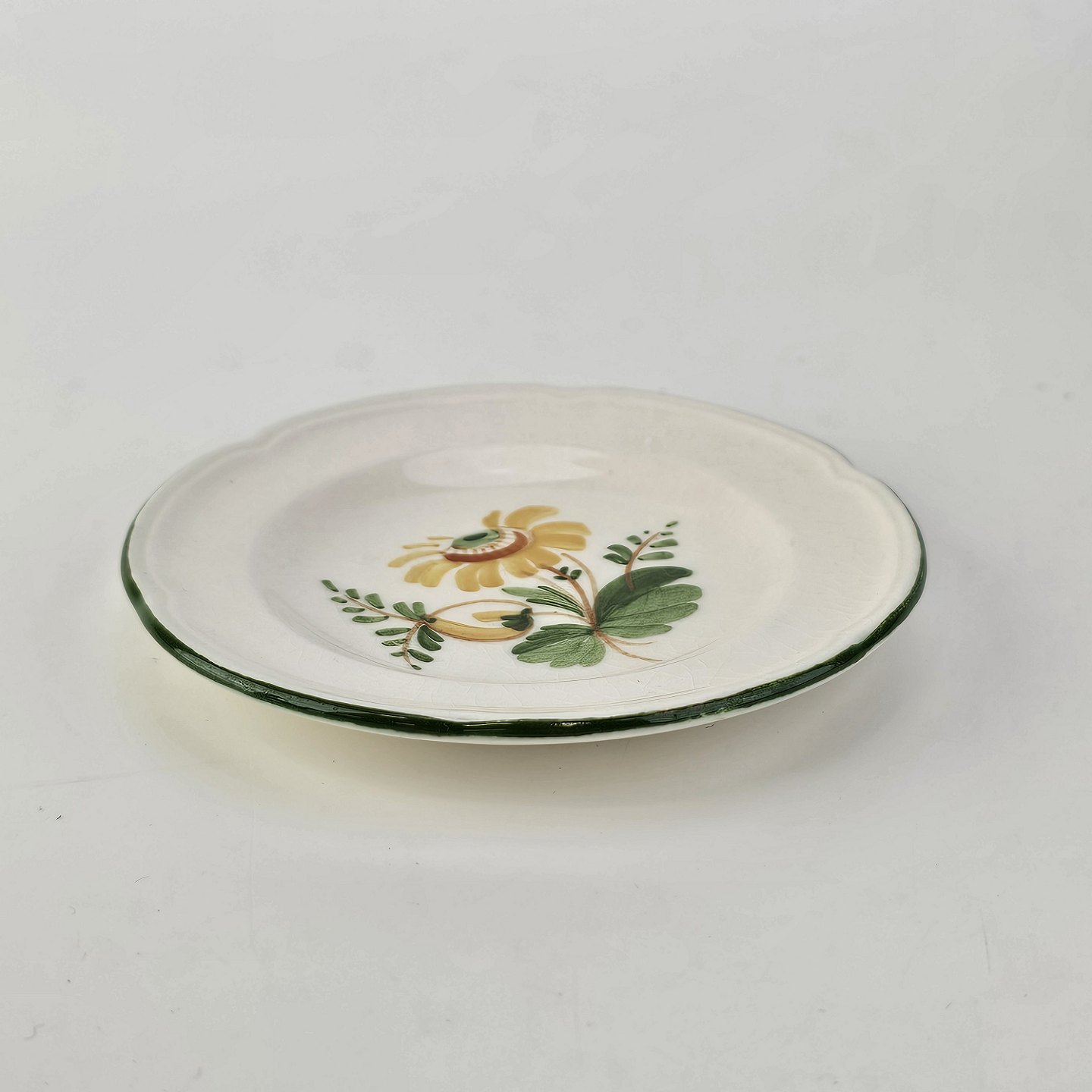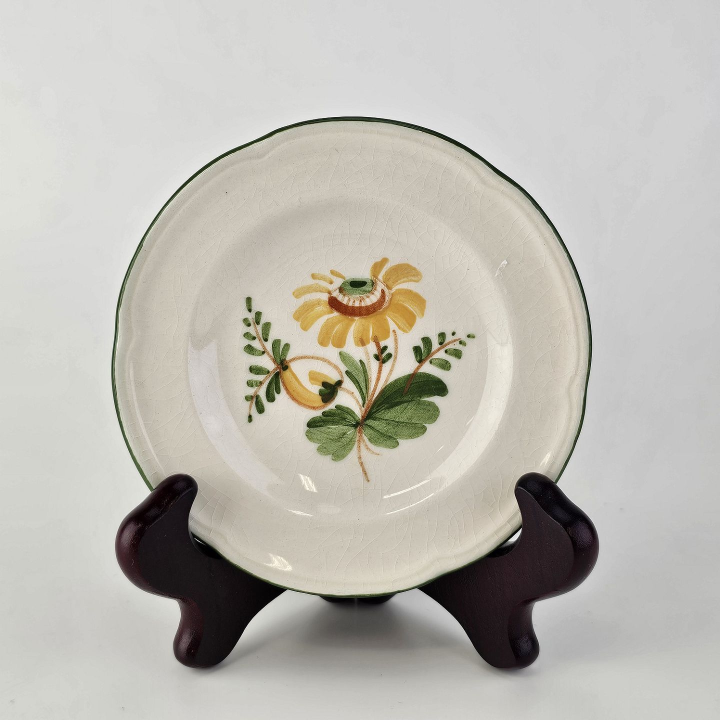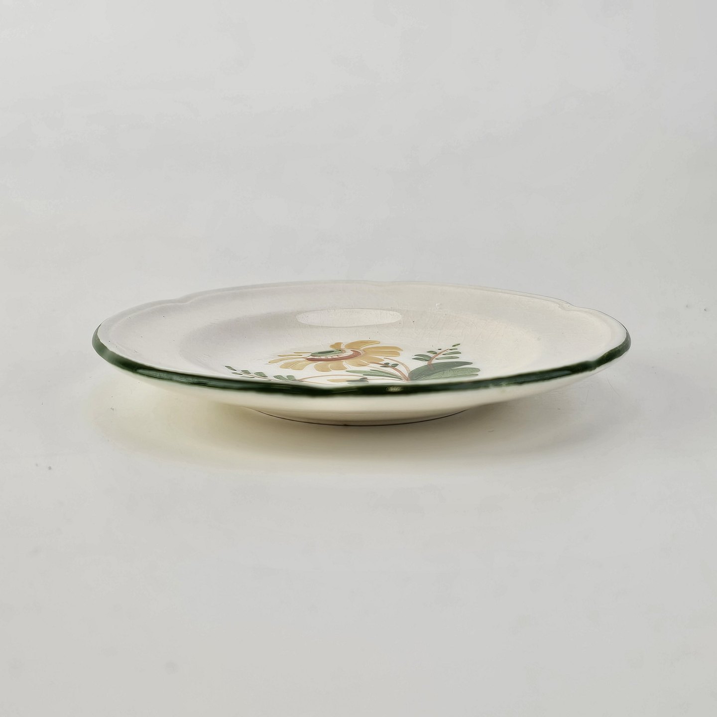 Hvidt fajancestel i stelform Feston/Alma med motiv af gule blomster og grønne blade.