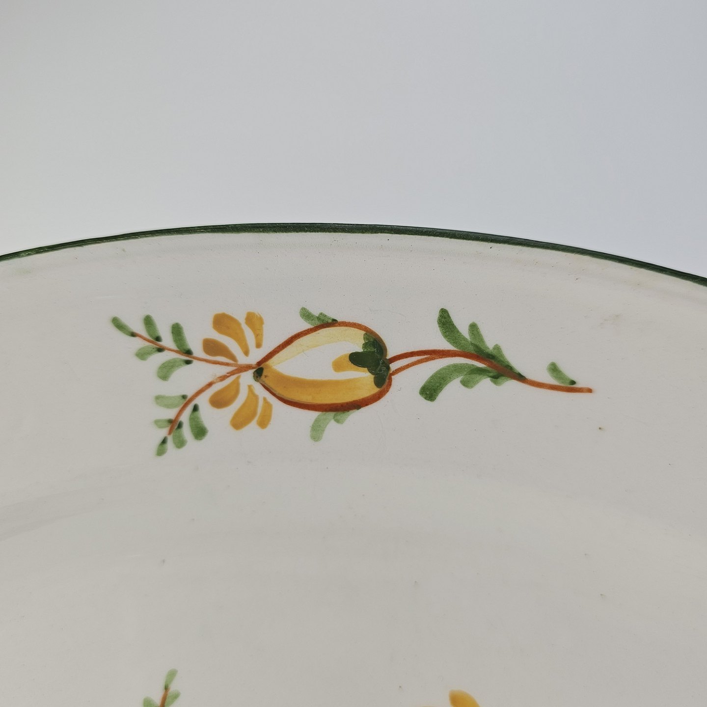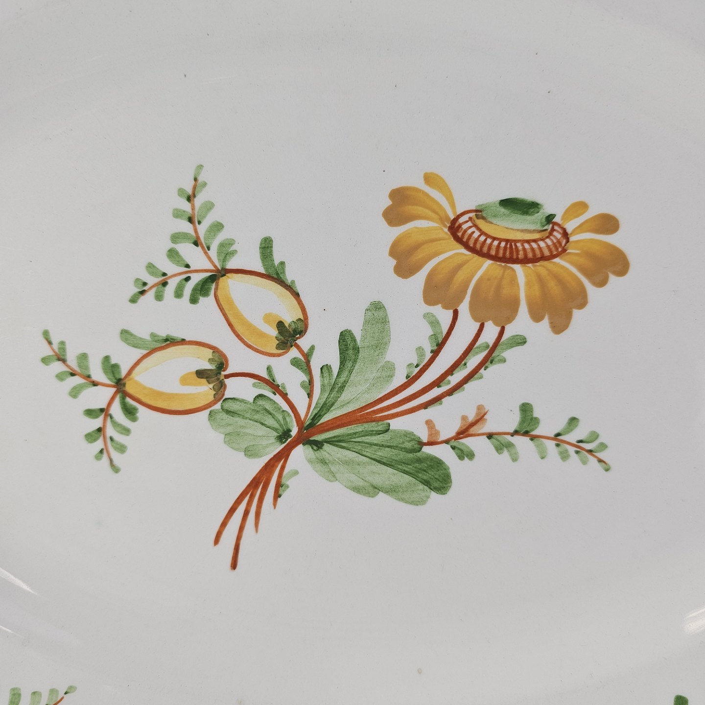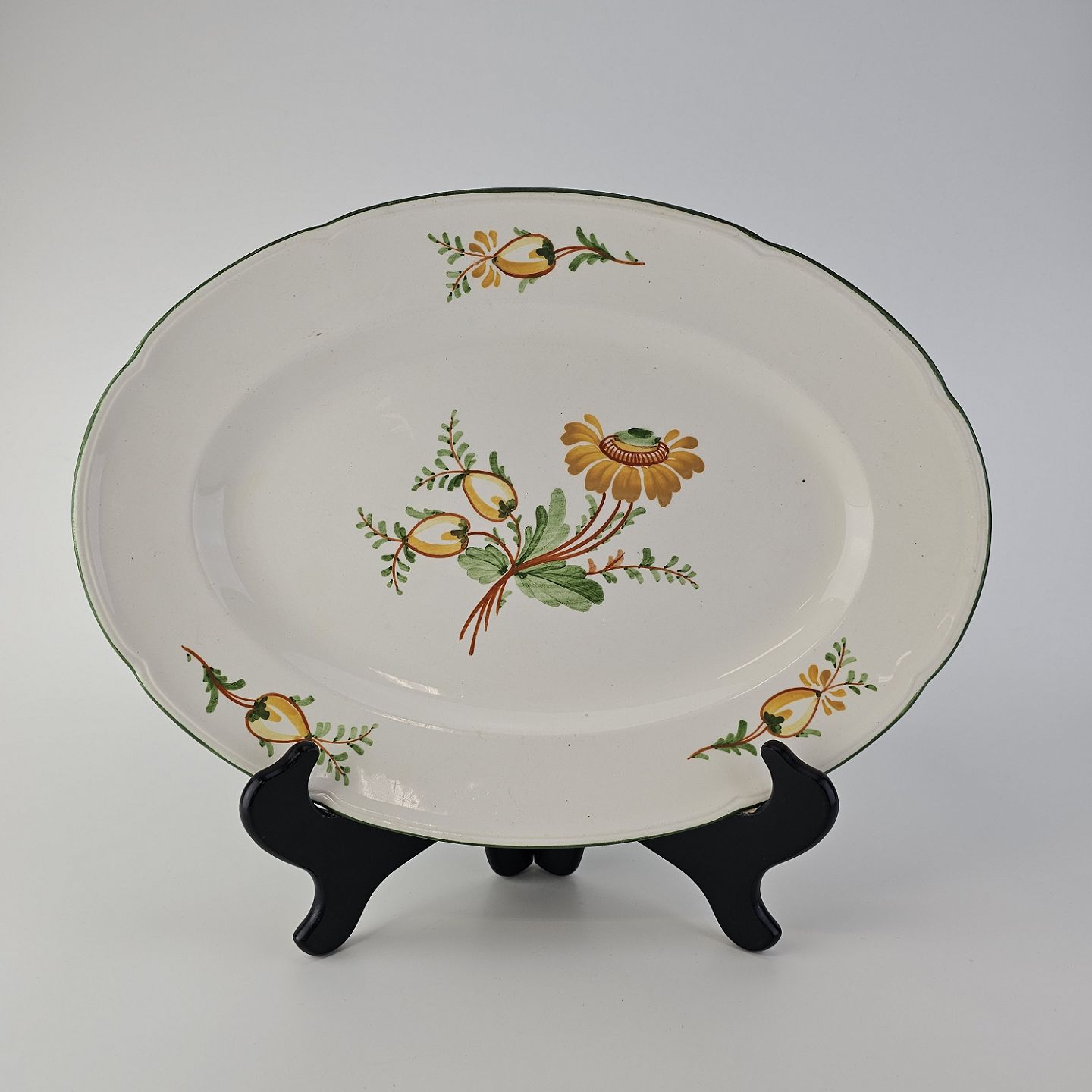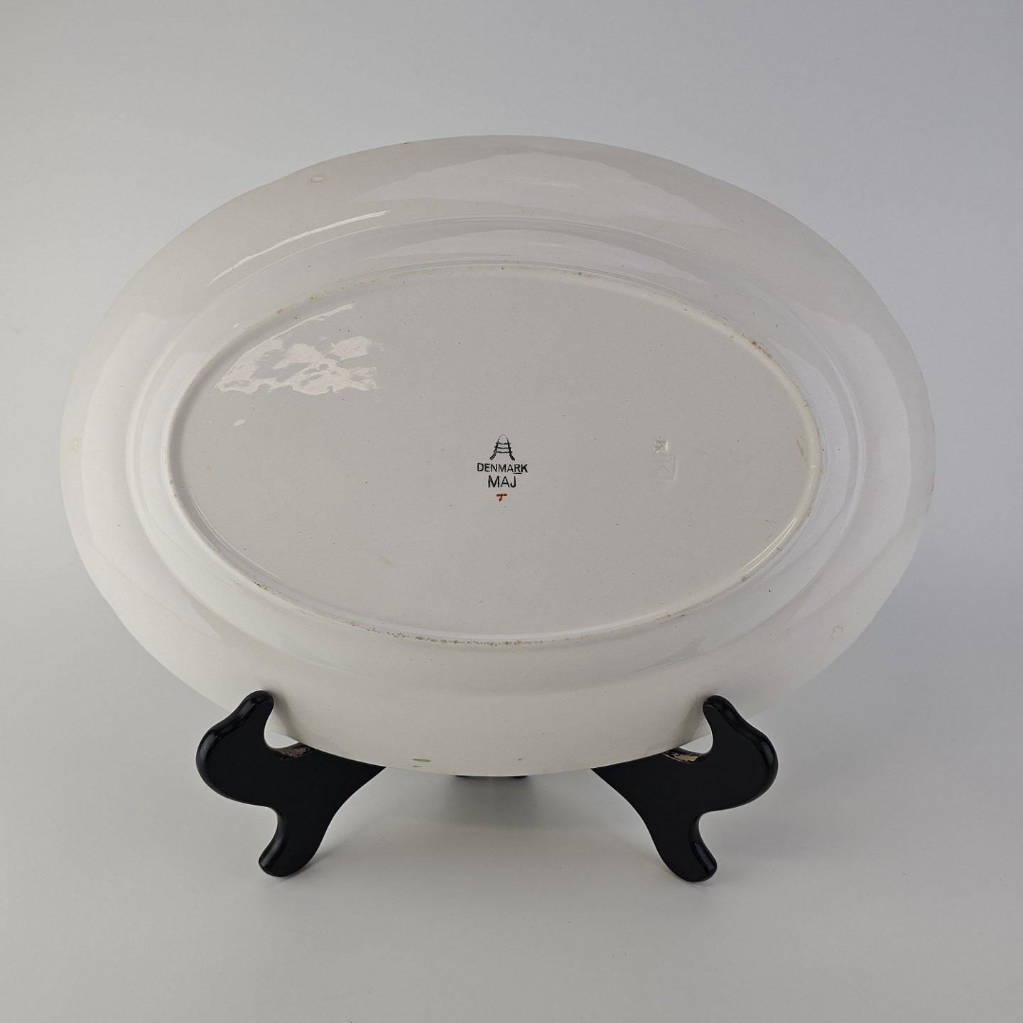 Beskrivelse: Ovalt fad i fajance fra stellet Maj fremstillet i perioden 1941-1966.