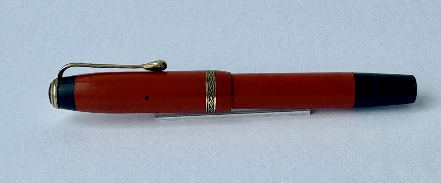 Beskrivelse: Mindre koralrød Penol Junior 12 fyldepen. Push button filler. Der skal indsættes en ny gummisæk før den igen kan optage blæk og skrive igen. Ny gummisæk kan indsættes for et tillæg på kr. 250,- Alle dele originale til denne model. Ingen skader eller reparationer. Lette almindelige brugsspor på overfladen. Længde 11,7 cm