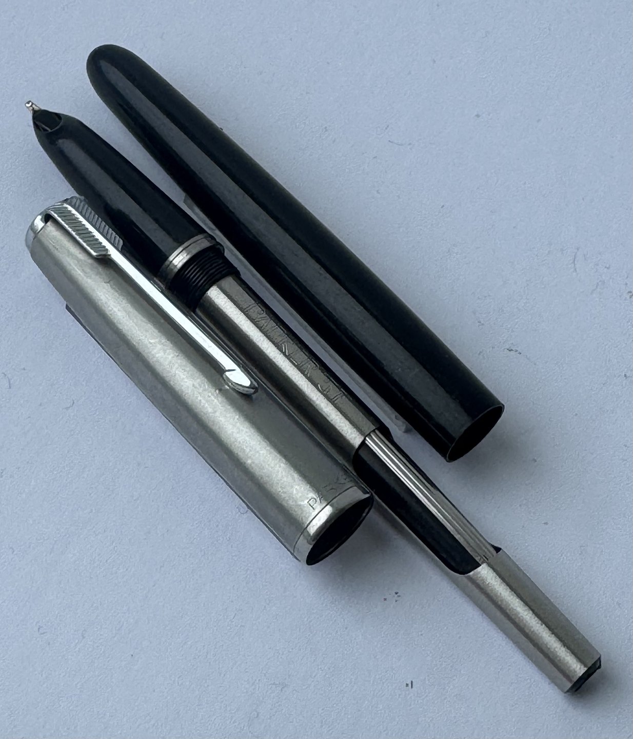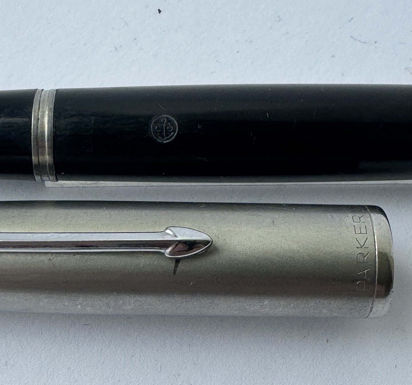 Beskrivelse: Sort Parker 51 fyldepen med hætte i stål fra 1950’erne. Fremstår i god og funktionsdygtig stand. Ingen fejl eller mangler at beskrive. På siden ses “the danish anchor”, som er fyldepenne producenten og forhandleren Christian Olsens firmalogo. Fyldepenne der var importeret til Chr. Olsens fabrikker blev stemplet med dette logo lige såvel som virksomhedens egne produkter, eksempelvis Penol.
