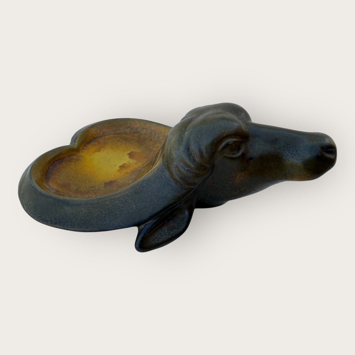 Beskrivelse: P. Ipsen / Ipsens enke, Skål med vandbøffel, mål: 17x13cm, signeret: P. Ipsen, København, 128 *Fin stand*