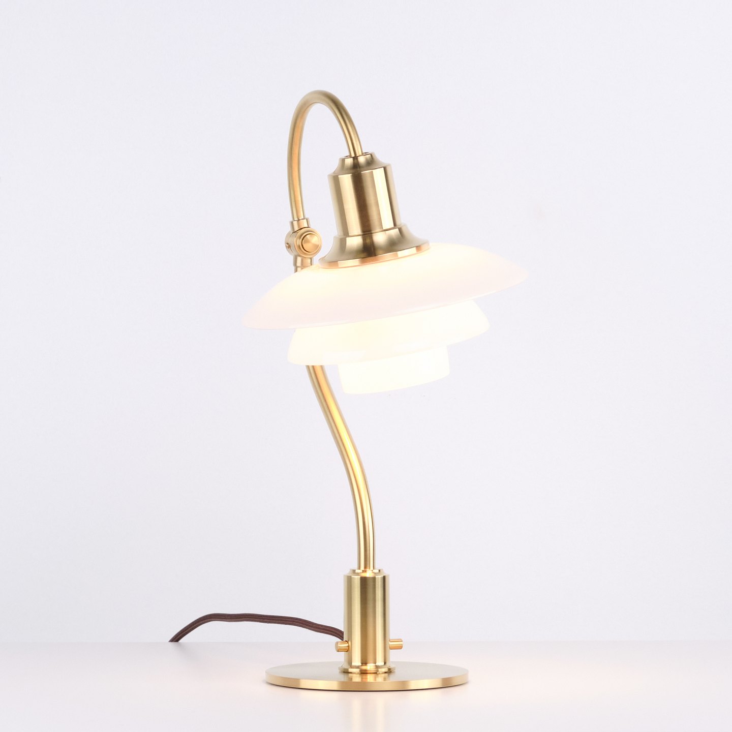 Beskrivelse: Eksklusiv PH 2/2 “Spørgsmålstegnet” bordlampe designet af Poul Henningsen og udgivet som Limited Edition i 2021 af Louis Poulsen. Lampen er udført i børstet messing med skærme i hvidt opalglas og har den karakteristiske buede form, som har givet modellen sit navn.