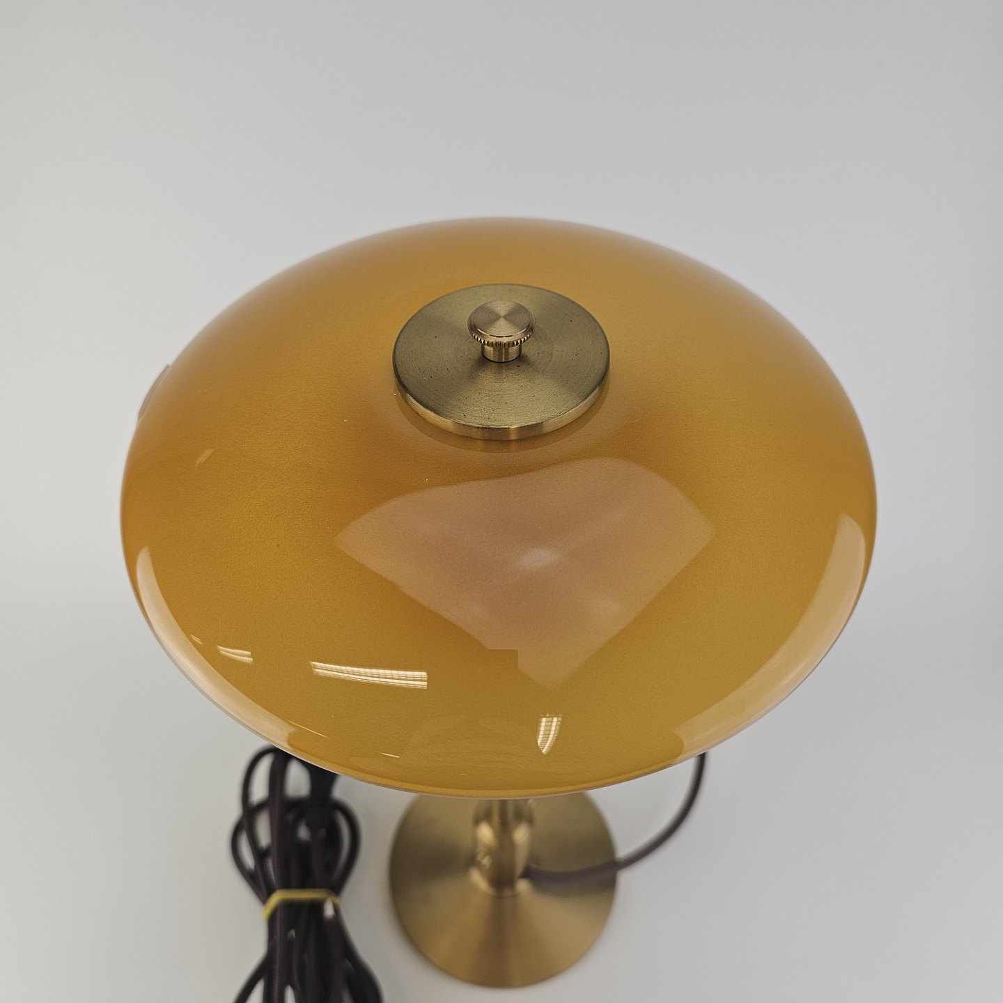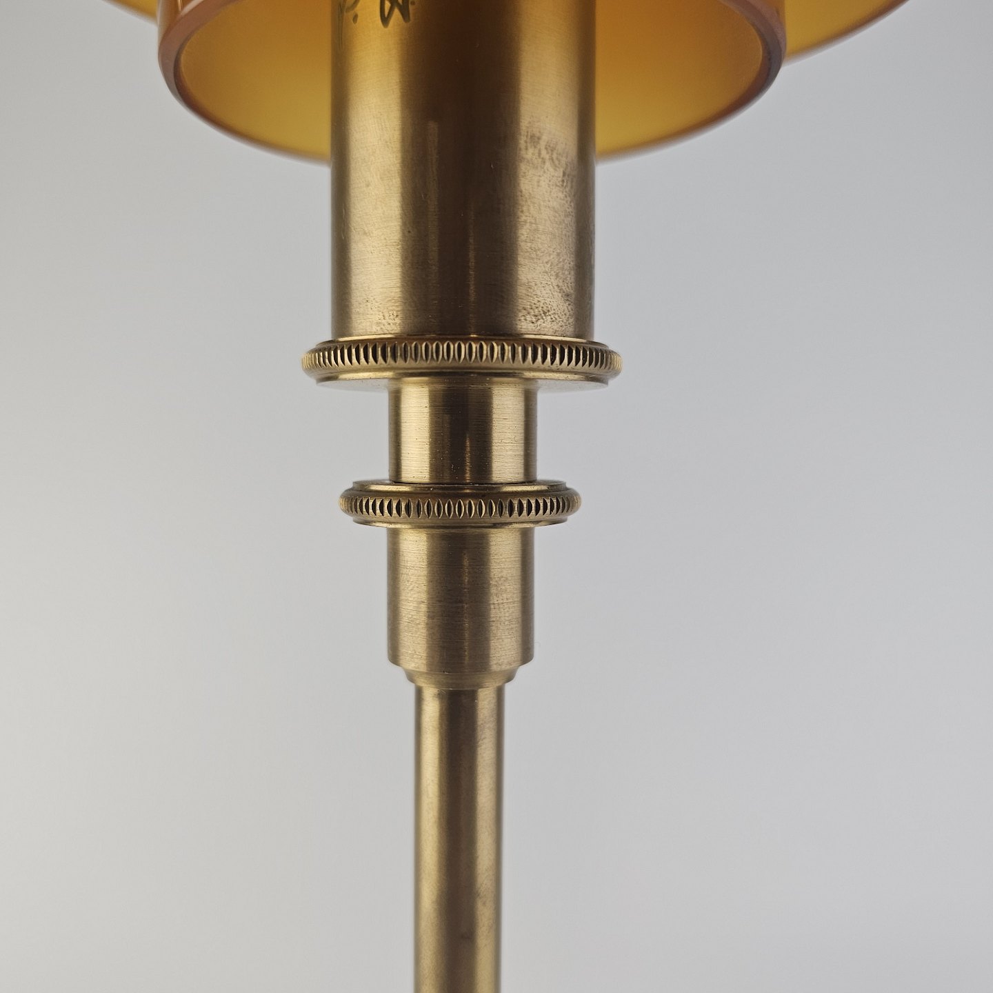 Beskrivelse: Bordlampe PH 3/2 med skærm af mundblæst ravfarvet etlagsglas og fod af strøgslebet messing