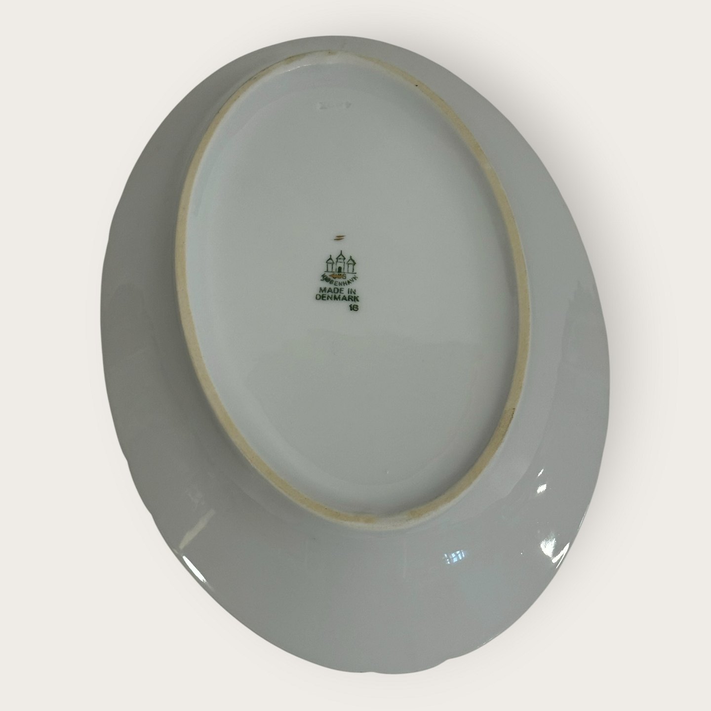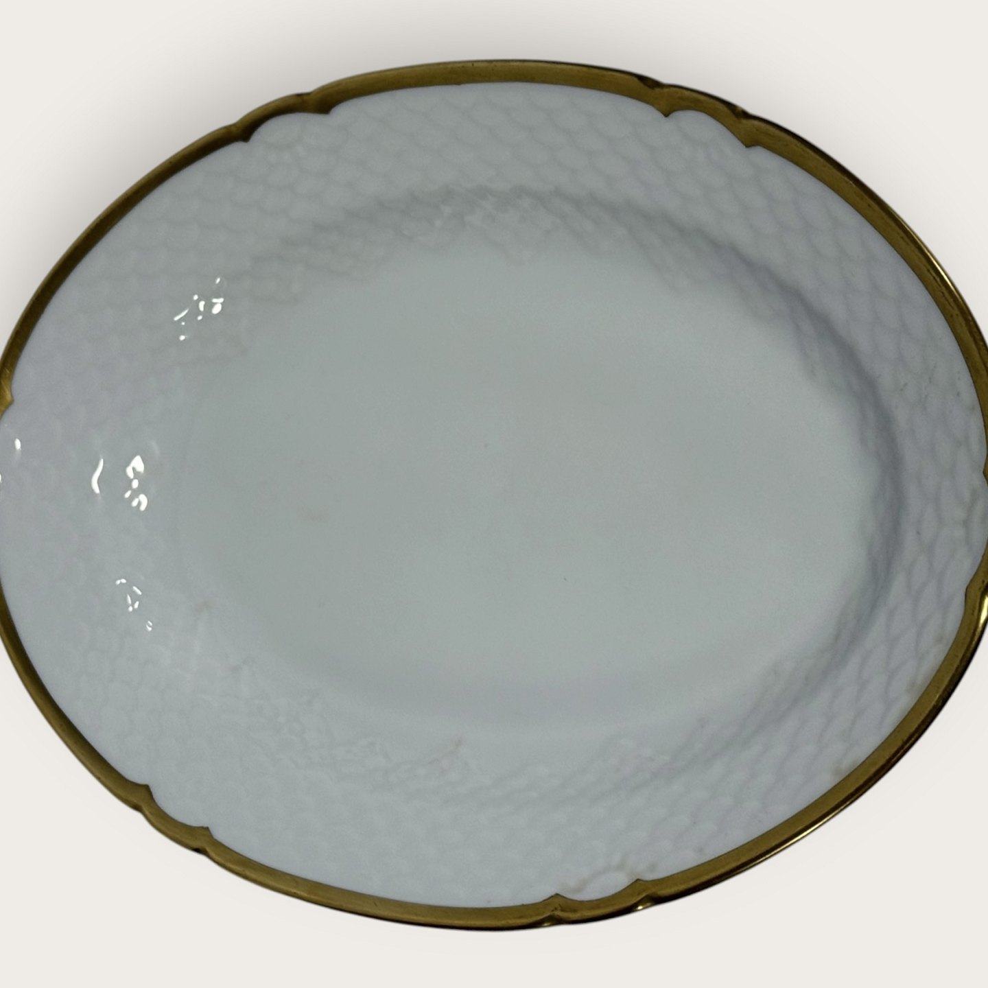 Beskrivelse: Bing & Grøndahl, Aakjær, Hvid porcelæn med guldkant, Lille fad # 18, 25x17,5cm, 1.sortering *Pæn stand*