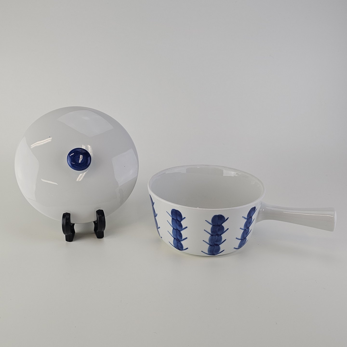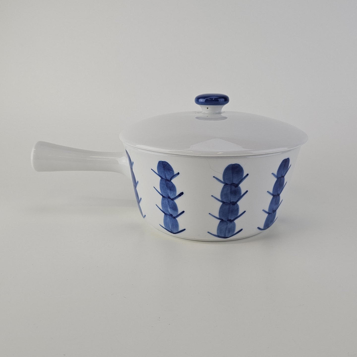 Beskrivelse: Gryde med låg i porcelæn fra Stellet Danild 30, også kaldet Blomsterknop