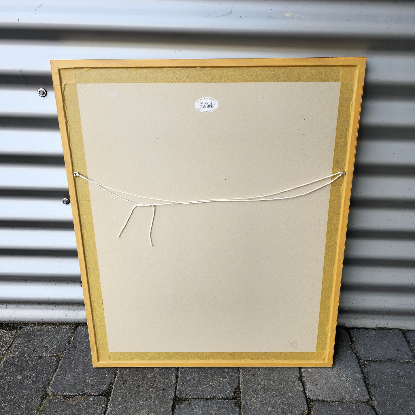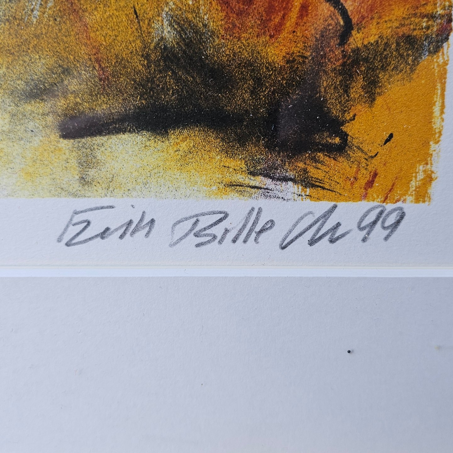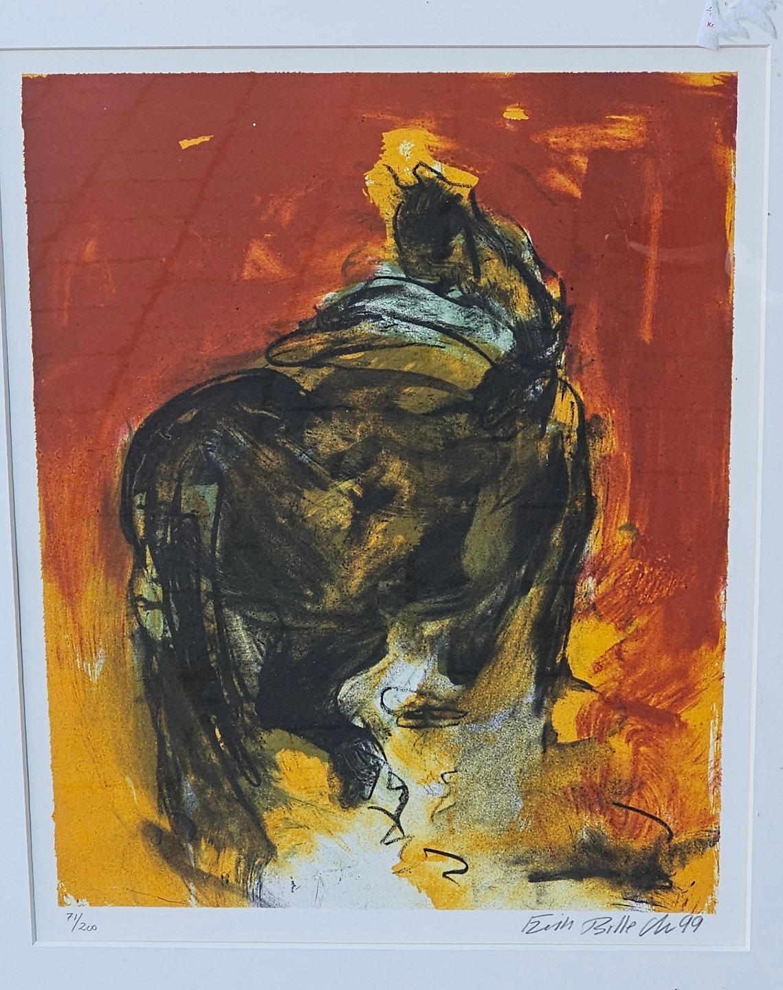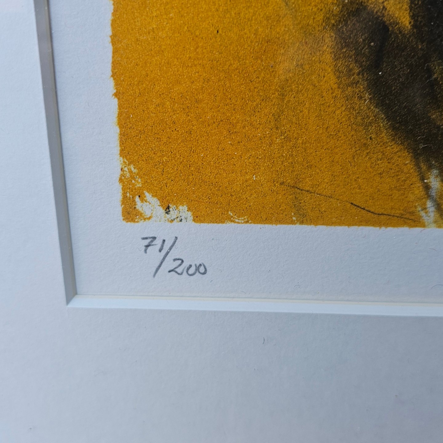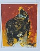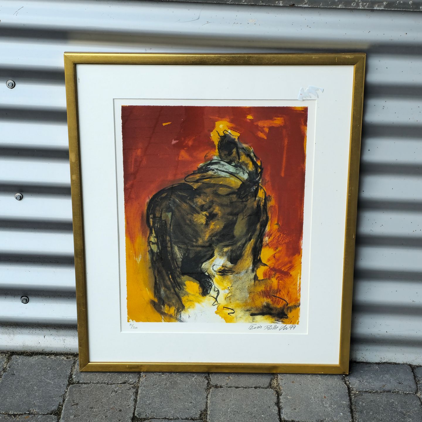Beskrivelse: Litografi i sorte, røde og gule nuancer i metal ramme. 71/200
