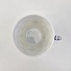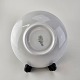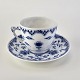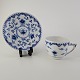 Stel i hvidt porcelæn med skelform dekoreret med blå motiver af ranker, blomster og sommerfugle.