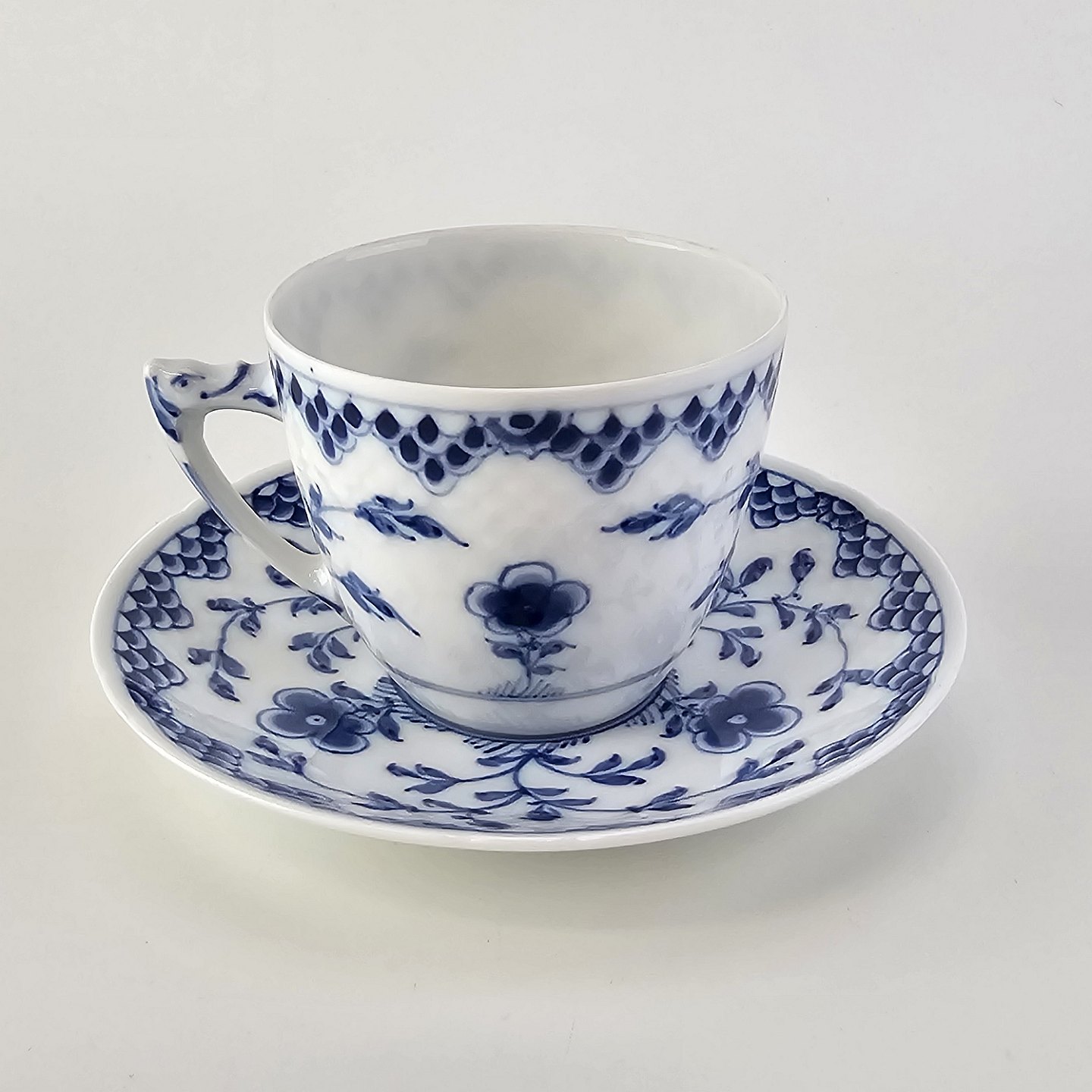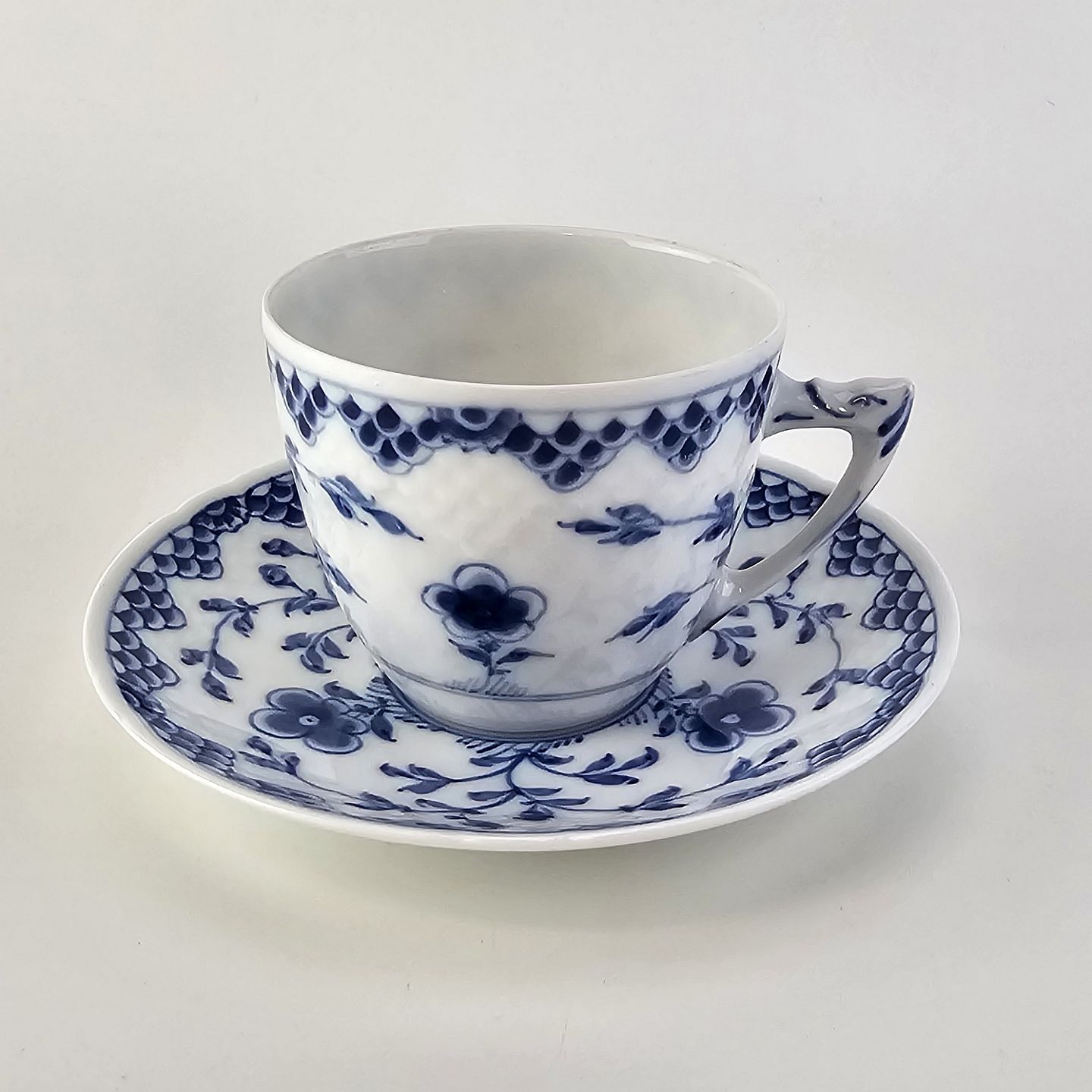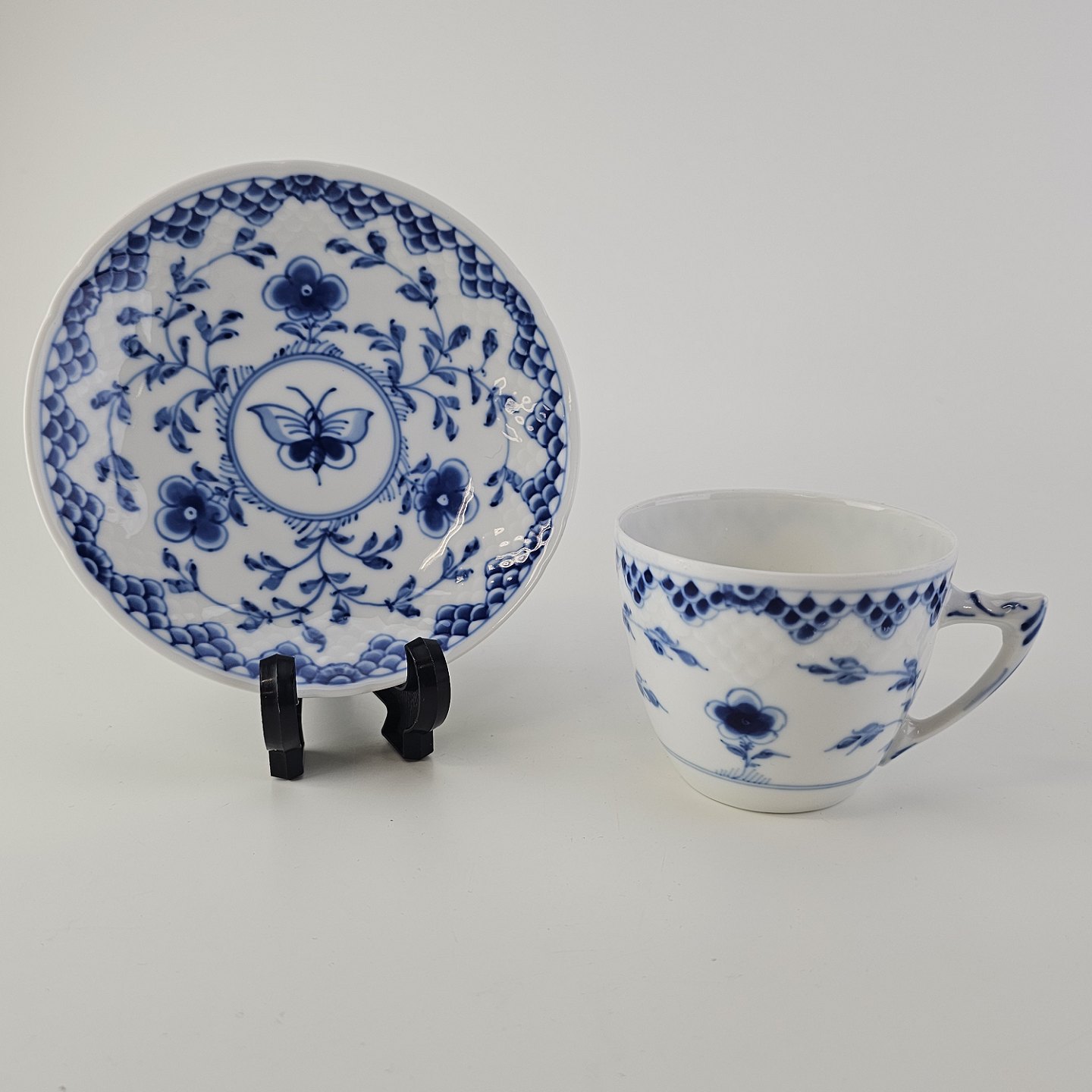Beskrivelse: Kaffekop med underkop i porcelæn fra stellet Dickens Sommerfugl, kan indeholde 1,25 dl. Nr. 102