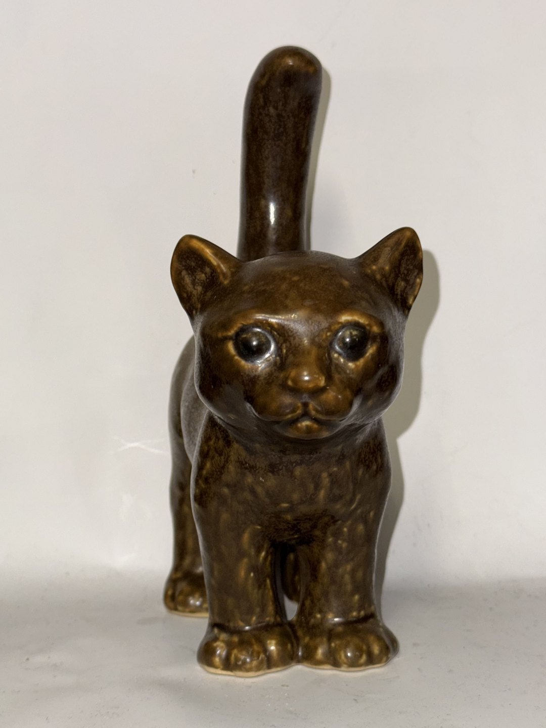 Beskrivelse: Figur i keramik udført af Knud Basse (1916-1991) på sit værksted i Vang på Bornholm. Brun glaseret. Fremstår i god stand. Signeret med KB. Mål: H. 22 cm L. 17 cm B. 7,5 cm