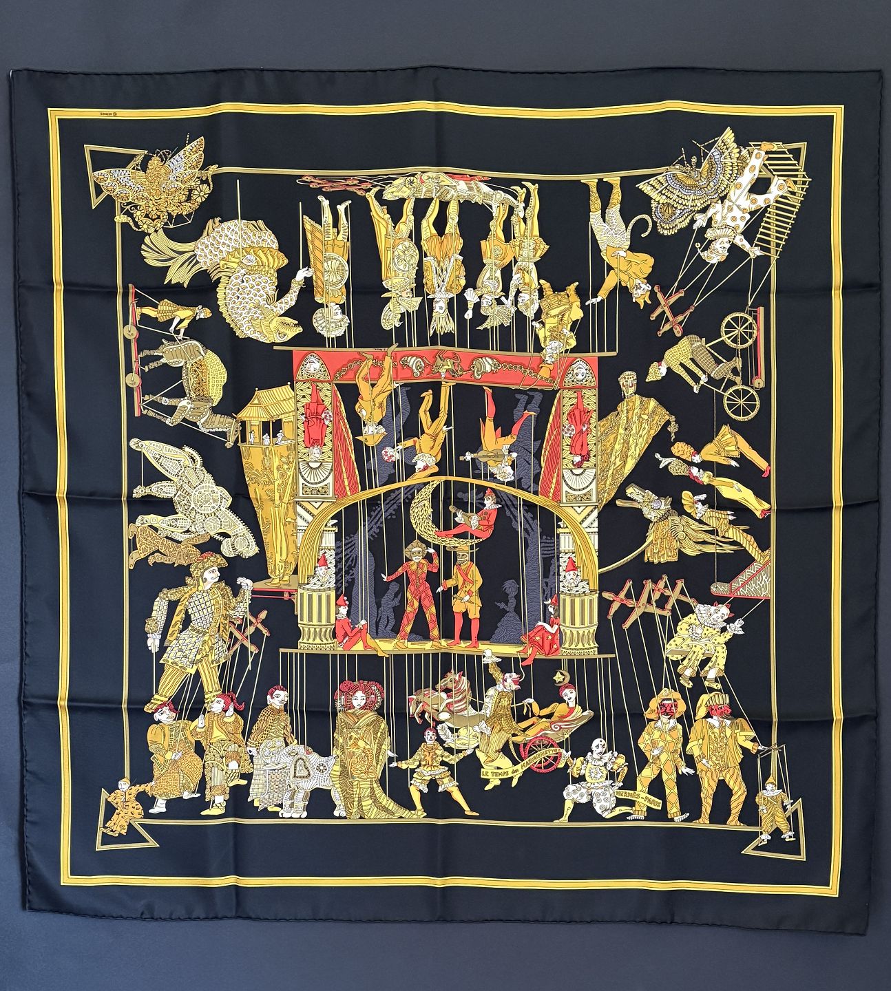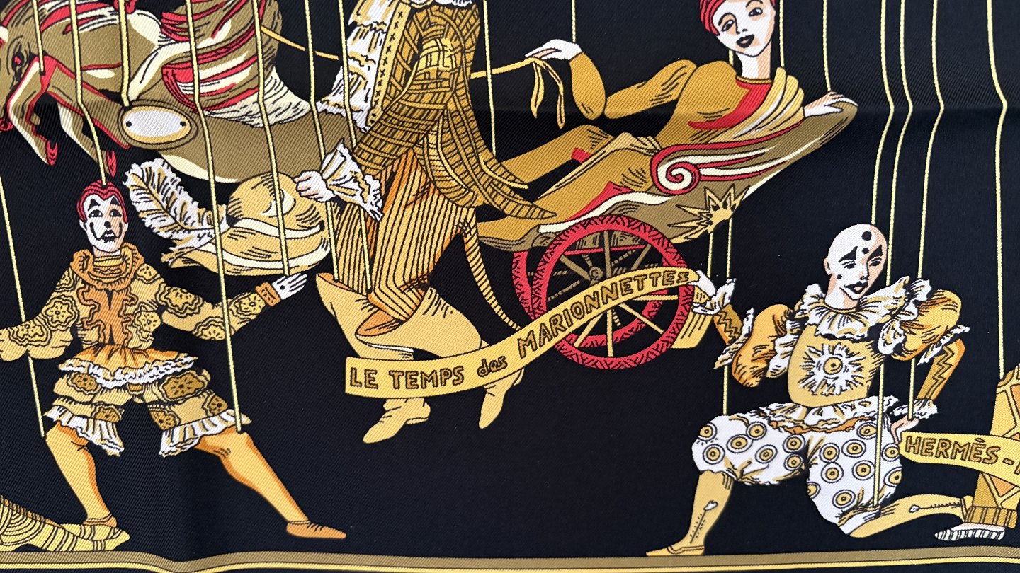 Beskrivelse: Hermès: Sort silketørklæde med motiv 'Le Temps Des Marionnettes'.