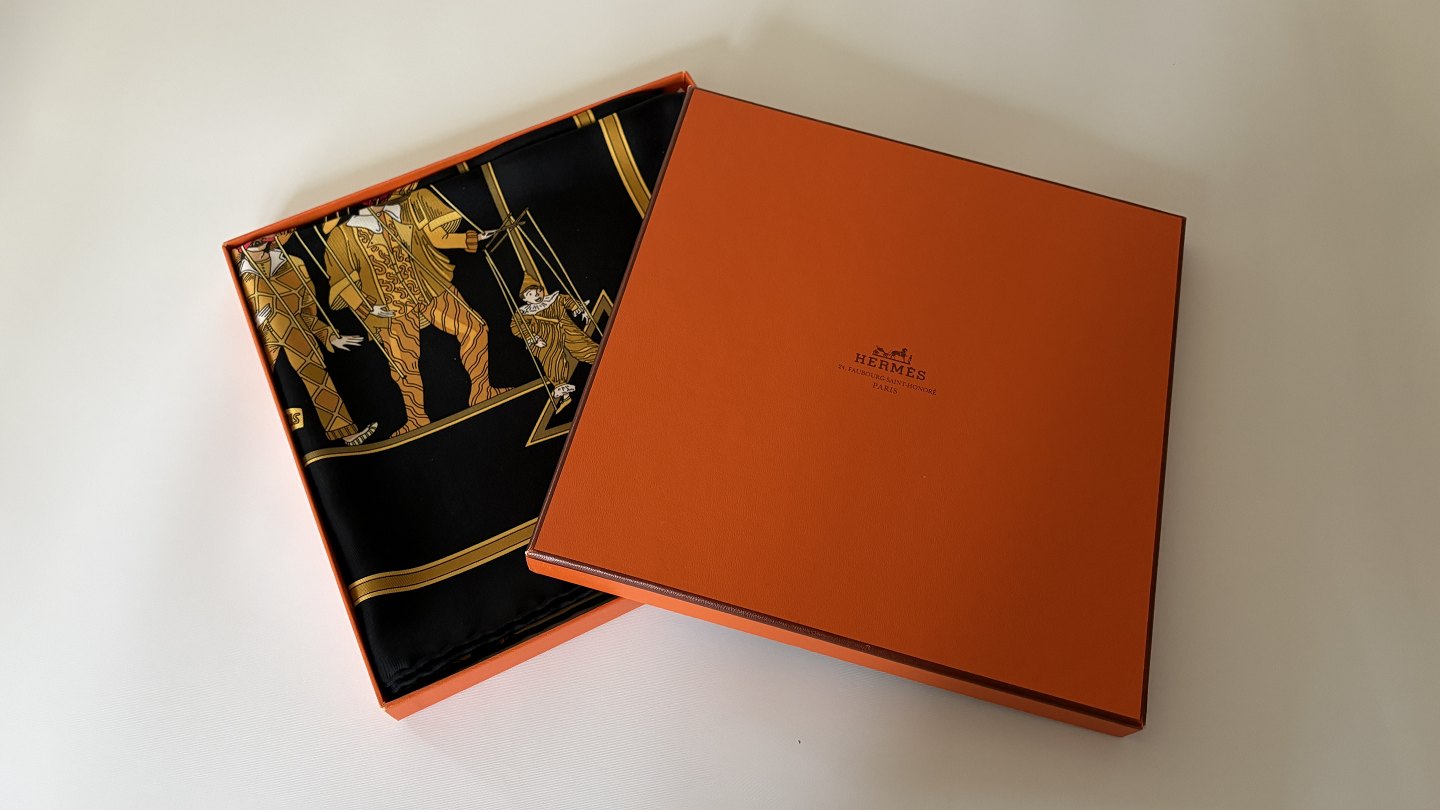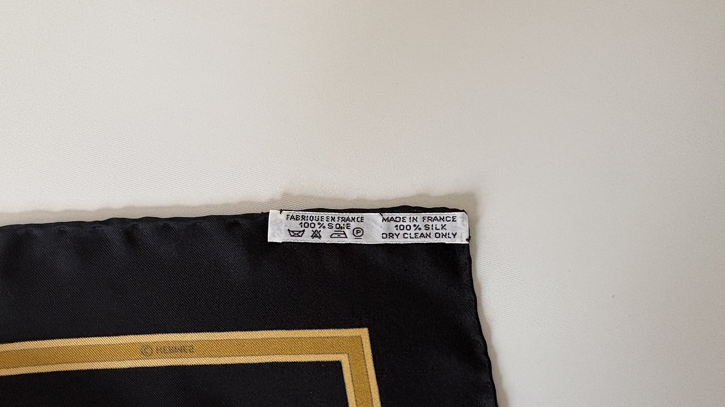 Hermès: Sort silketørklæde med motiv
