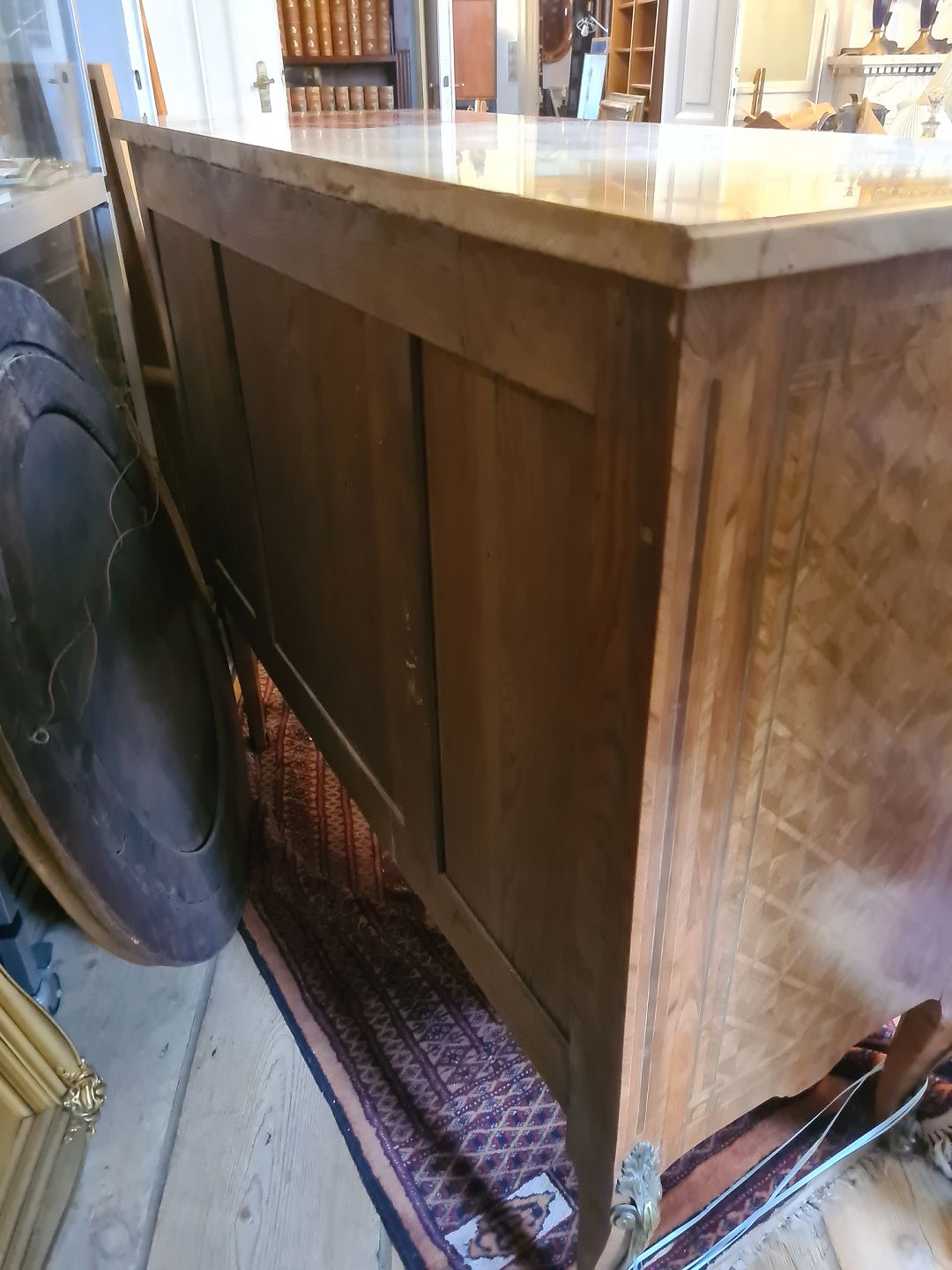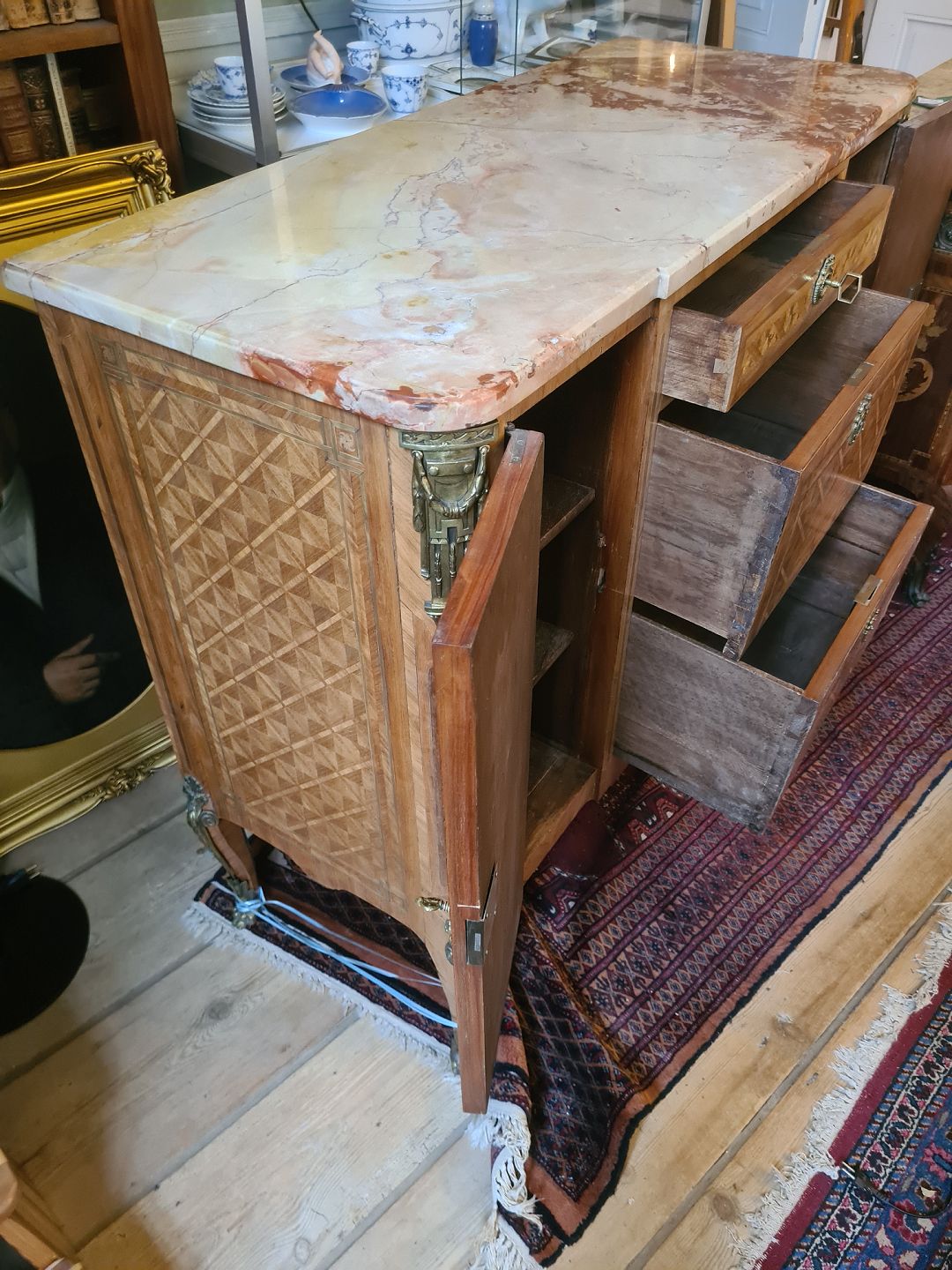 Beskrivelse: Kommode fra sidst i 1800 tallet. Fremstillet i rokokostil med låger og løstliggende marmorplade på toppen. Fremstår pæn og velholdt uden de store brugsspor.