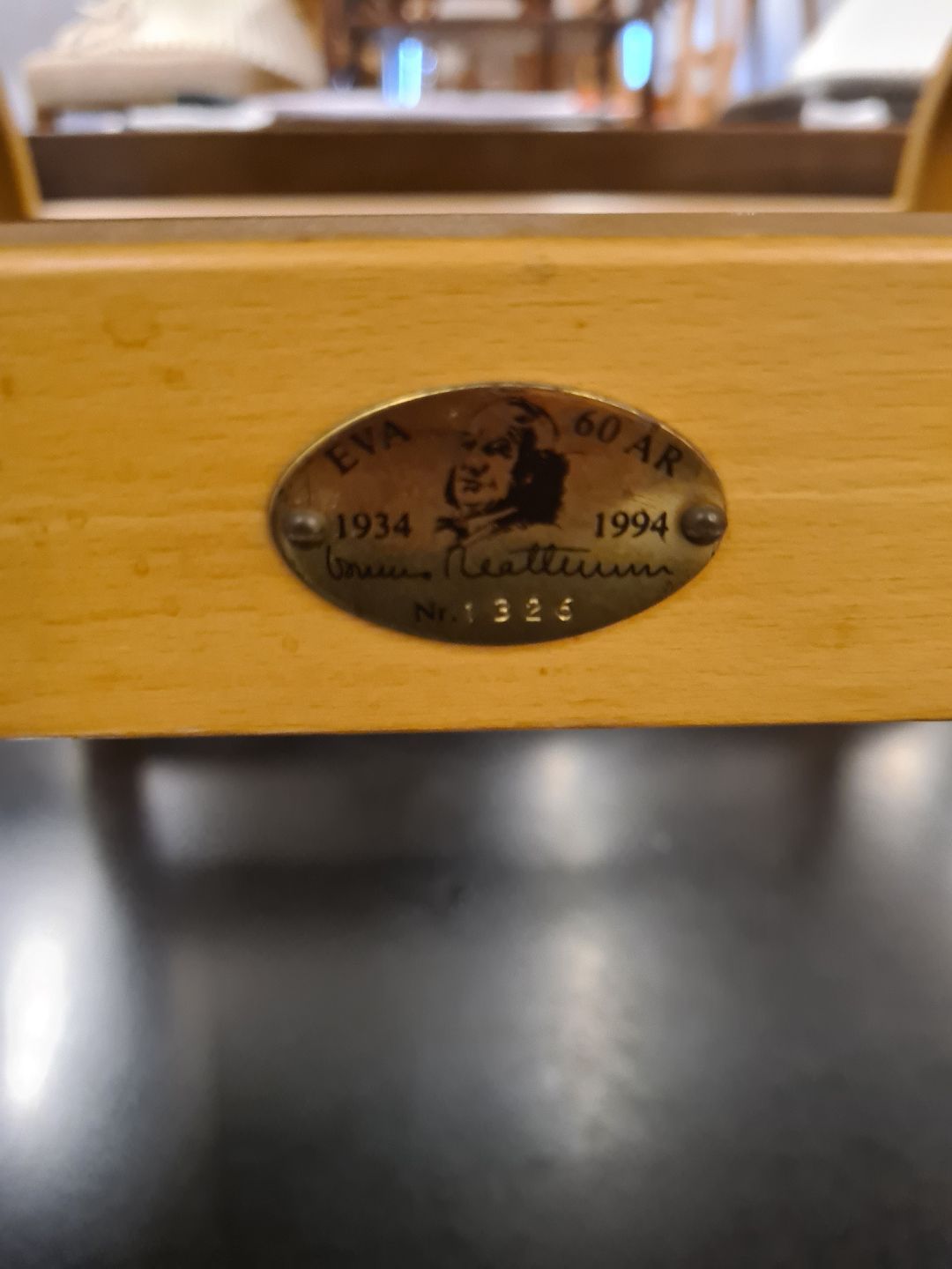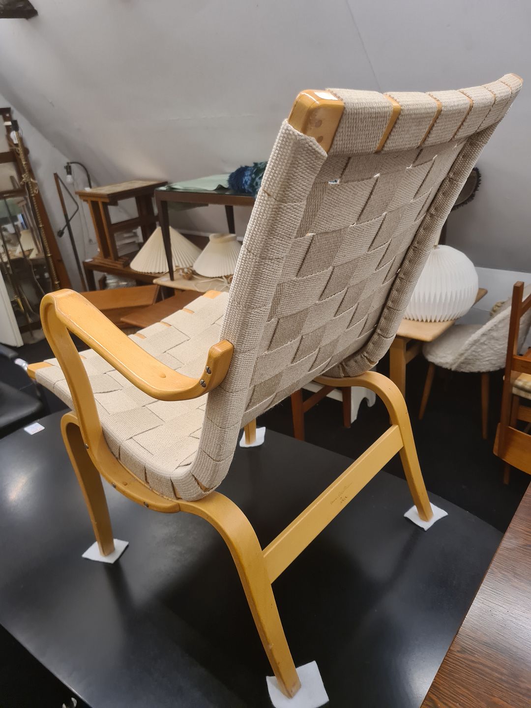 Beskrivelse: Evastol designet af Bruno Mathsson. Her en model fra 1994 i bøg og kanvasflet. Fremstår god og stabil med enkelte brugsspor på kanvas. (Billede)