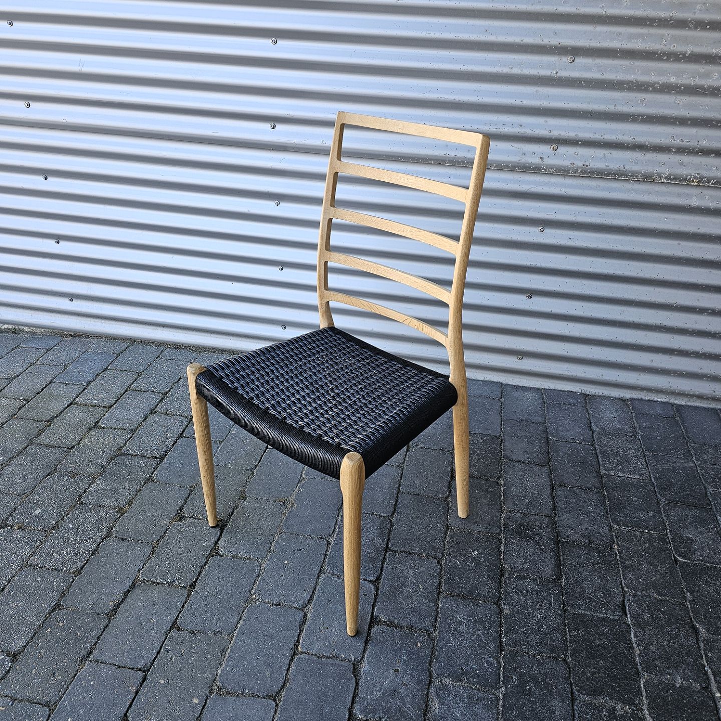 Beskrivelse: Niels Ole Møller spisebordsstol i eg med sort flettet sæde