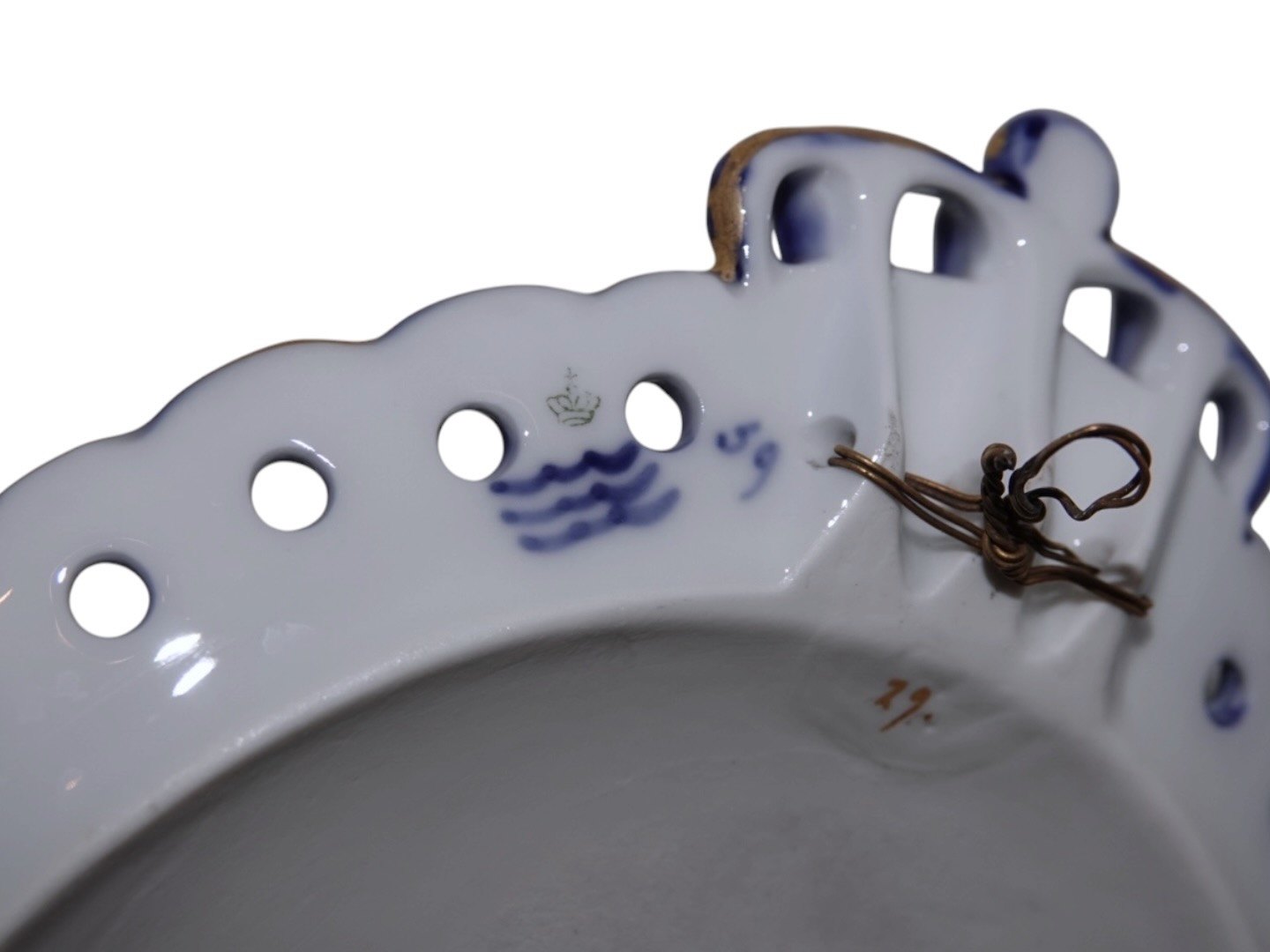 Beskrivelse: Royal Copenhagen Mindeplatte fra 1898 med guldkant.