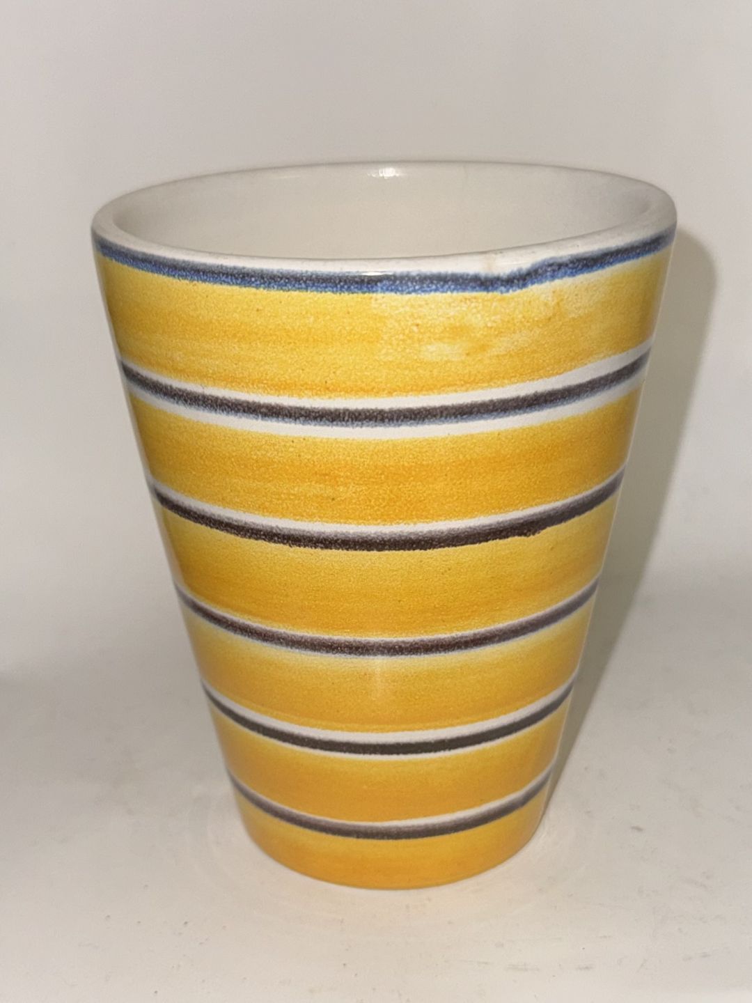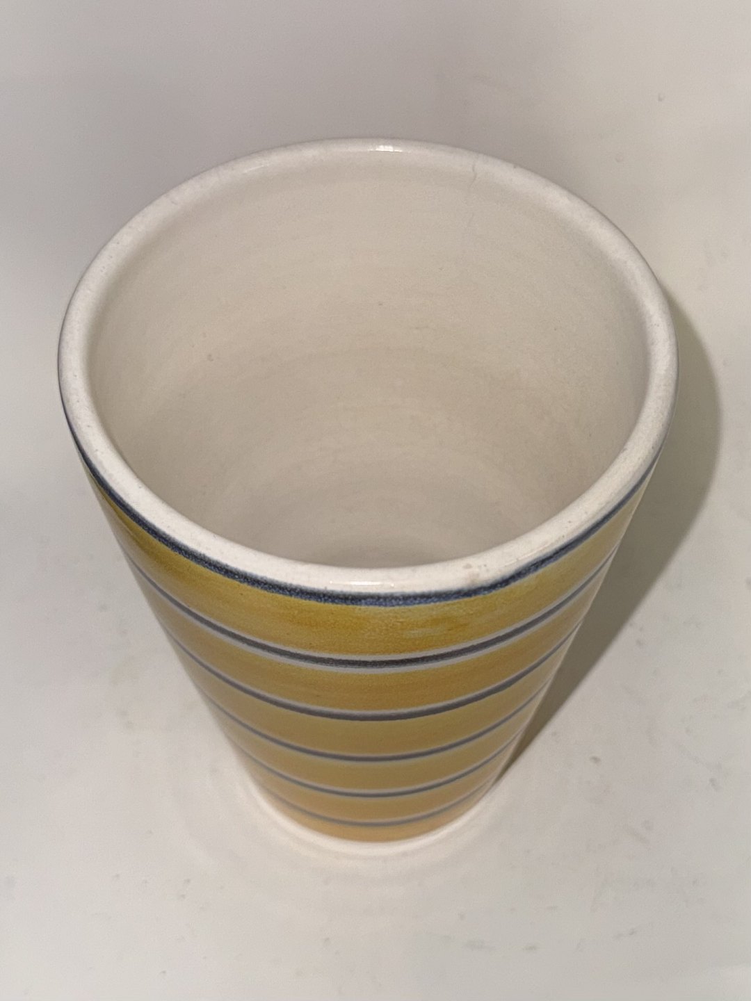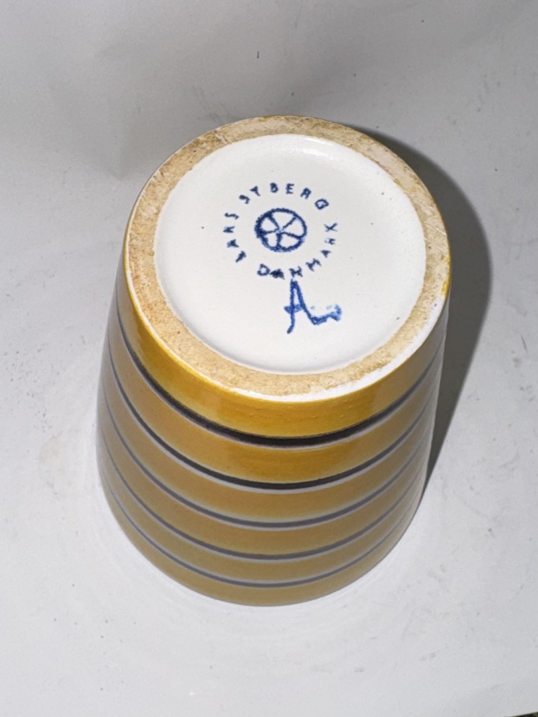 Beskrivelse: GUL MED STRIBER: Bæger eller vase i keramik fra Lars Syberg fabrikken. Formodes fremstillet i 1960’erne. I god stand. Fabriksmærket på bunden. Mål: 12,3 cm Ø. 9,8 cm