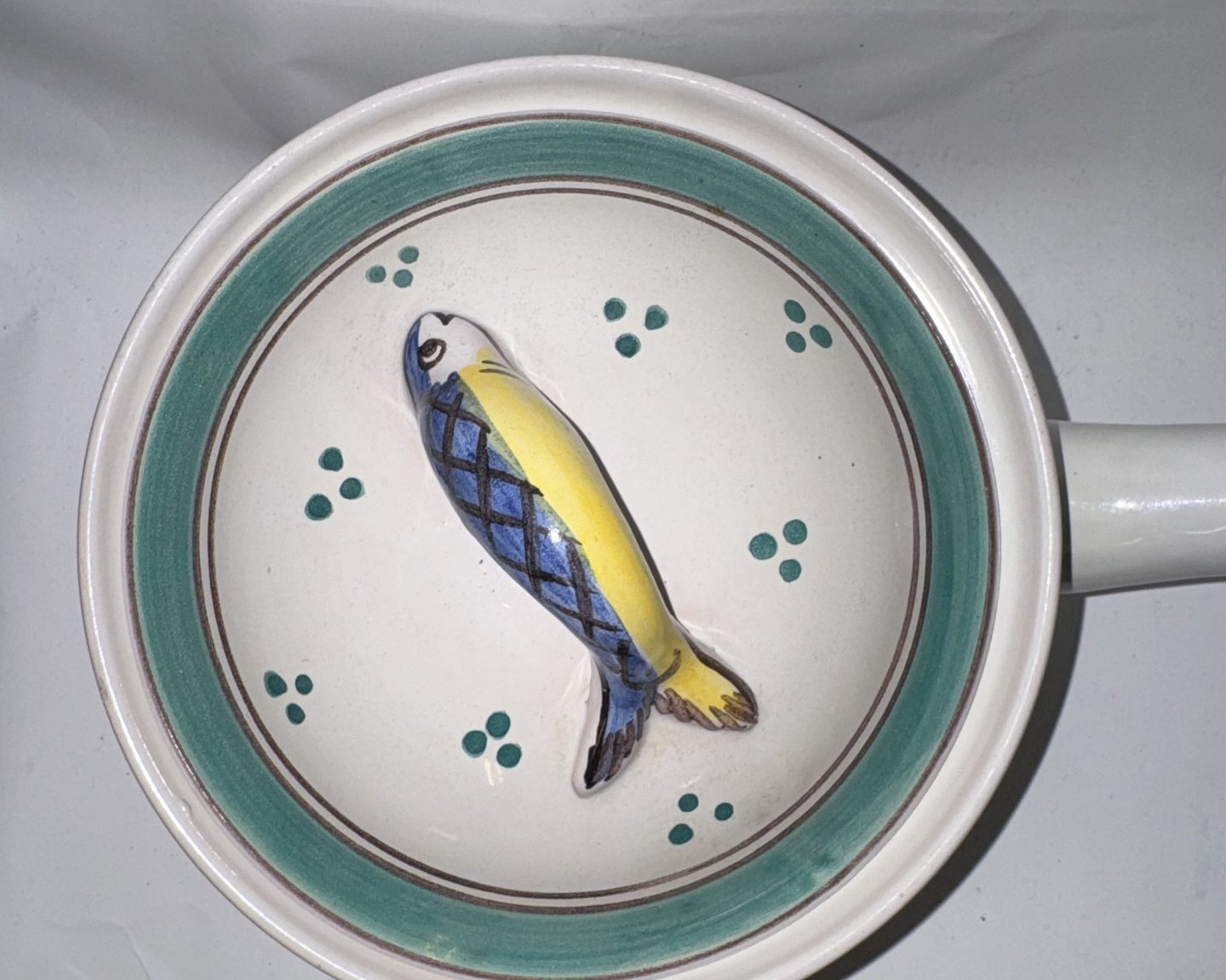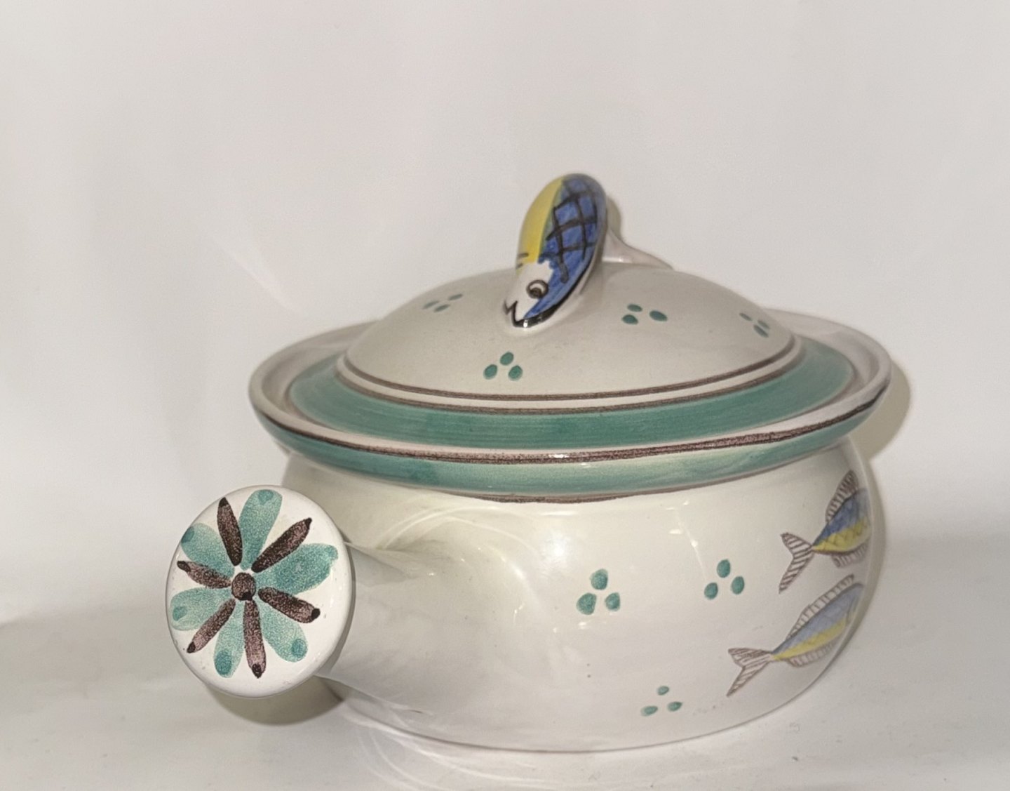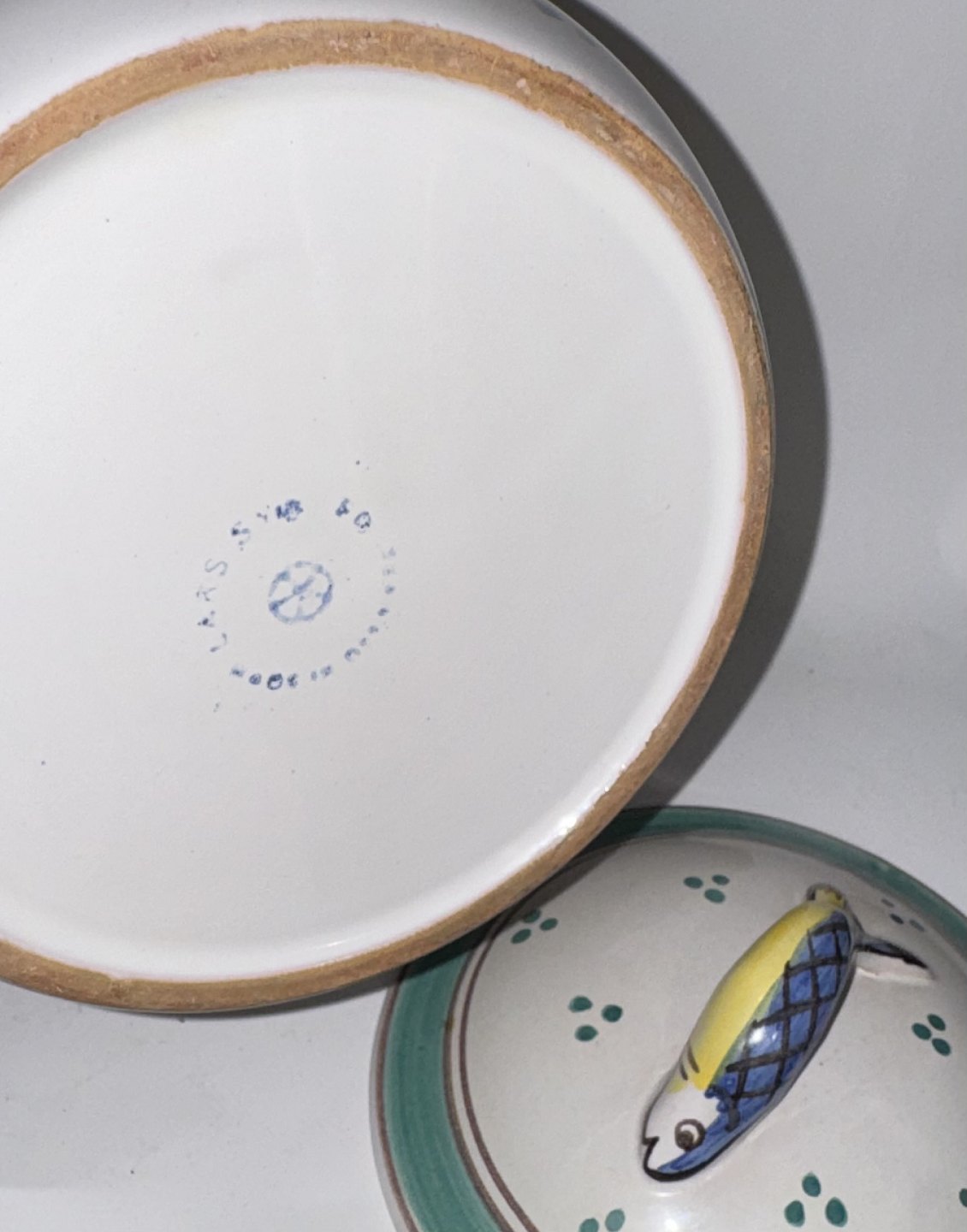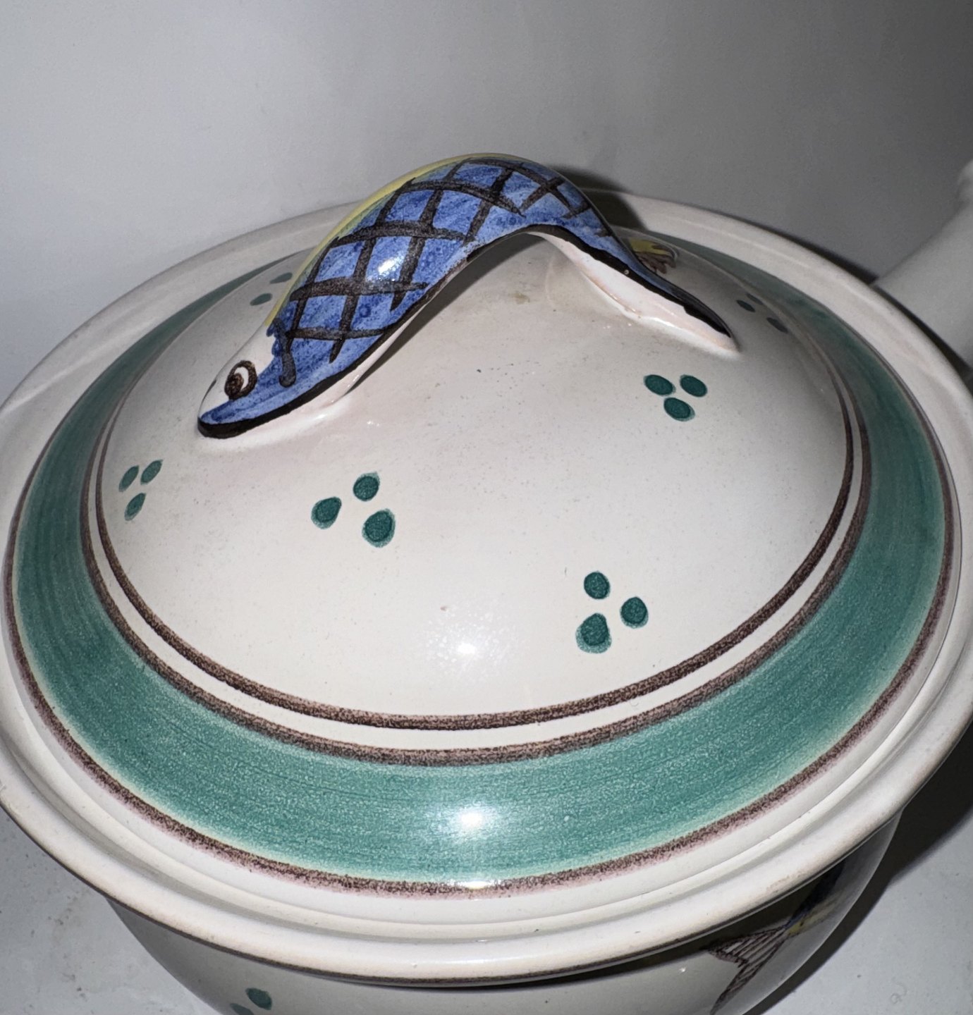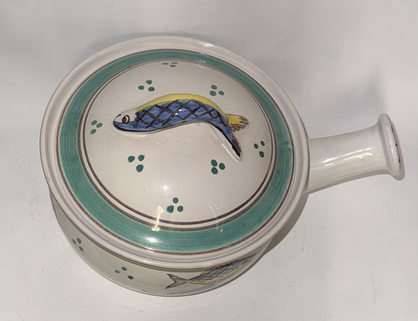 Beskrivelse: SKÅL TIL JULESILD, påskesild og hverdagssild - Skål med låg og håndtag i keramik fra Lars Syberg keramik værksted. Dekoreret med bemalede sild og figur af sild som lågknop. Fabriksmærket på bunden. Mål: H. 13 cm L. 23,5 cm d. 16,8 cm