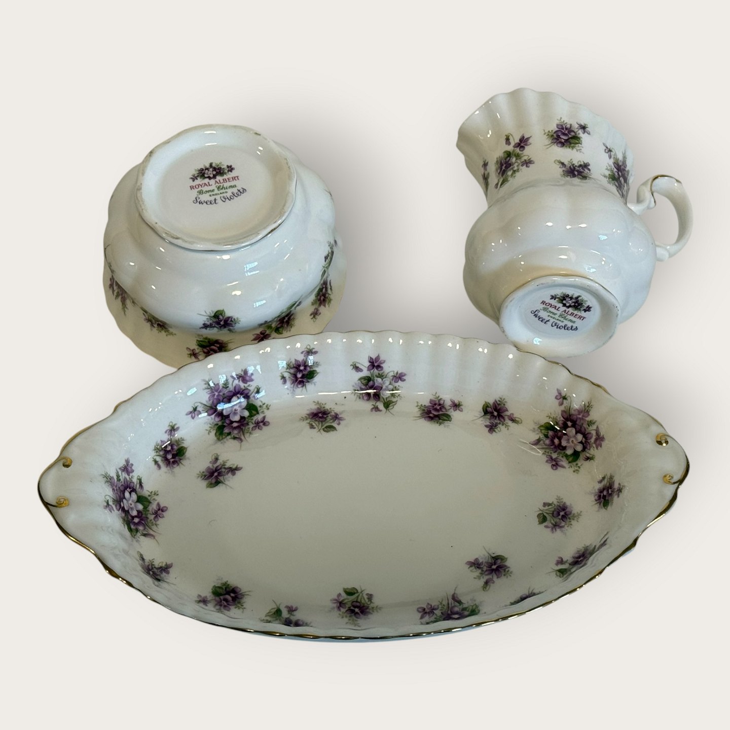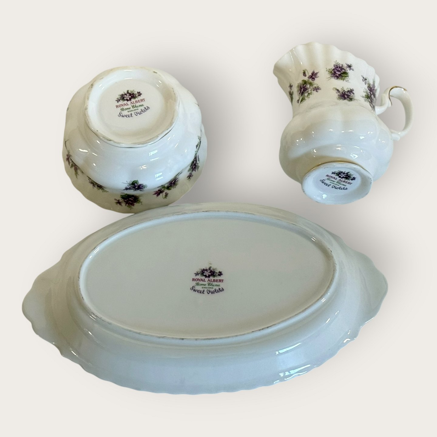 Beskrivelse: Royal Albert, Bone China, Sweet violets, Mark viol, Sukker, flødesæt på lille bakke, bakken måler 22x13cm *Perfekt stand*