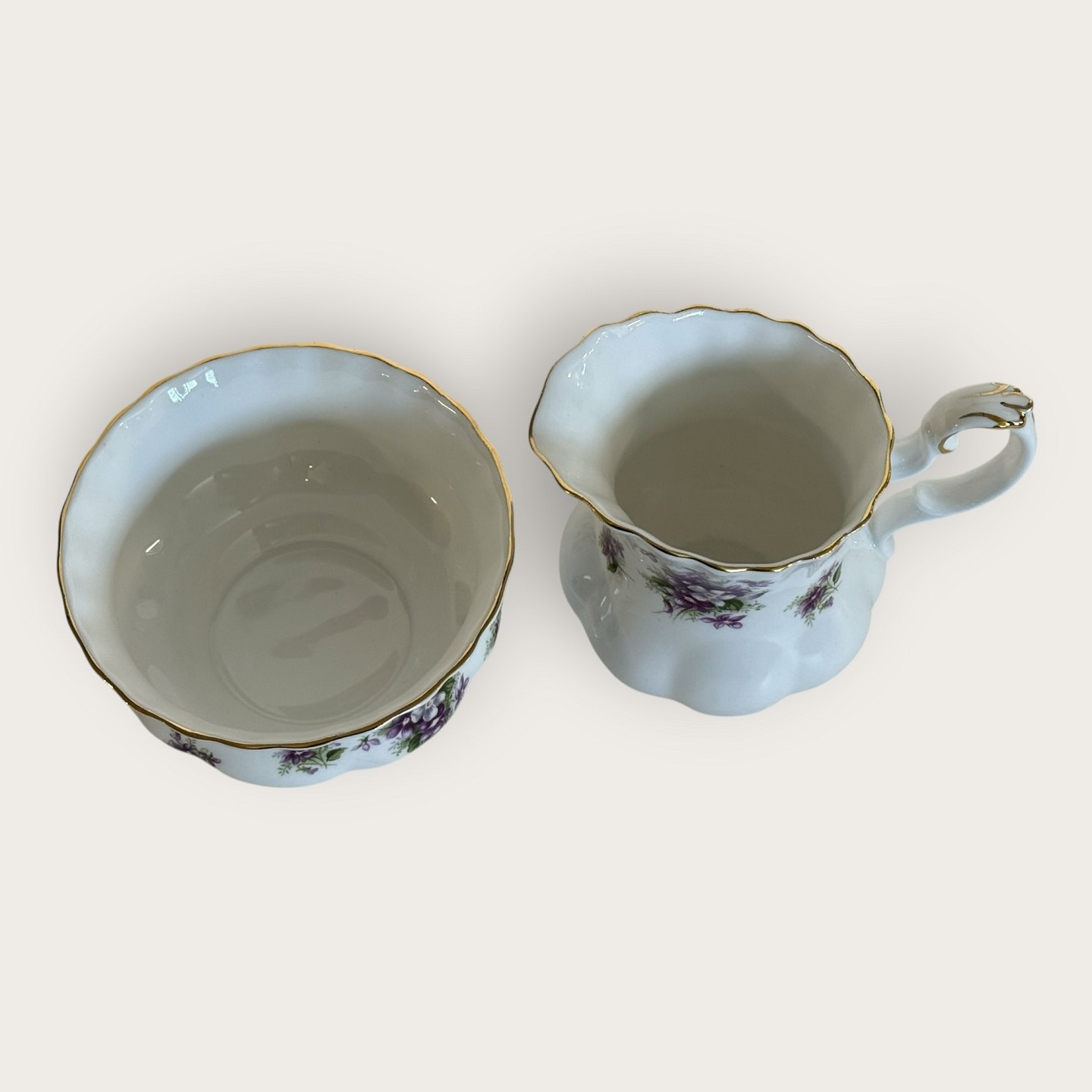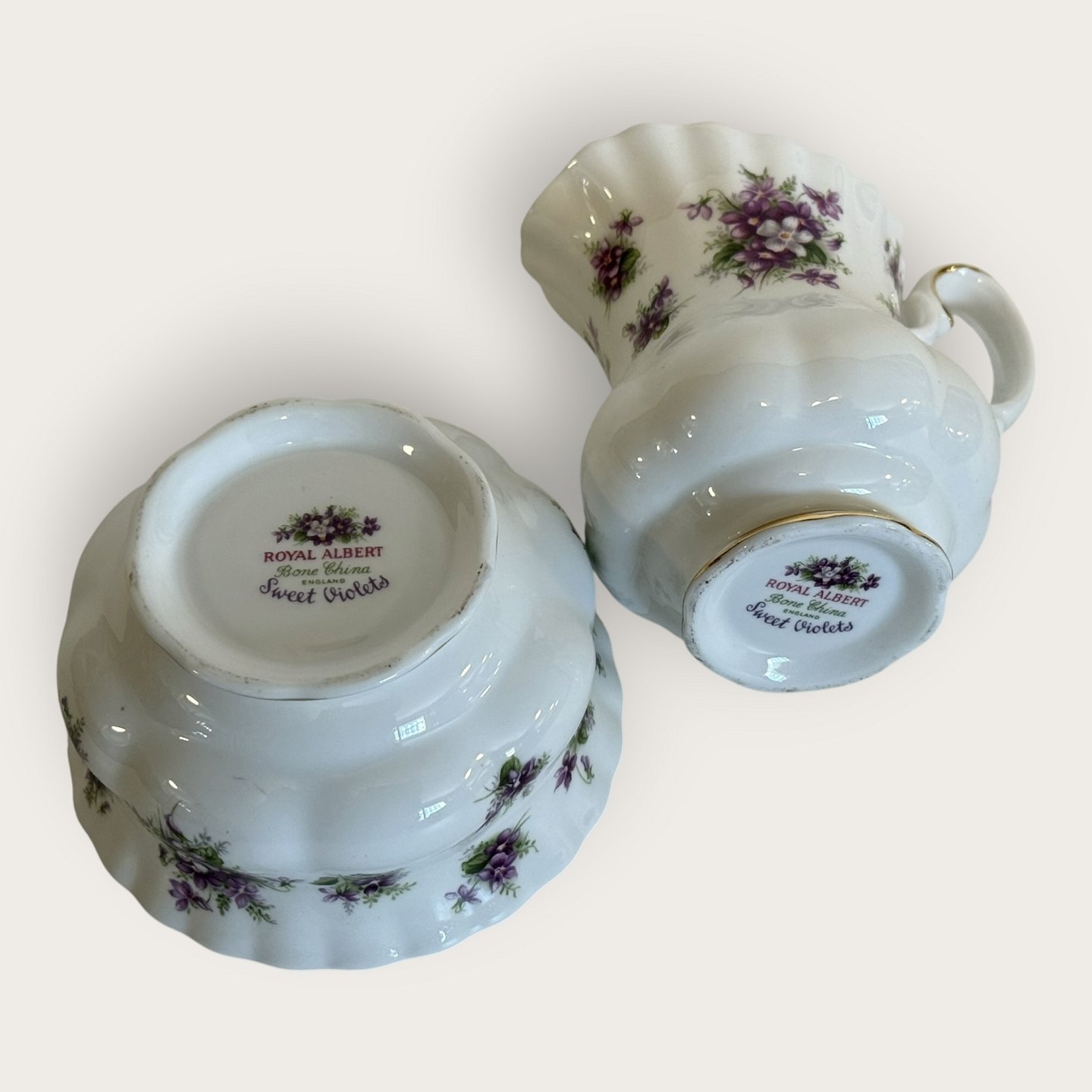Beskrivelse: Royal Albert, Bone China, Sweet violets, Mark viol, Sukker, flødesæt, diameter sukkerskål 9cm, flødekande højde 9cm *Perfekt stand*