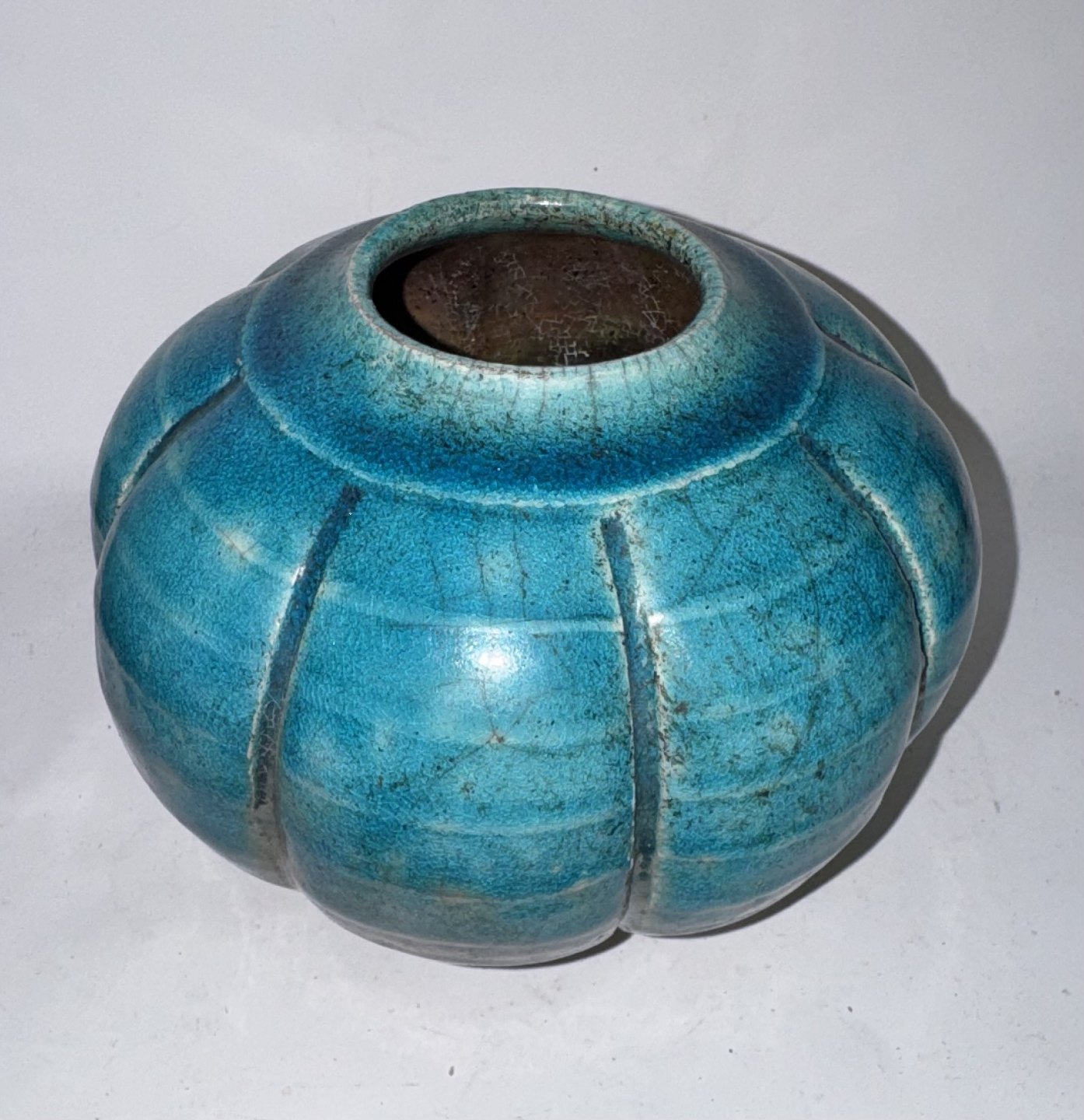 Beskrivelse: Turkis vase i raku fra FYRKAT. I god stand. Fabriksmærket på bunden. Mål: H. 10,2 cm Ø. 14 cm