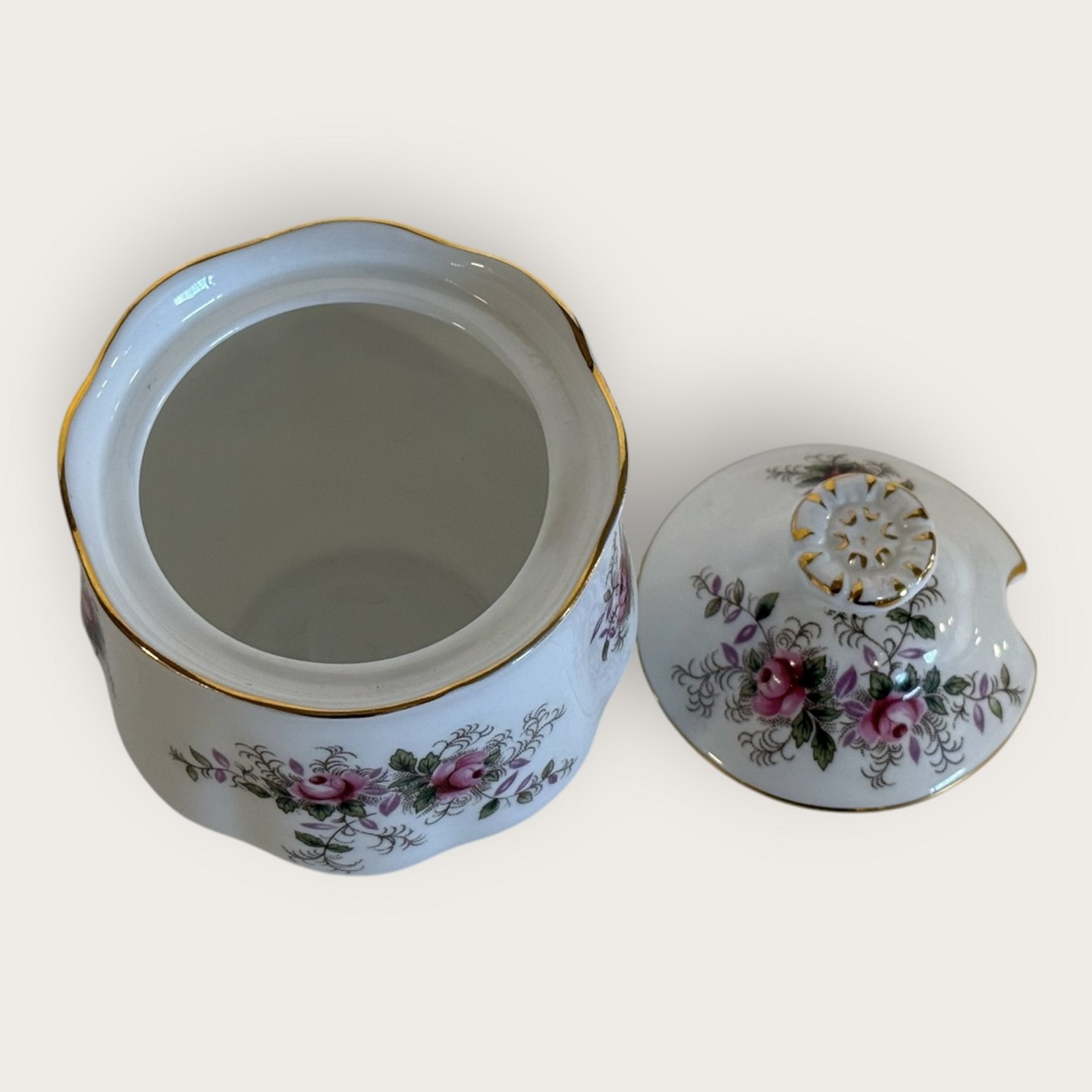 Beskrivelse: Royal Albert, Bone China, Lavender Rose, Marmeladekrukke med låg, højde 10cm *Perfekt stand*