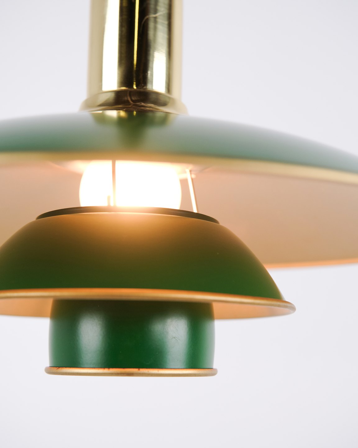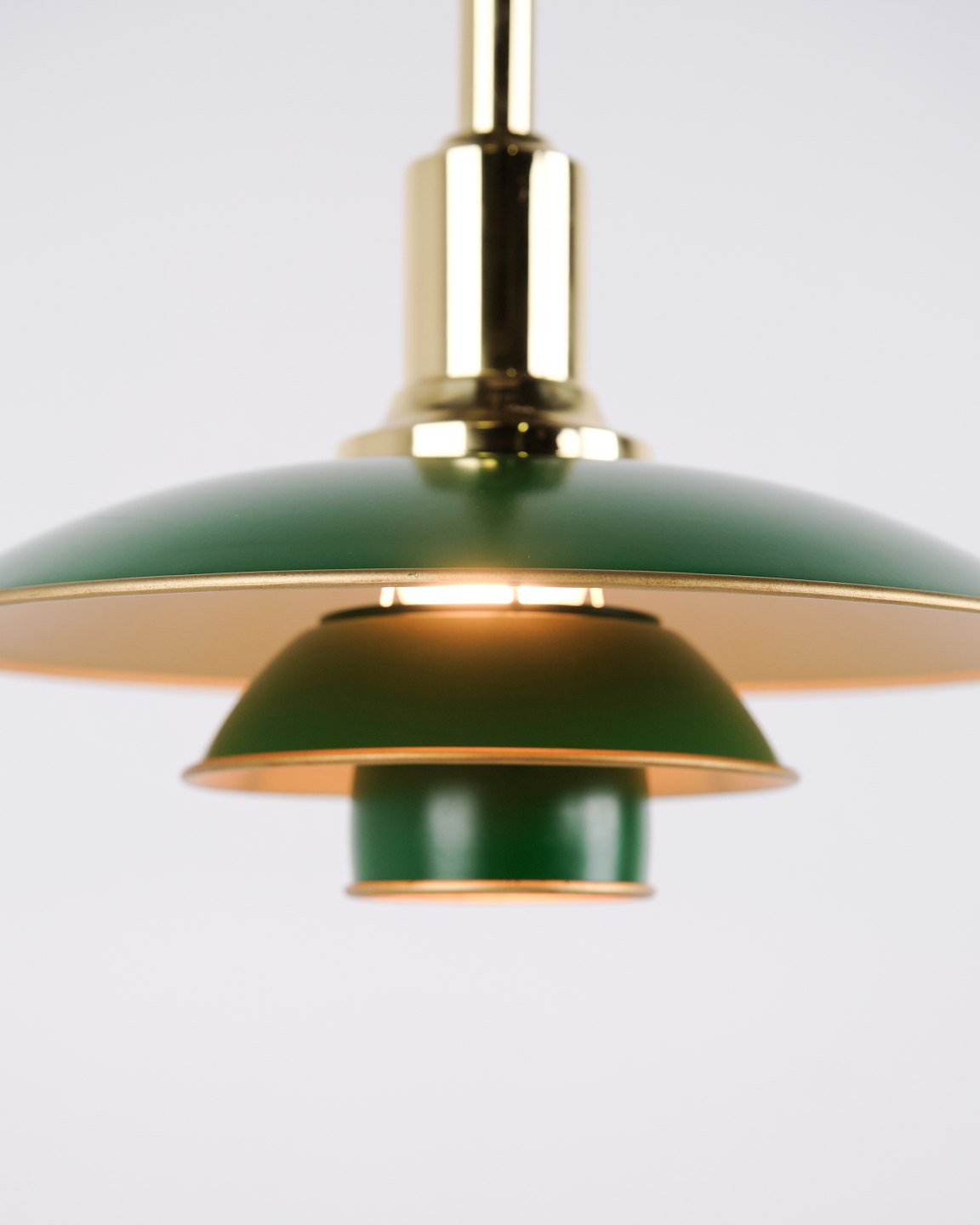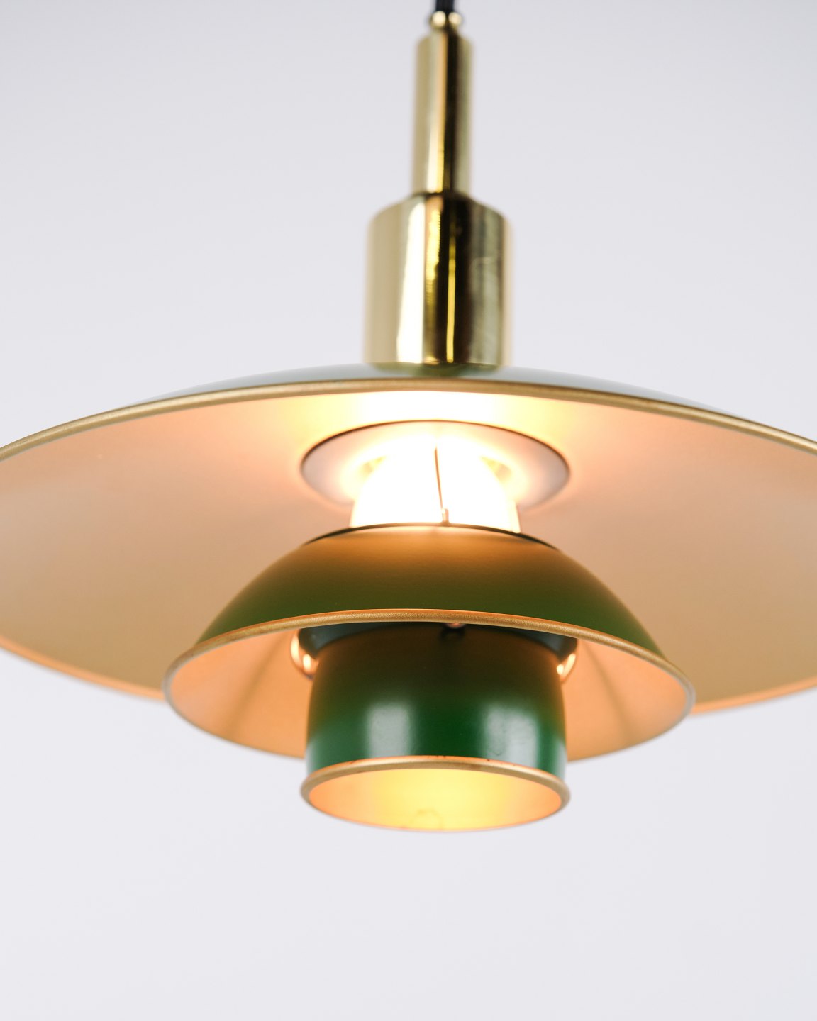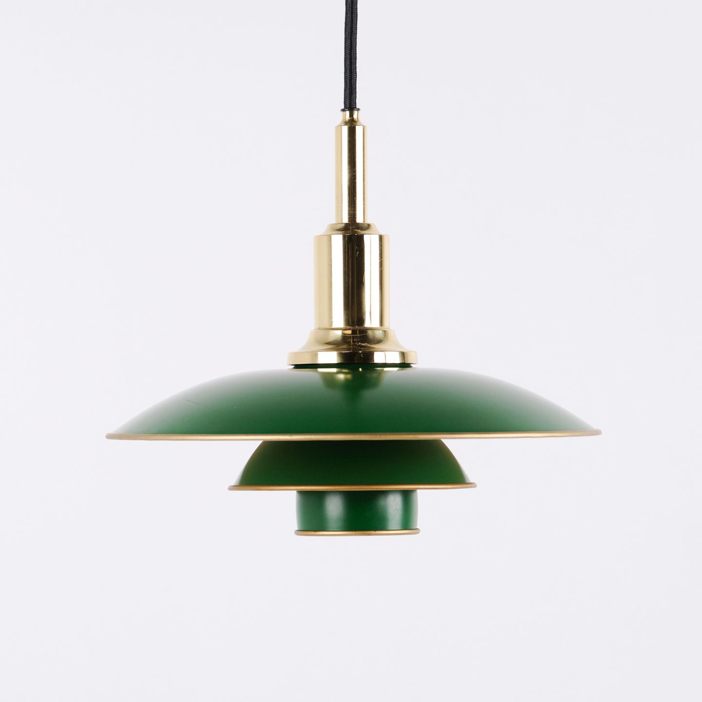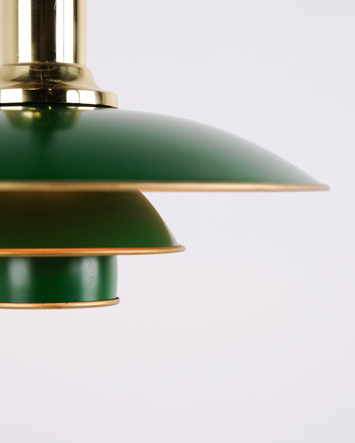 Beskrivelse: PH 3/2 pendel designet af Poul Henningsen og udgivet som jubilæumsudgave i 1996 af Louis Poulsen. Lampen er udført i messing med grønne metalskærme, hvilket giver modellen et markant og klassisk udtryk. PH 3/2 er en af Poul Henningsens kendte treskærmslamper, udviklet med fokus på blændfrit og behageligt lys. Jubilæumsudgaven blev kun produceret i en begrænset periode og findes også i en variant med røde metalskærme.